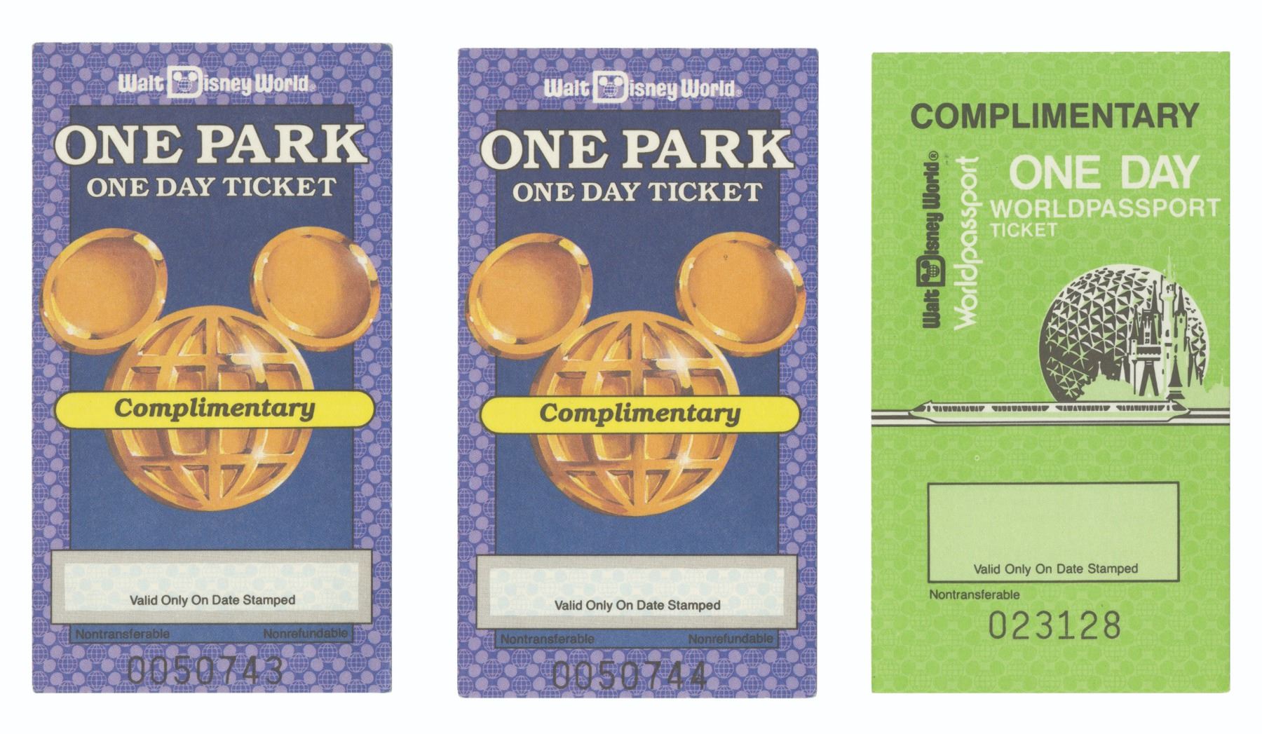 (Walt Disney World, 1983-89) A group of (3) complimentary one day tickets for Walt Disney World from 1983 and 1989. The passport from 1983 allowed admission to the Magic Kingdom and Epcot, and both passports from 1989 allowed admission to the Disney-MGM Studios as well. The tickets measure approximately 4.25"x2.5" each and are in fine condition with very minor wear.