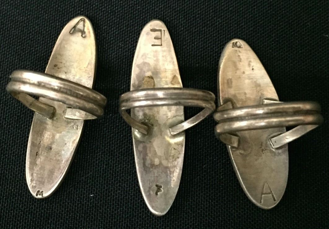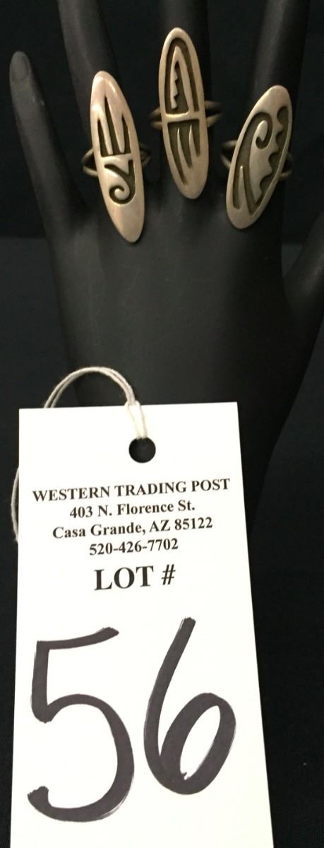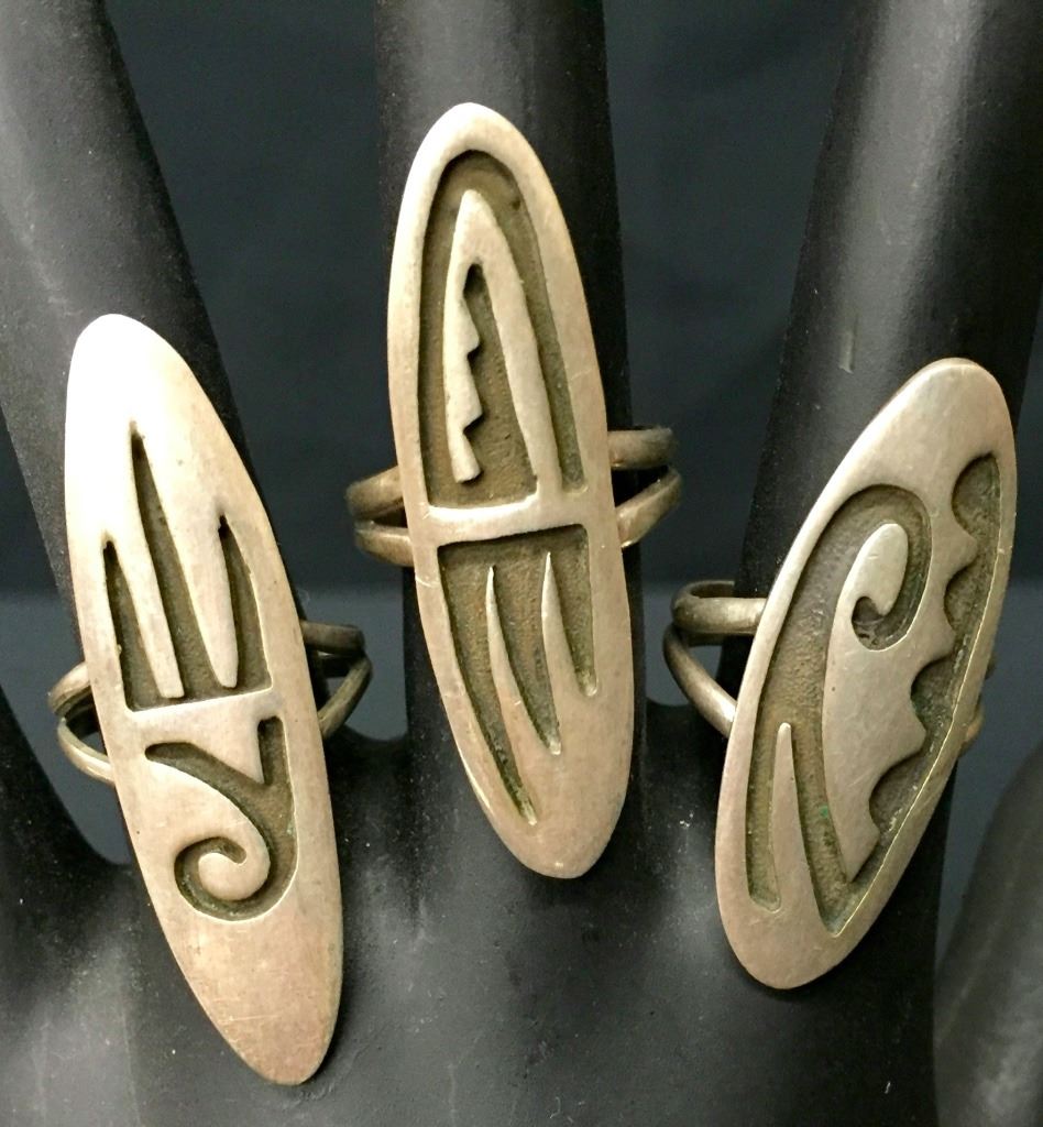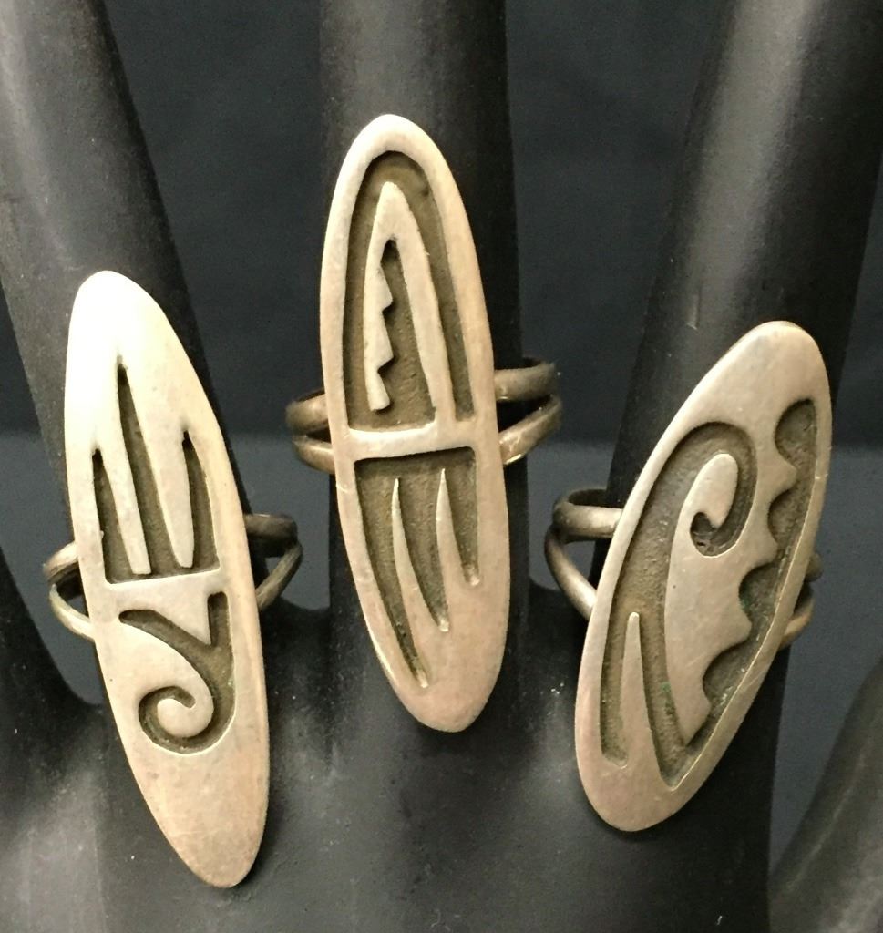 These 3 rings are probably Navajo made (but Hopi style). All are sterling. Sizes are 5, 5.5 and 6. Collectively they weigh 17.1 g. Please look closely at pics as they are an important part of our description. Shipping: There will be a $5 handling / packaging fee for shipping this lot. The actual cost of postage will be added on top of that.