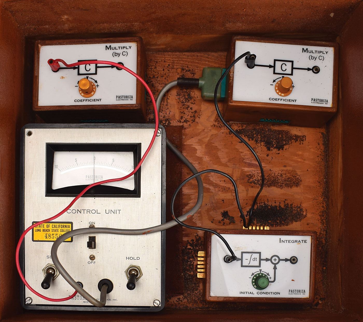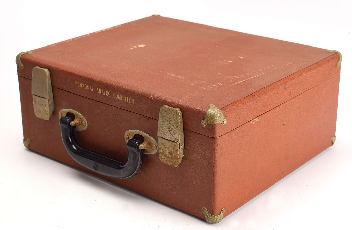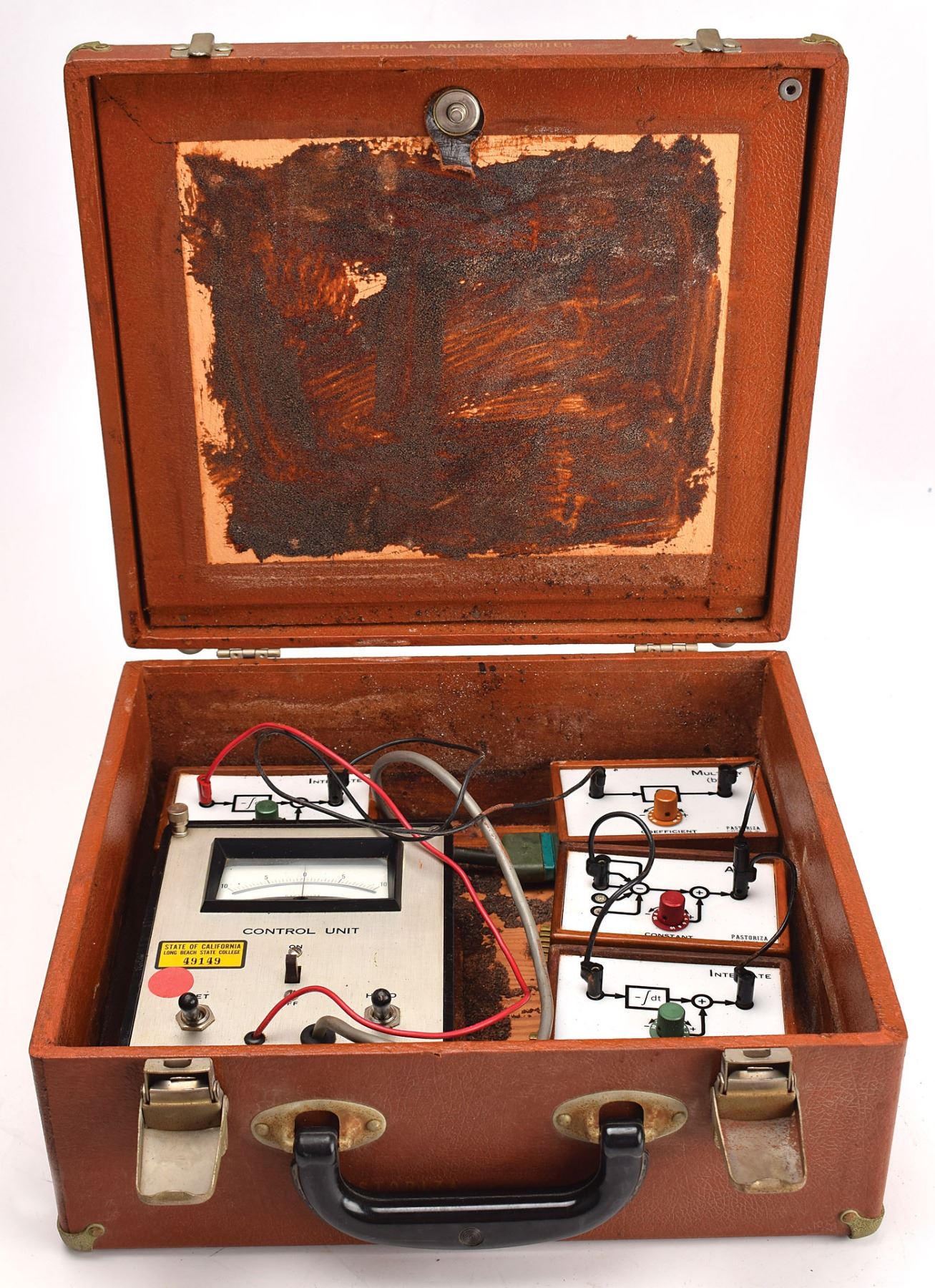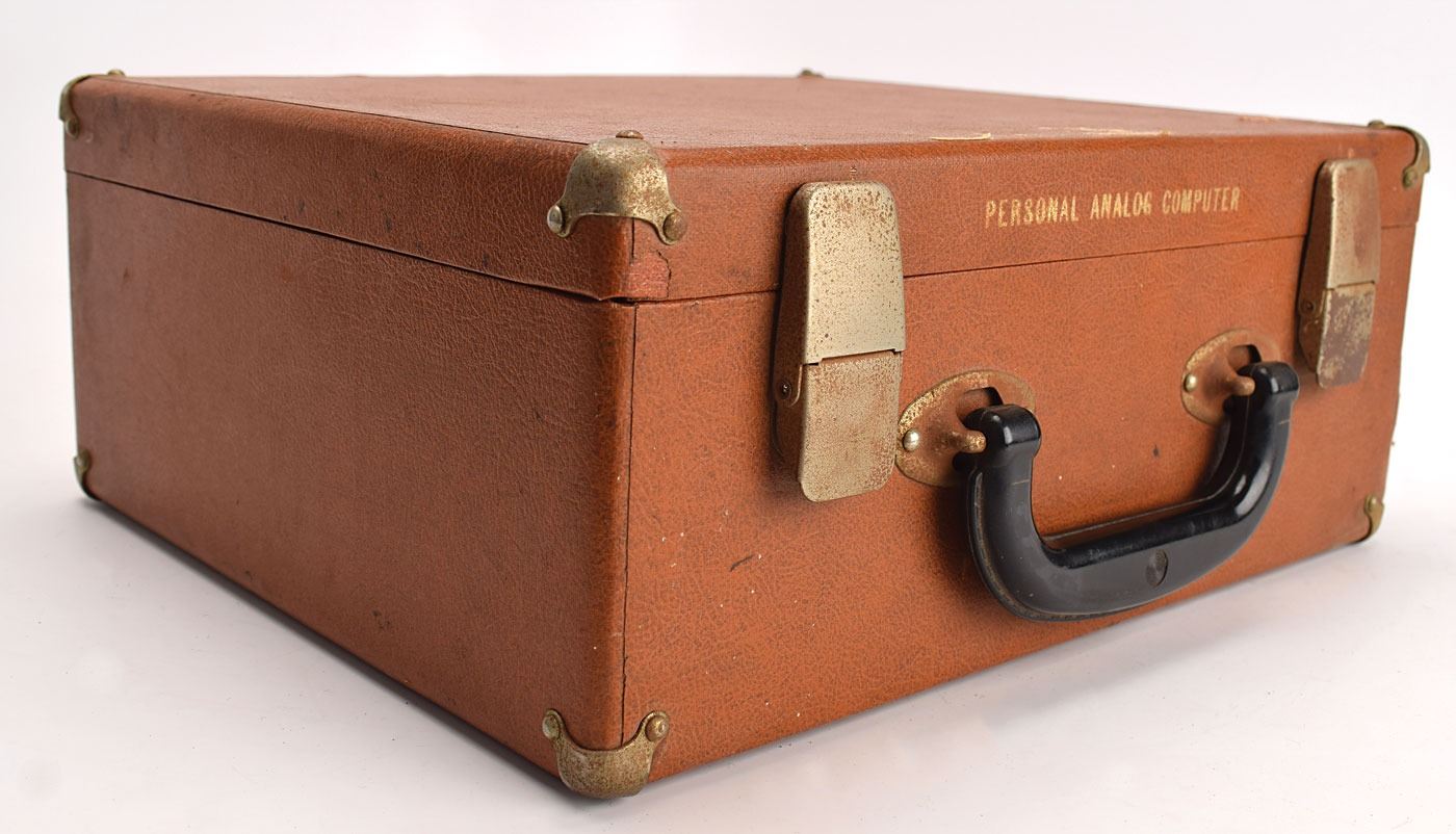 Group of three circa 1960s personal analog computers in brown carrying cases, manufactured by Pastoriza Electronics in Boston, with each case containing a "Control Unit" plus other modules, marked "Integrate" (5), "Multiply" (5), and "Add" (1). In overall very good condition, with adhesive residue inside the cases. Accompanied by four unrelated vintage computer boards and a catalog for The Computer Museum Store. The Pastoriza Personal Analog computer was originally designed in 1962–63 to be used by students at the Case Institute of Technology. The modular units allowed students to configure the computer to their own preference. Pastoriza Research was bought out by Analog Devices, Inc. in 1969.