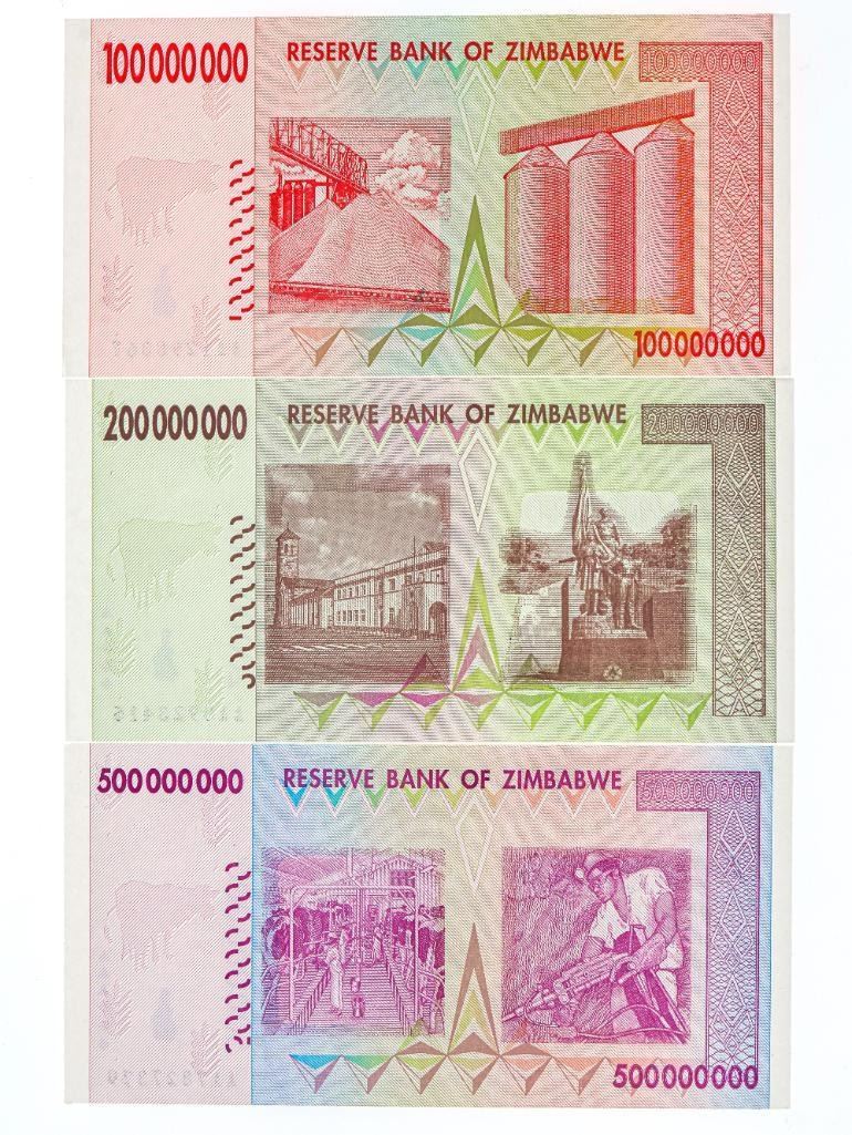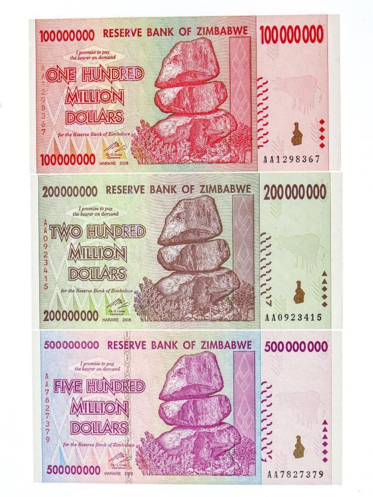 Group of 3 Reserve Bank of Zimbabwe - One Hundred,Two hundred & Five Hundred Million Dollar Notes - UNC w/ Serial Numbers -2008