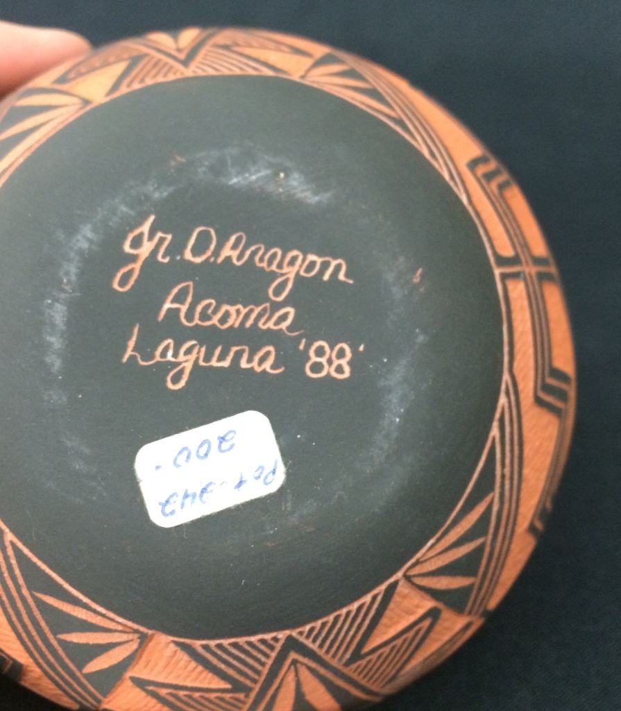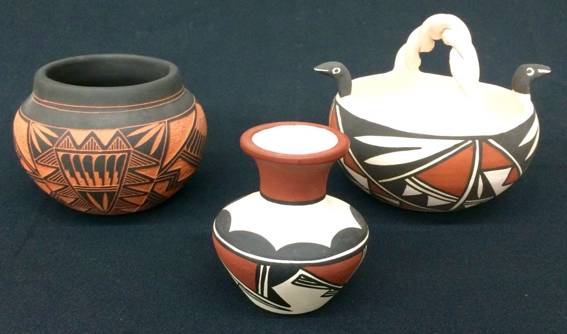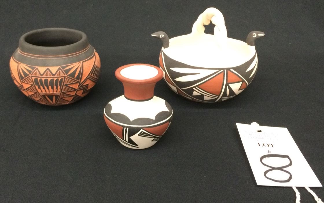 You get 3 pieces of original Acoma pottery for 1 money in this lot! All are signed. They measure from 3” to 4.5” tall. The black and orange pot is nicely etched. All are in very nice condition.