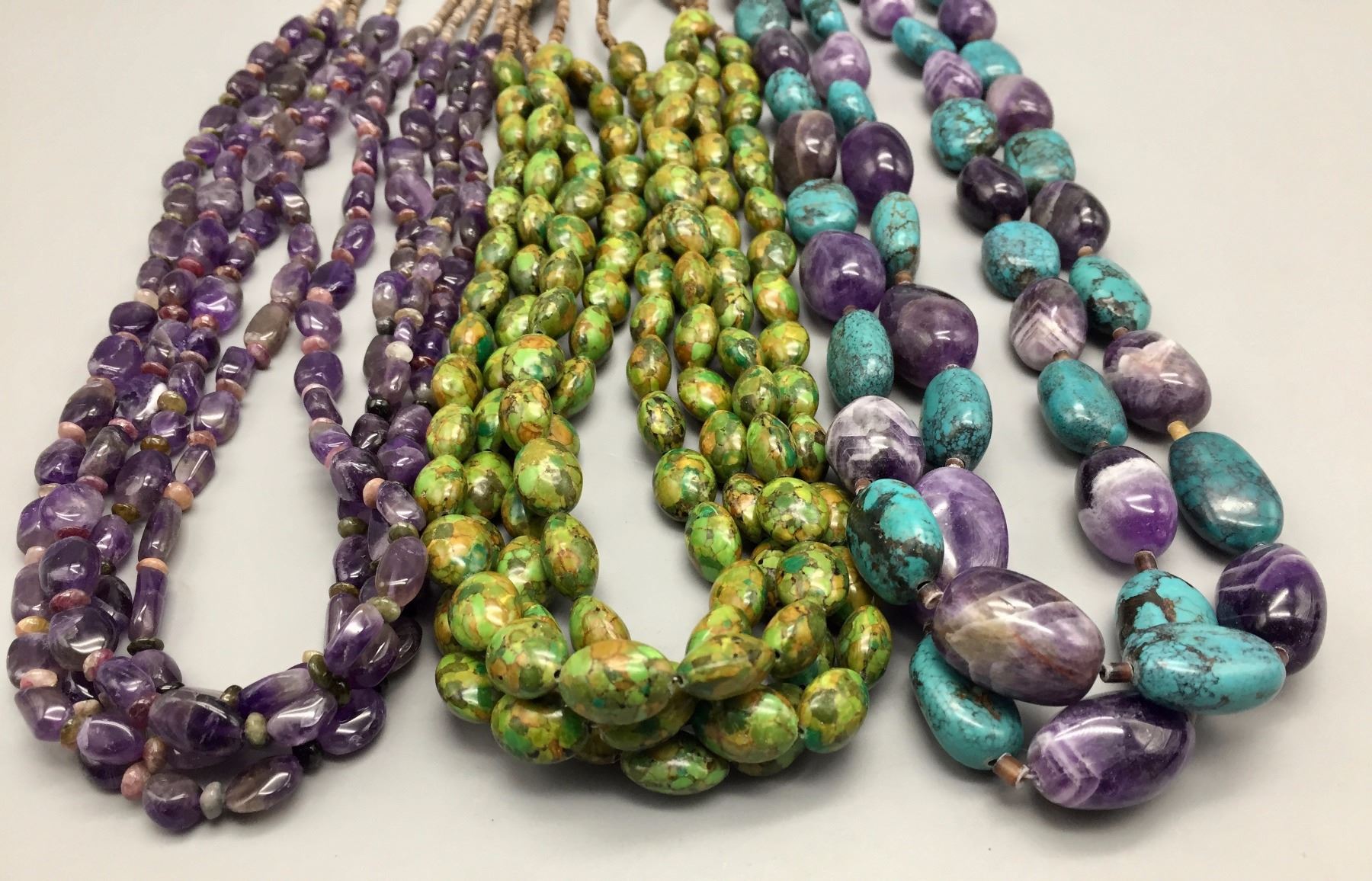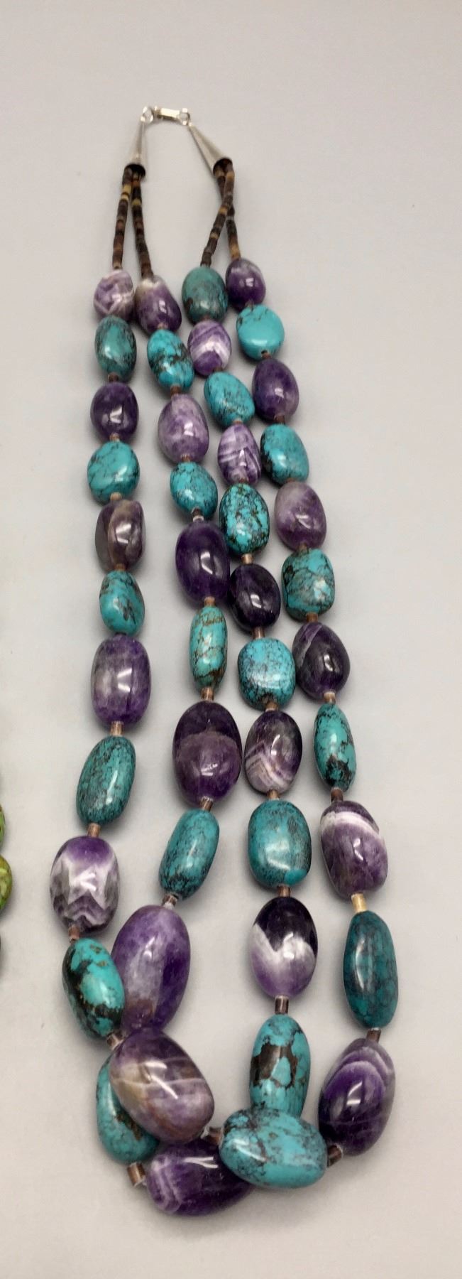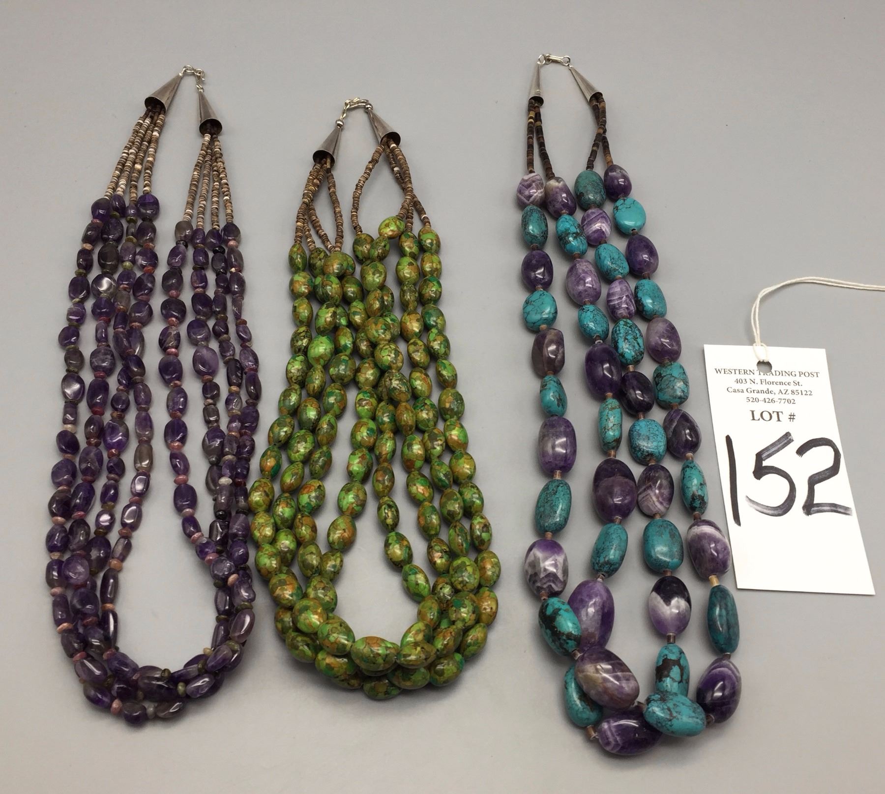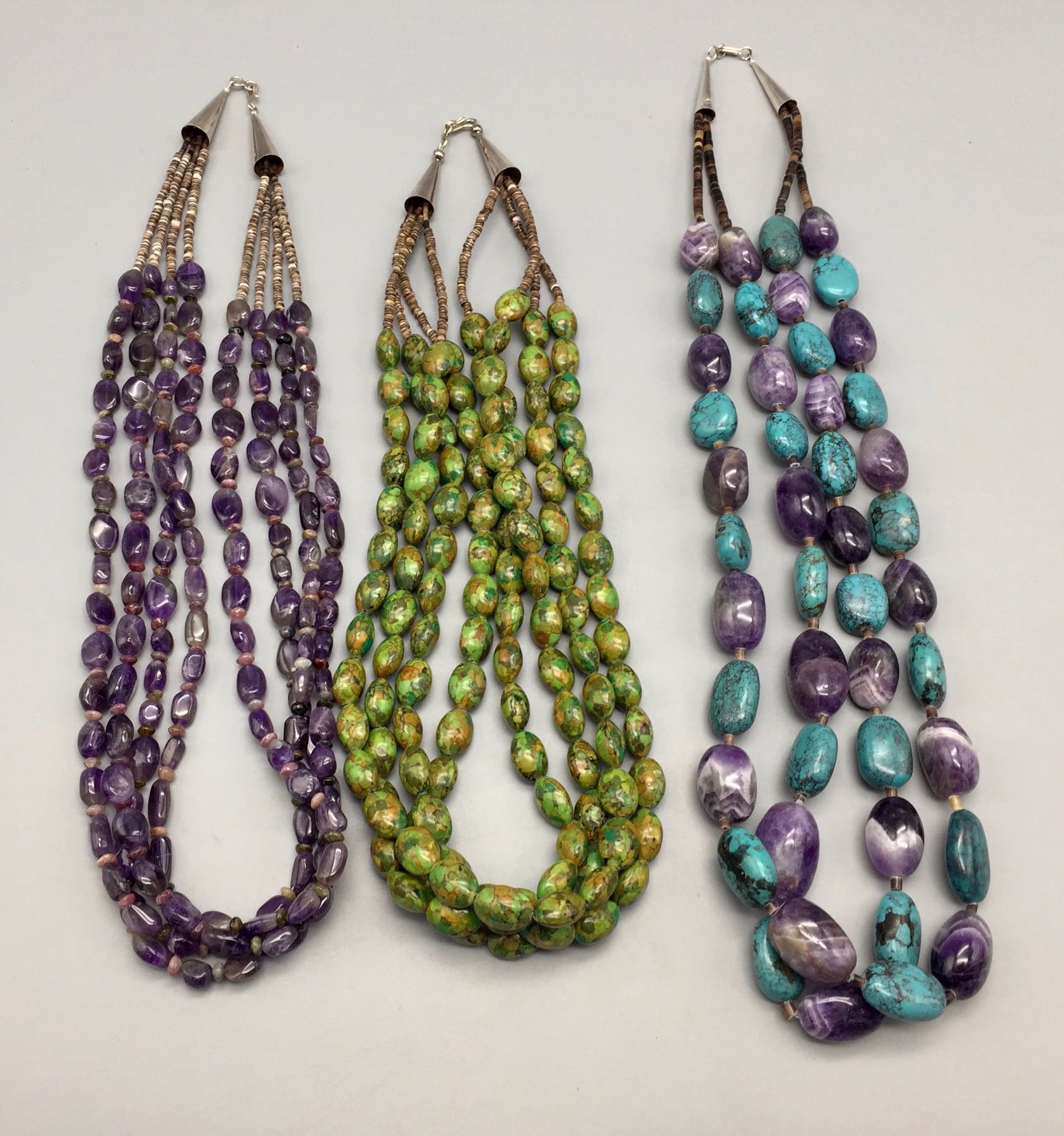 Maker: Unknown makers. Approx. Age: Circa 1980s. Size: Necklaces fit 22” - 24” around the neck. Additional Info: 3 necklaces included. All have sterling findings and various gemstones. Condition: Good for their age, normal wear expected. Please look closely at the pictures - they are an important part of our description. Shipping: There will be a $5 handling / packaging fee for shipping this lot. The actual cost of postage will be added on top of that.