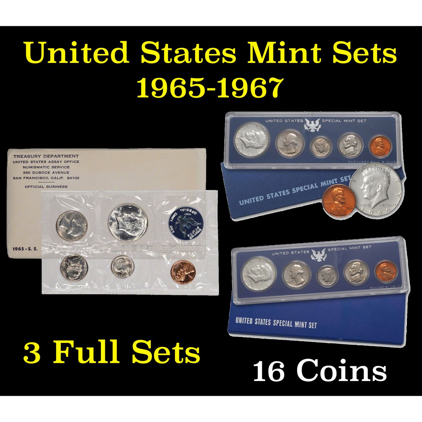 Group of 3 Special Mint Sets 1965-1967 20 coins. In 1964, just when the mint was removing 90% silver coins from circulation, and the us was having a coin shortage, the Mint announced that beginning in 1965, no Proof Sets, or Mint Sets would be produced, Instead they would be making a Special Mint Set. Special Mint Set coins were not proofs, and were not uncirculated, Mint State pieces. Dies for the coins were over polished, while the planchet themselves were not polished. The resulting SMS coins have a brilliant, proof like appearance, much nicer than the run-of-the-mill circulation coins. In 1965 these sets were released in the Traditional Mint Cellophane and White Envelope and in 1966 and 1967 they were packaged in hard, pale blue plastic holders. Note, the set contains a 40% Half Dollar.