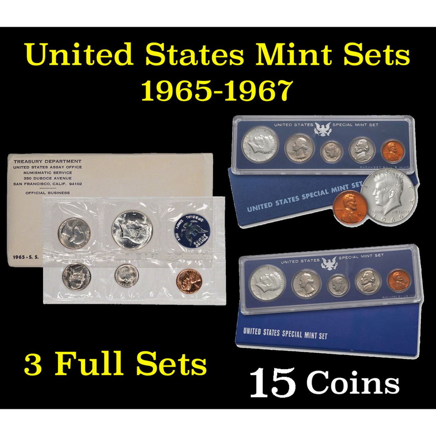 Group of 3 Special Mint Sets 1965-1967 15 coins. In 1964, just when the mint was removing 90% silver coins from circulation, and the us was having a coin shortage, the Mint announced that beginning in 1965, no Proof Sets, or Mint Sets would be produced, Instead they would be making a Special Mint Set. Special Mint Set coins were not proofs, and were not uncirculated, Mint State pieces. Dies for the coins were over polished, while the planchet themselves were not polished. The resulting SMS coins have a brilliant, proof like appearance, much nicer than the run-of-the-mill circulation coins. In 1965 these sets were released in the Traditional Mint Cellophane and White Envelope and in 1966 and 1967 they were packaged in hard, pale blue plastic holders. Note, the set contains a 40% Half Dollar.