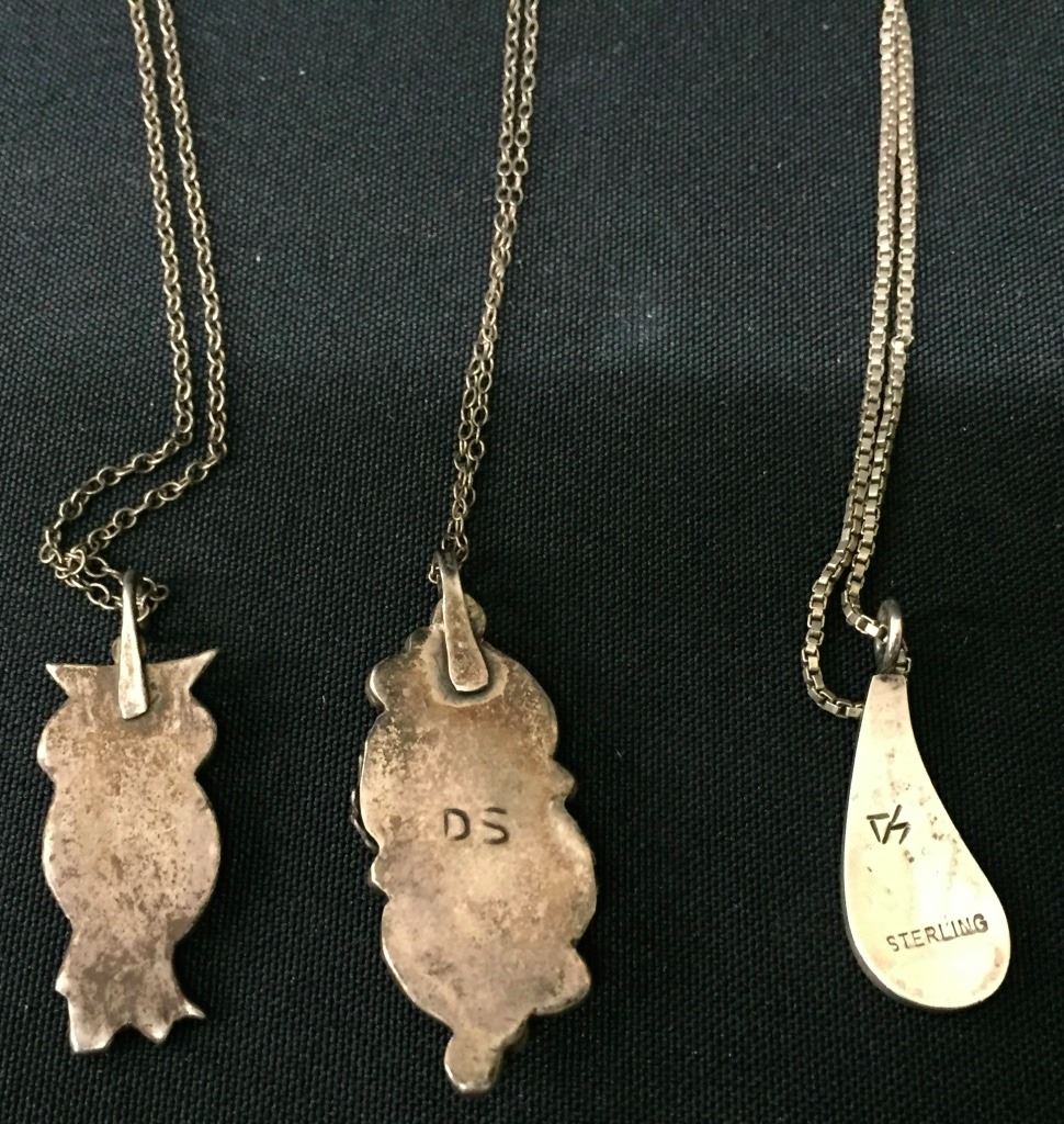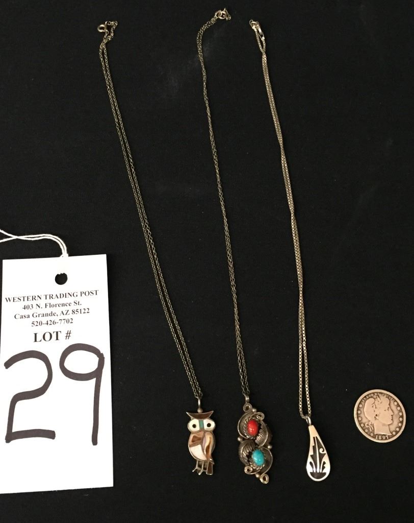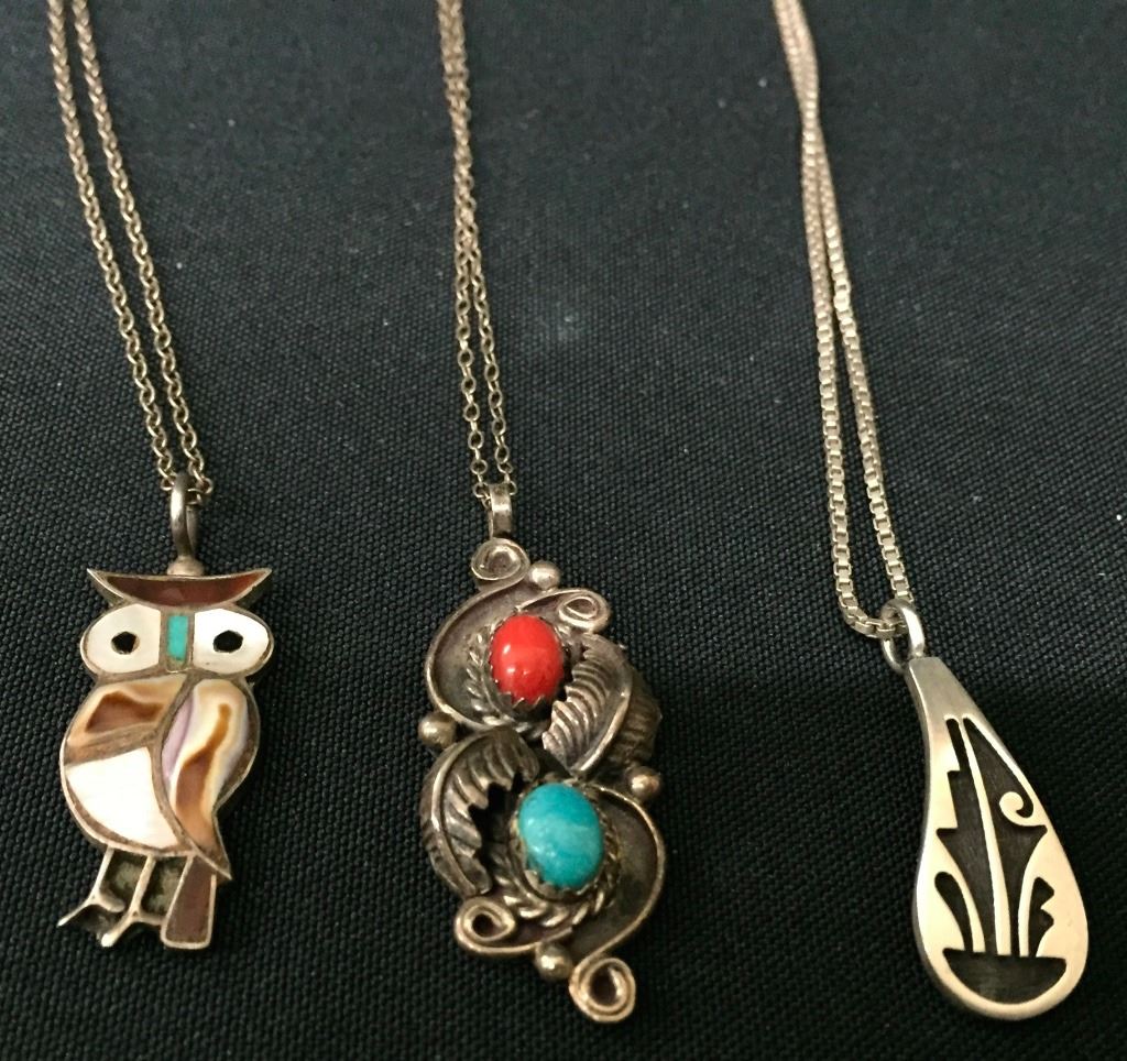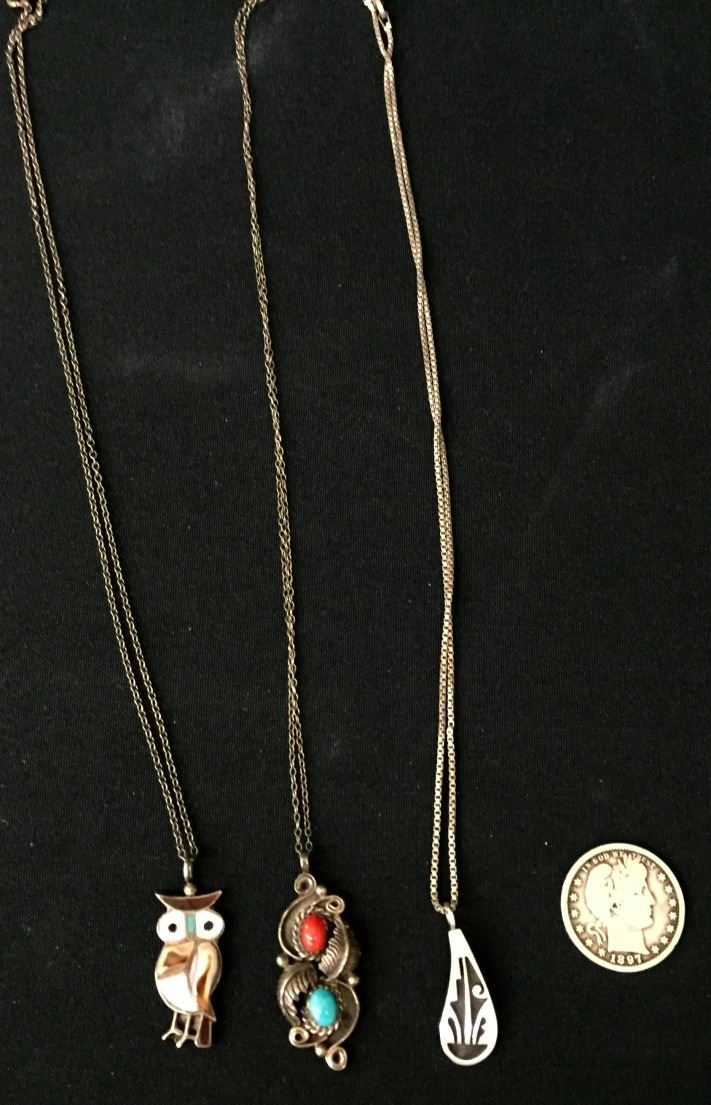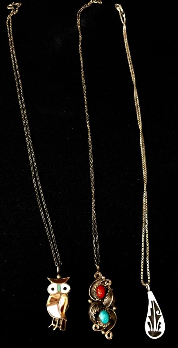 There is a vintage Zuni, a Navajo, and a Hopi necklace. Each is on a sterling chain. Collectively they weigh 15.6 g. Good condition. Please look closely at the pics as they are an important part of our description. Shipping: There will be a $5 handling / packaging fee for shipping this lot. The actual cost of postage will be added on top of that.