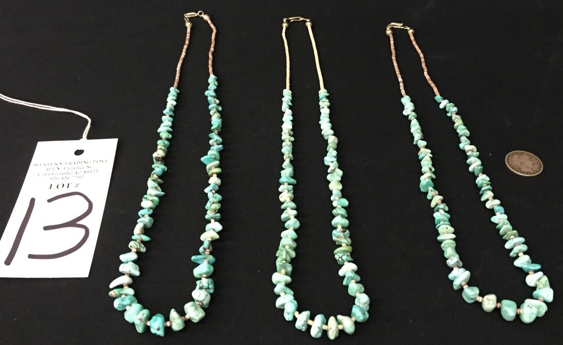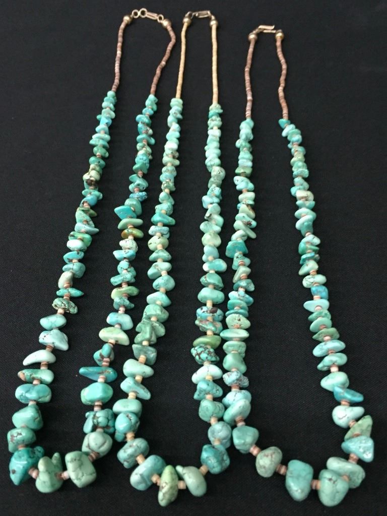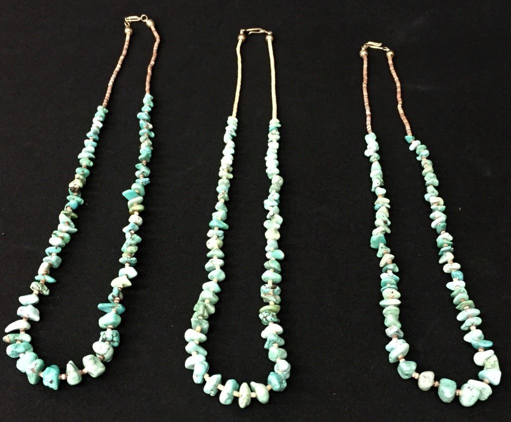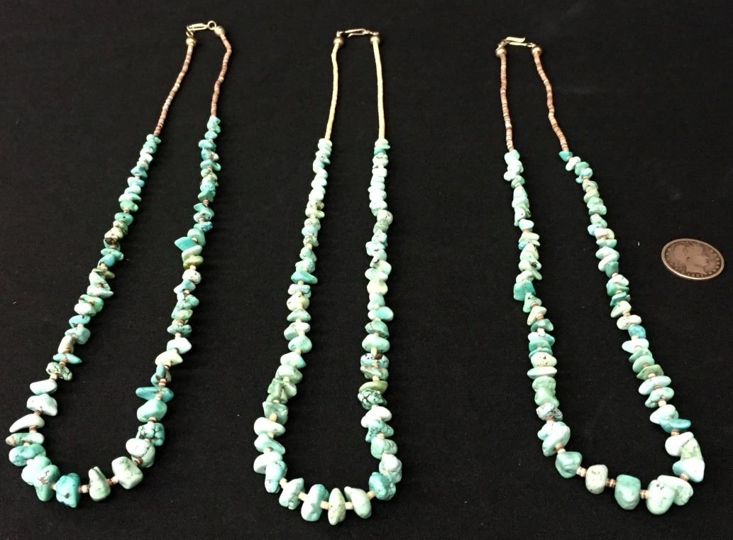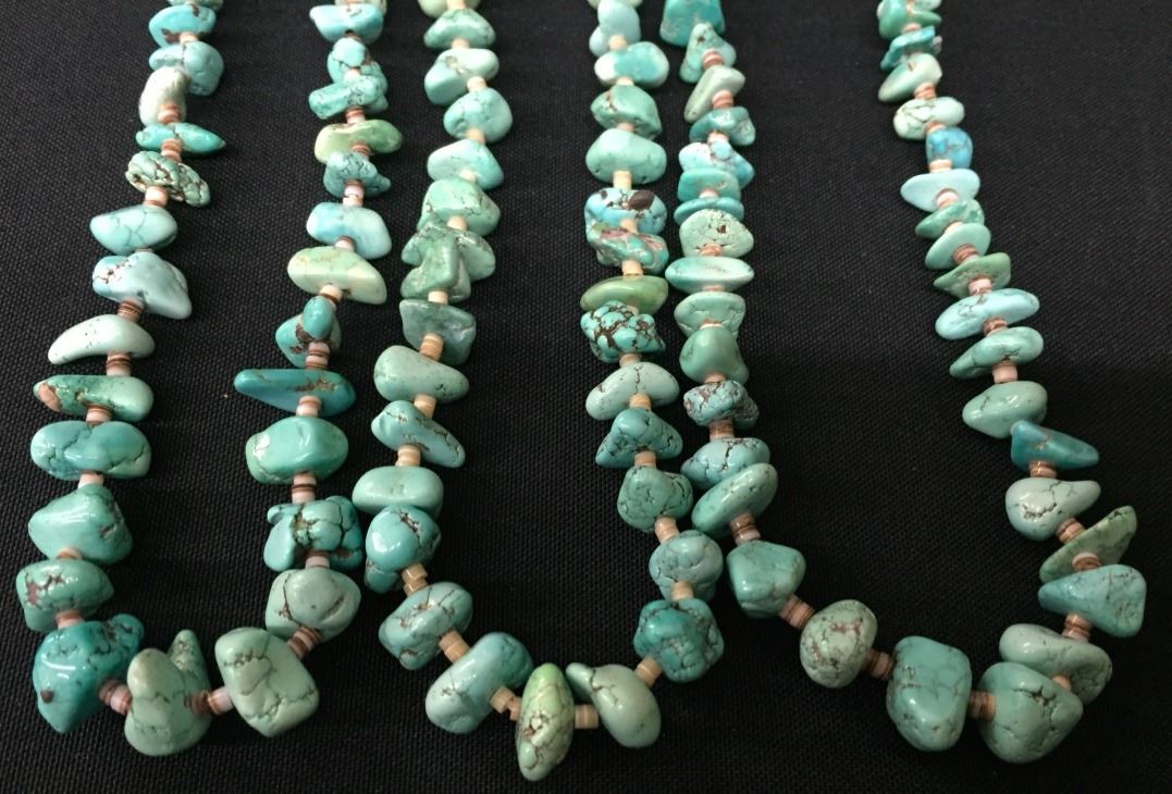 Each of these turquoise nugget necklaces feature heishi accents. They all fit approximately 22” around the neck. Please look closely at the pics as they are an important part of our description. Shipping: There will be a $5 handling / packaging fee for shipping this lot. The actual cost of postage will be added on top of that.