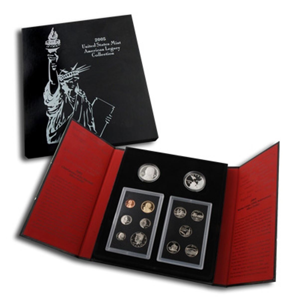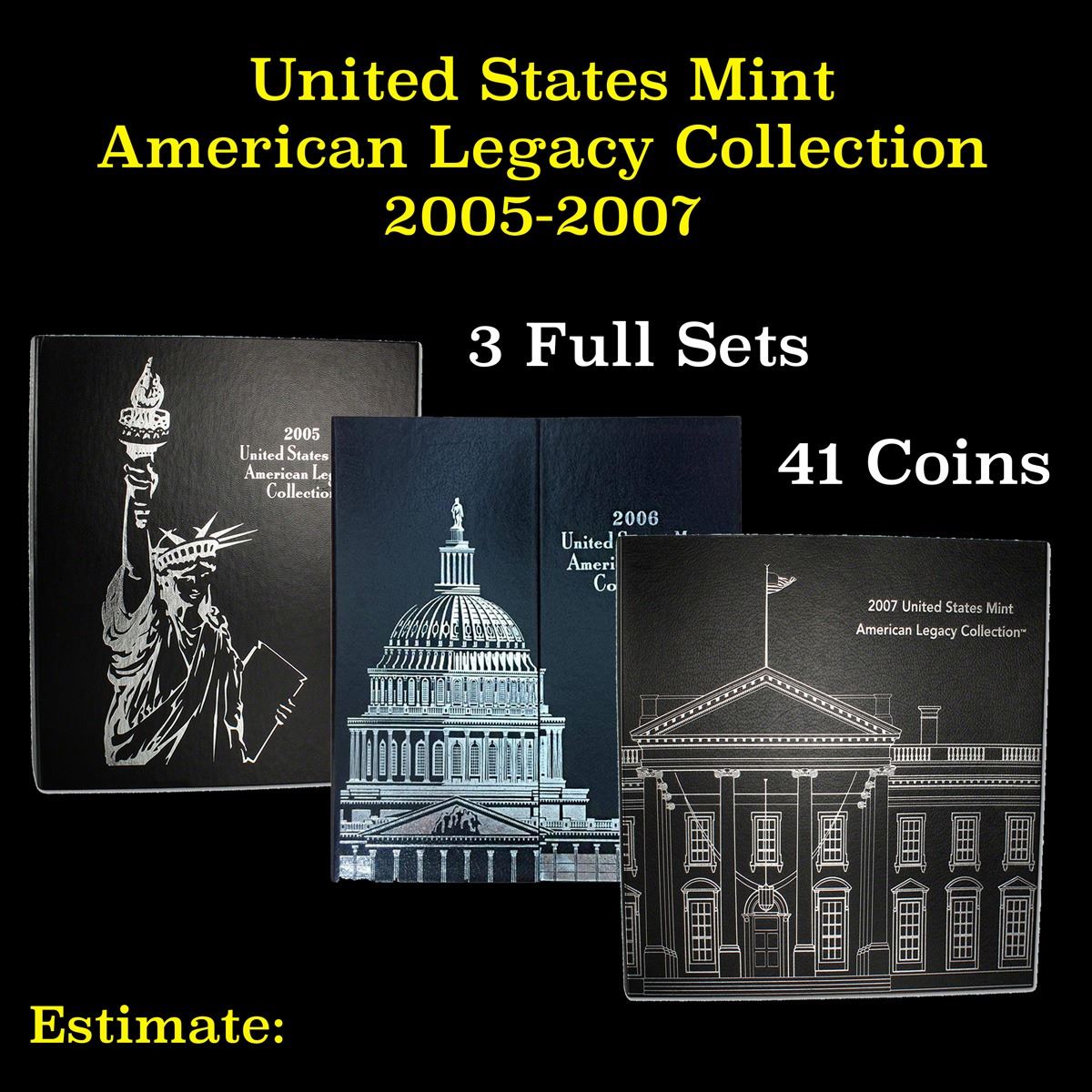 Group of 3 United States Mint American Legacy Collection 2005-2007 39 coins. Group of 3 United States Mint American Legacy Collections. Dates range from 2005-2007. The 2005 United States Mint American Legacy Collection is reminiscent of the Prestige Set previously offered by the United States Mint, and features the Marine Corps 230th Anniversary Proof Silver Dollar along with the Chief Justice John Marshall Proof Silver Dollar and proof versions of all 2005–dated circulating coins. This 2006 American Legacy Proof Set includes 12 Proof coins which are the 2006-S Lincoln Cent, 2006-S Jefferson Nickel, 2006-S Roosevelt Dime, 2006-S Kennedy Half Dollar, 2006-S Sacagawea Dollar, all five 2006-S Statehood Quarters, 2006-P Benjamin Franklin Founding Father Commemorative Silver Dollar and the 2006-S San Francisco Old Mint Commemorative Silver Dollar. This 2007 American Legacy Proof Set includes 16 Proof coins which are the 2007-S Lincoln Cent, 2007-S Jefferson Nickel, 2007-S Roosevelt Dime, 2007-S Kennedy Half Dollar, 2007-S Sacagawea Dollar, all five 2007-S Statehood Quarters, all four 2007-S Presidential Dollars, 2007-P Jamestown 400th Anniversary Commemorative Silver Dollar and the 2007-P Little Rock Central High School Desegregation Commemorative Silver Dollar.
