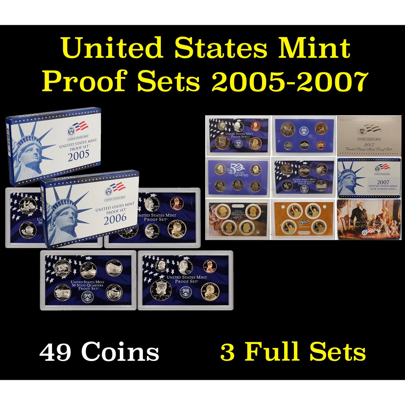 Group of 3 United States Proof Sets 2005-2007 49 Coins. Group of 3 United States Proof Sets. Dates are 2005-2007. The 2005-2006 set contains 5 Proof State Quarters, a Proof Half Dollar, a Proof Dime, as well as 2 additional Proof coins. 2007 set inclused 4 Proof Presidential Dollars. Complete with Original Packaging and COA.