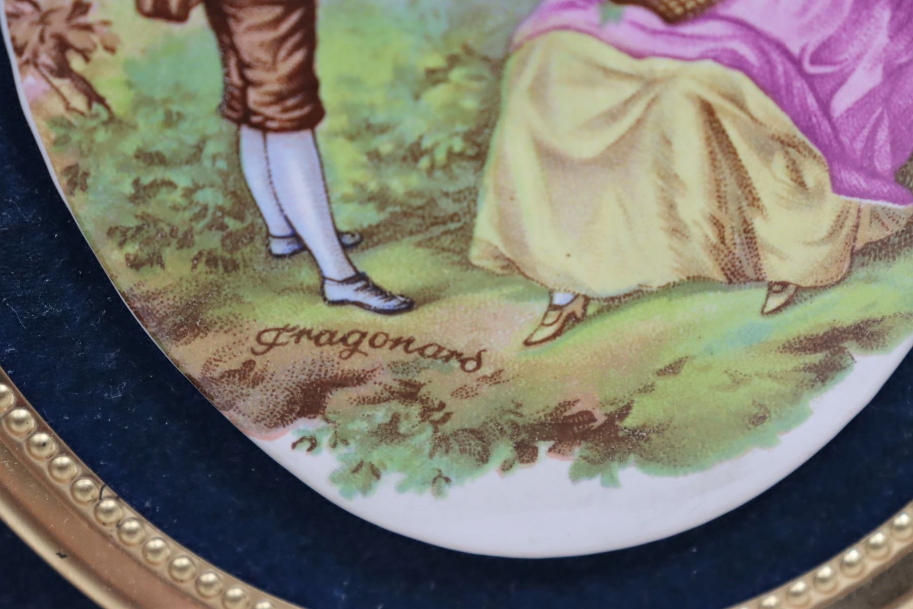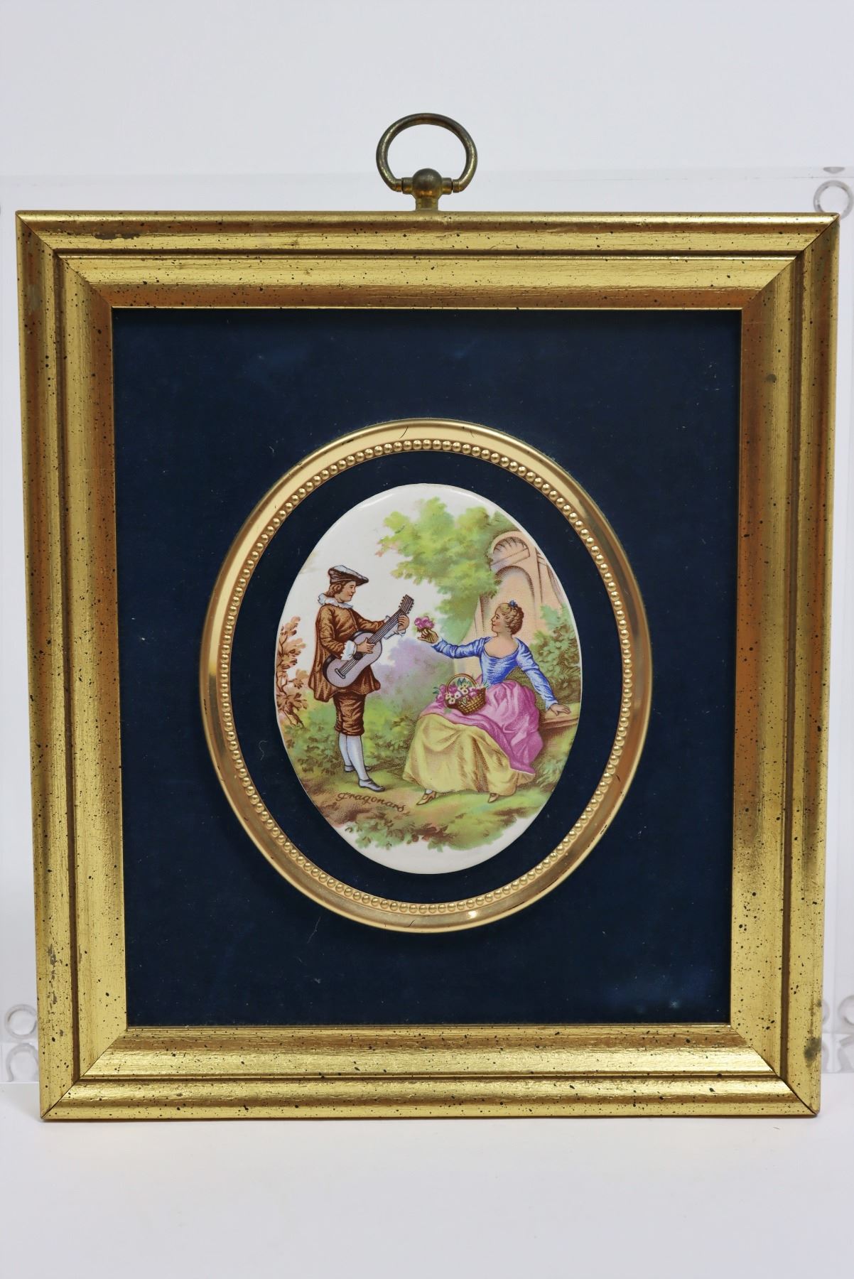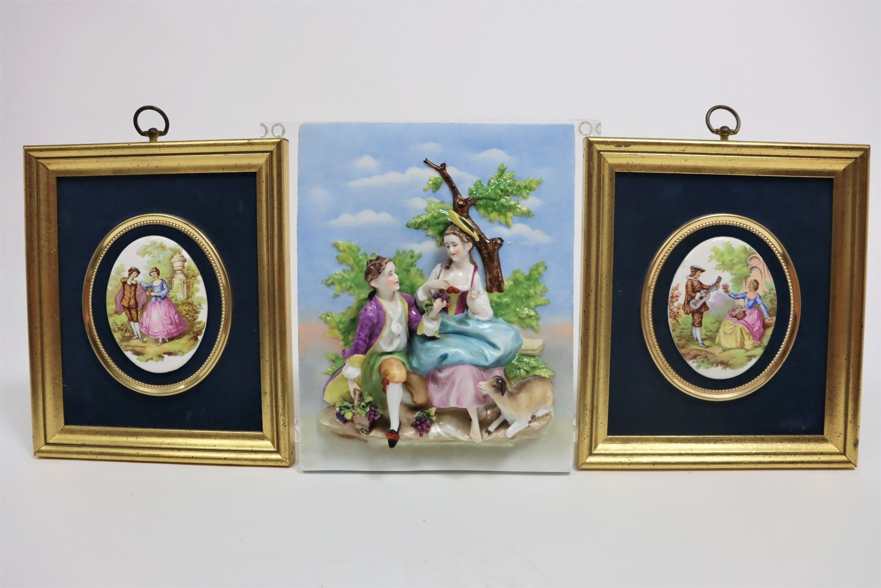 This lot includes a pair of framed porcelain plaques, signed. Also included is an unframed porcelain plaque.