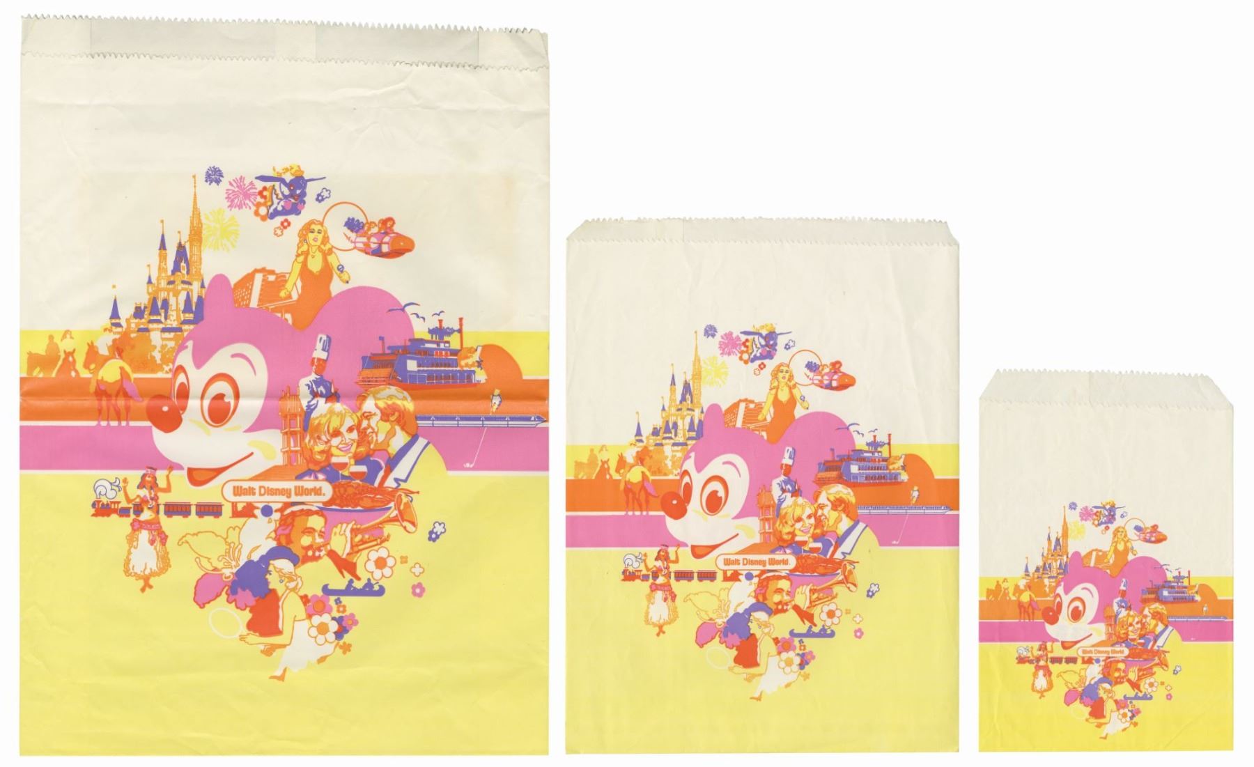 (Walt Disney World, 1978) A group of (3) colorful paper shopping bags from Walt Disney World featuring illustrations of the attractions and lands. The bags come in a variety of sizes to be used for the park's wide assortment of souvenirs. Ranging in size from 8.5"x5.5" to 16"x11.5" the bags are in very good condition with minor creasing and a horizontal fold to the largest bag.