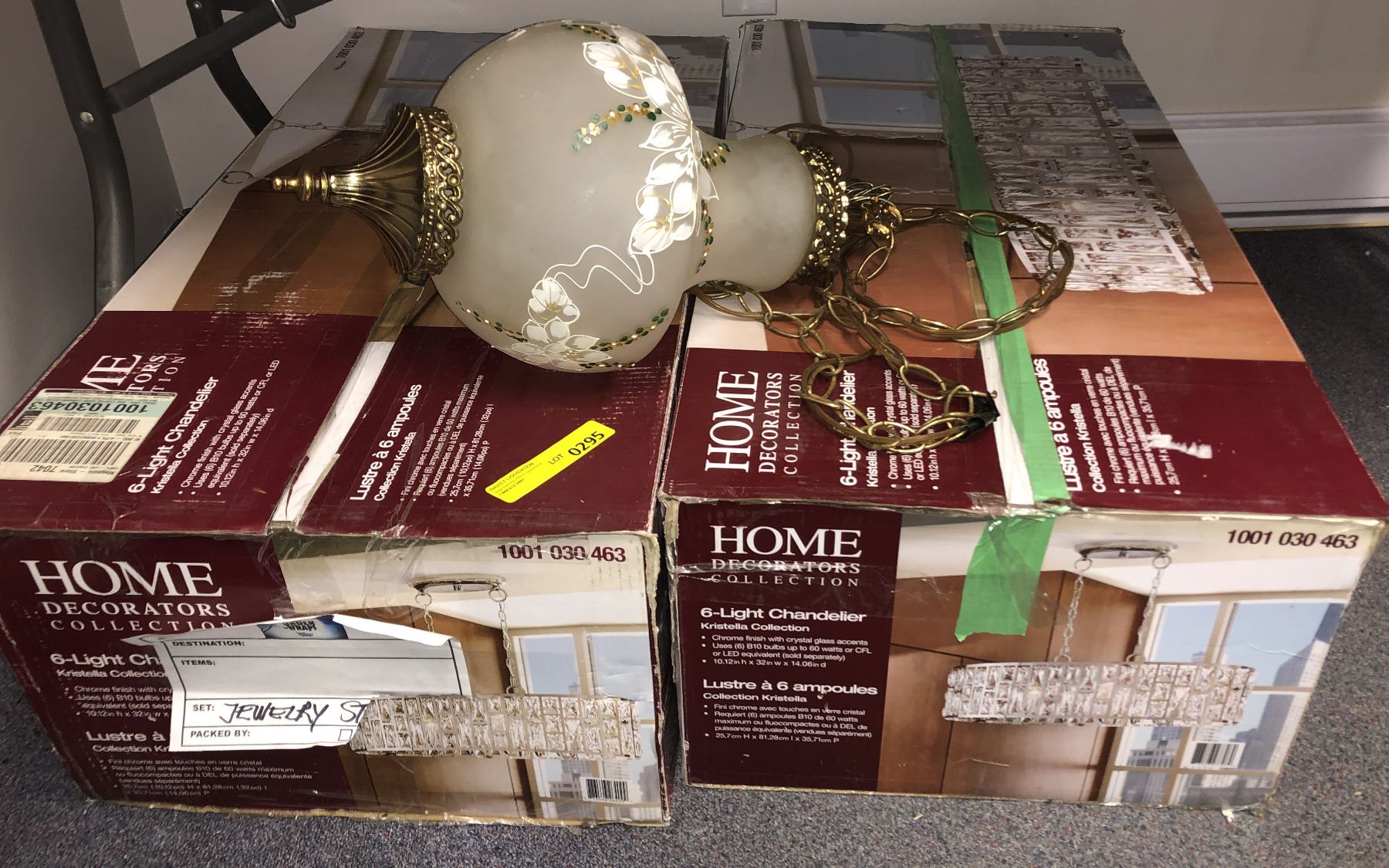 Group of 3 assorted chandeliers - includes 6 light chandelier & brass and glass chandelier