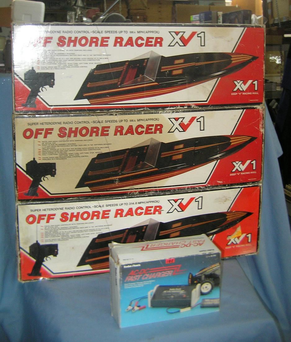 Group of 3 off shore racing boats all radio controlled with additional fast charger battery pack charging unit all boats are charged with original boxes part of a moving and storage company seized or unclaimed merchandise group sent to auction for liquidation est. value $175.00-$200.00