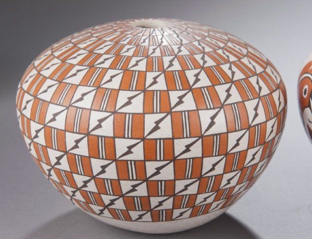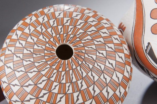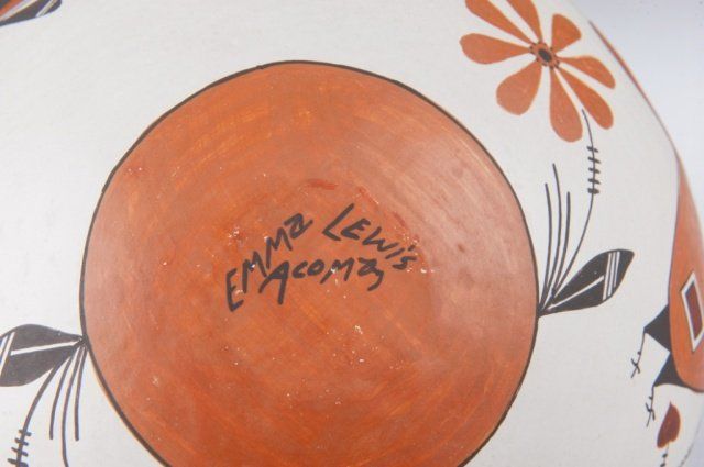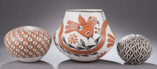 A group of 3 signed Acoma pots. Includes a signed Emma Lewis pot 6 3/4"h x 8"d. A signed Deloris Lewis vessel 3 3/4"h x 4 3/8"d. A signed Grace Chino vessel 4 1/2"h x 6"d.