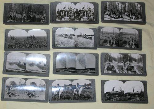 Group of 30 stereoscope cards by Keystone View Co. numbered between 186 & 232 depicting scenes from CO, KS, MT, CA, OR, & WY. Pictured are Continental Divide, Yellowstone National Park, Old Faithful, Cowboy and horse scene of Canada, Copper smelters, Butte, MT. Cards are slightly curved.