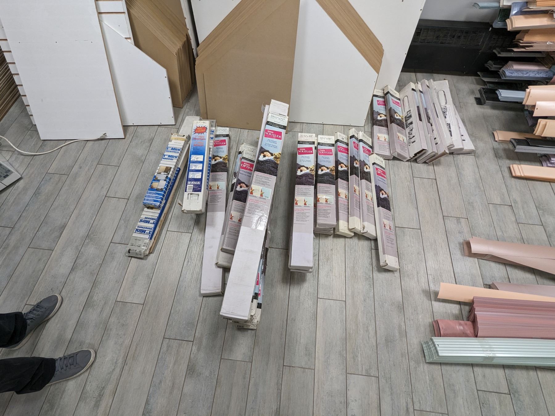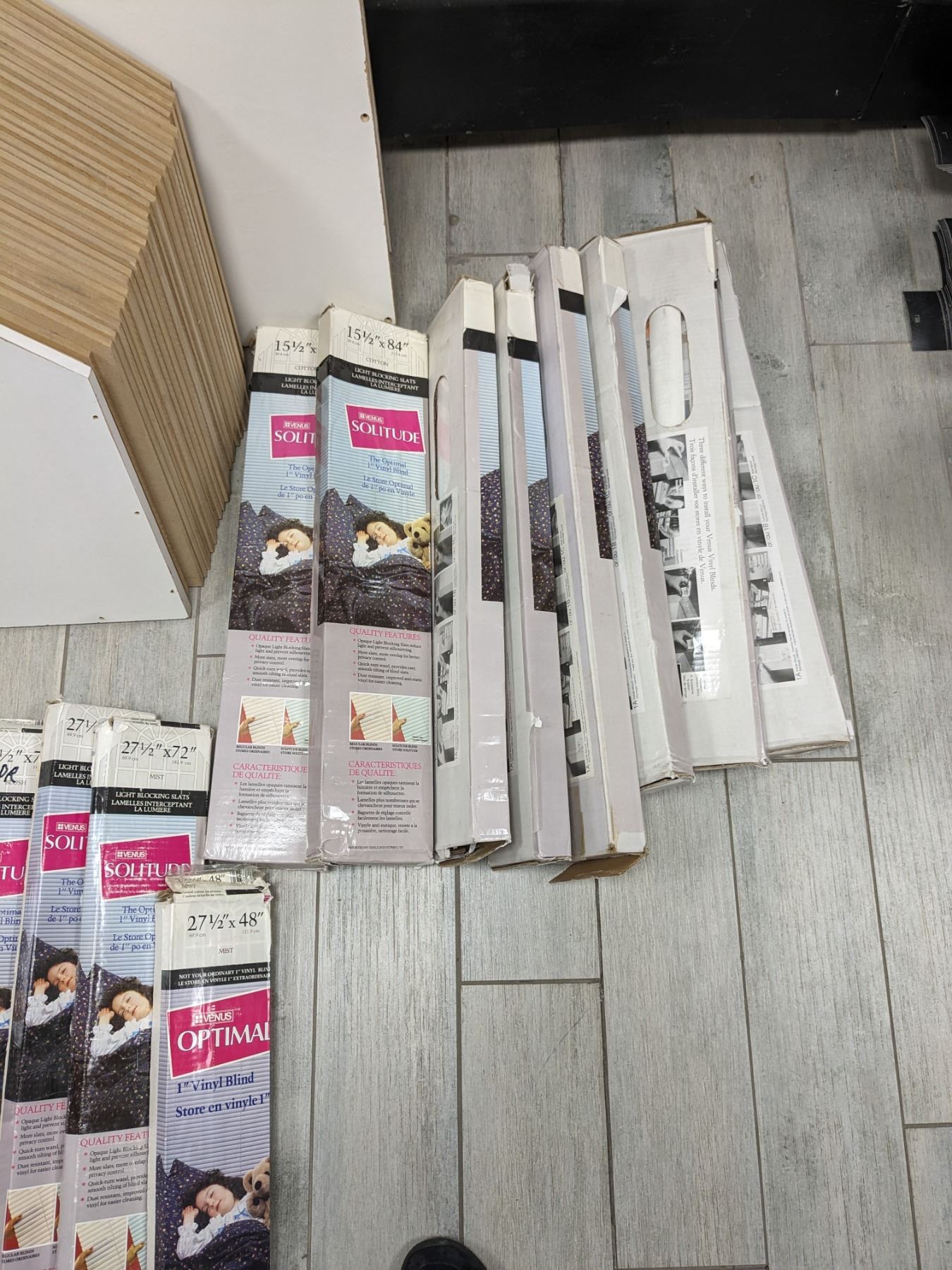 Group of 35 boxes Mini Blinds - on floor You will need to bring your own tools and manpower to remove all won lots. Zaks Auctions and its staff will not have any tools on hand and will not be assisting with the removal, dismantling or loading of any won items. Any damage done to the premises will be charged to the winning bidder. All pickups will be by appointment only. Any walk-ins will be turned away.All items are sold as is, where is. There will be absolutely no refunds, no returns, no credit and no reimburesement for any lot. It is strongly recommended you view the lots you are interested in on Thursday March 7. This is a you bid, you buy, you remove all purchased lots, auction. Any article not removed by 5pm on March 10 will result in surplus removal fees to your invoice and payable immediately once invoice has been updated and emailed to you.