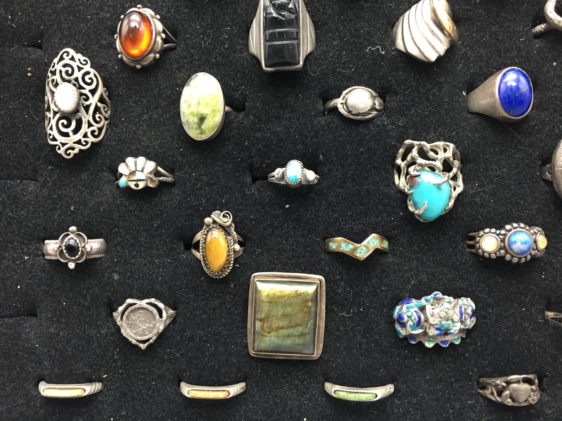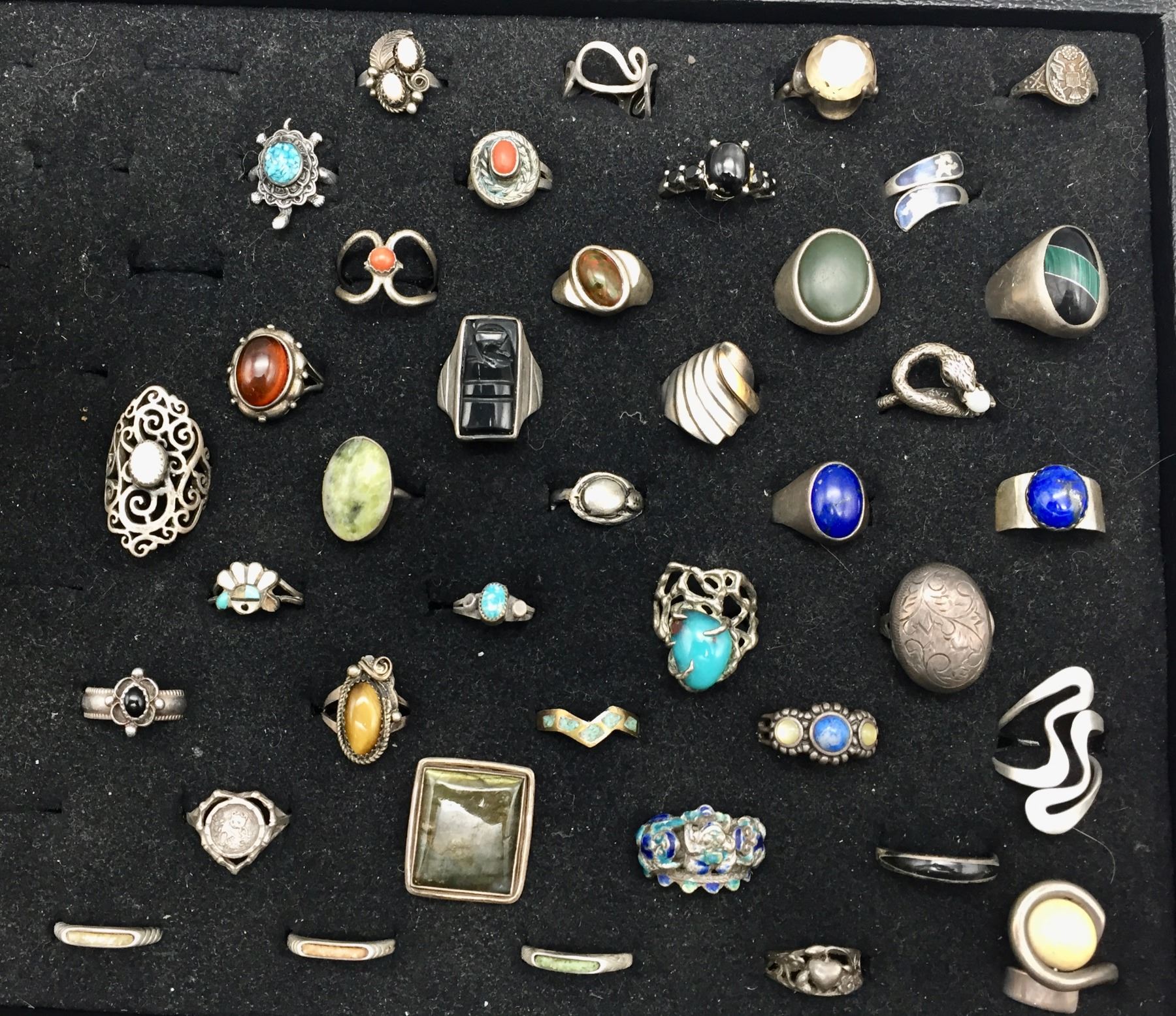 Description: Included for sale in this lot is a group of 39 rings. This is a bargain lot! The rings are mostly sterling silver with a variety of stones. Maker: Various. Approx. Age: Vintage. Size: Varies. Combined weight of 193.3 grams. Condition: Good for their age, normal wear expected. Please look closely at the pictures - they are an important part of our description. Shipping: There will be a $5 handling / packaging fee for shipping this lot. The actual cost of postage will be added on top of that.