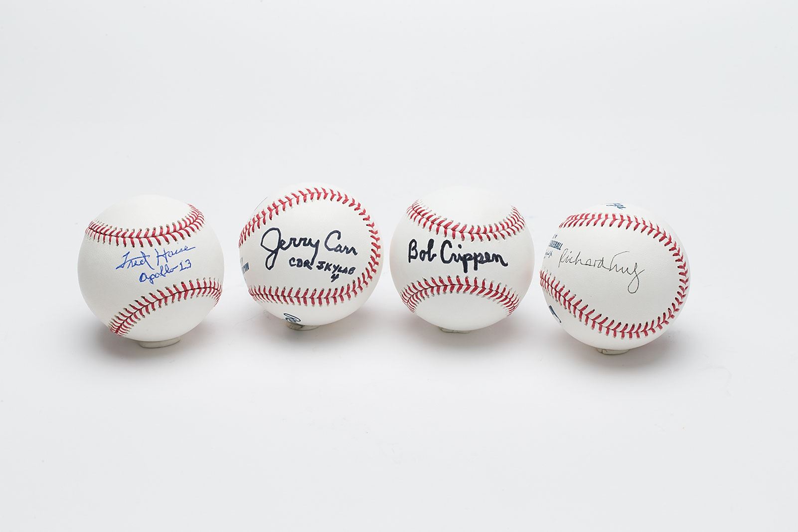 Group of four official Rawlings Major League (Manfred) baseballs, each signed on a side panel or the sweet spot in felt tip or ballpoint by a NASA astronaut: "Fred Haise, Apollo 13," "Jerry Carr, CDR Skylab 4," "Bob Crippen," and "Richard Truly." In overall very fine condition.