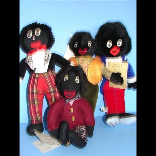 Group of 4 Golliwogs Grop of 4 Golly's one 13" Jolly Golly 148 of 500 Origin. Tag, one 15" Leven-Replica 1925 Printing on Foot , one 14" no tags, one Pamda Bear Wool Felt Bocy Mohair 12". Very good condition. Weight 5 1/2 lbs.