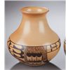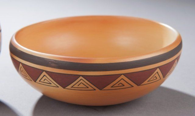 A group of 4 Hopi vessels. Includes Dianah Tahbo's bird and lizzard vessel signed "Dianna Tahbo Tewa Hopi 96" 3"h x 3 1/4"d. A vessel marked "M. Tah-Vo 95" 5"h x 4 1/4"d. A M. Sahneyah Hopi bowl 2"h x 5"d. An unmarked Hopi bowl 2 3/4"h x 4"d.
