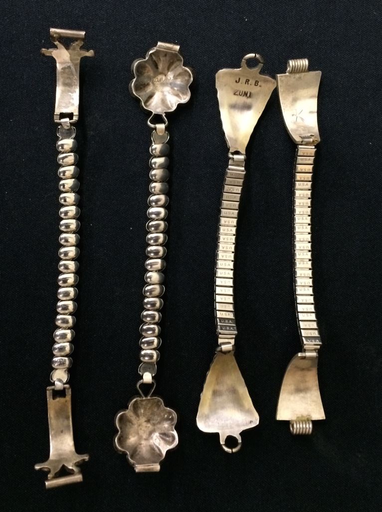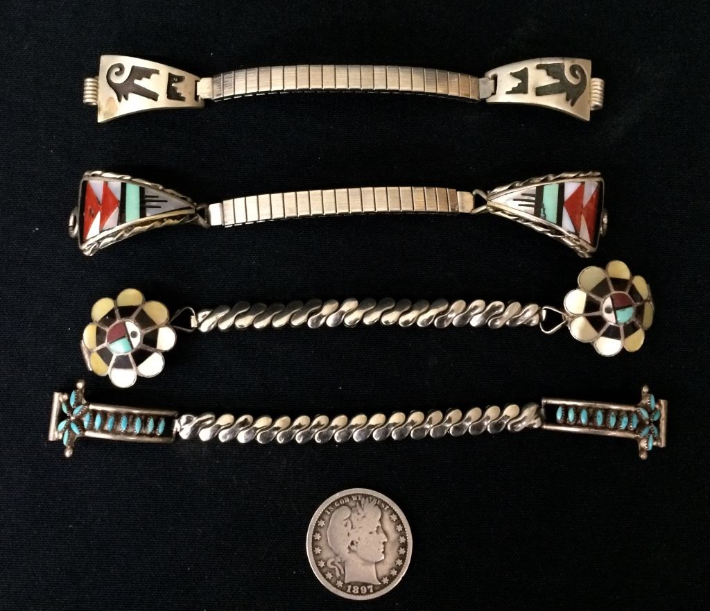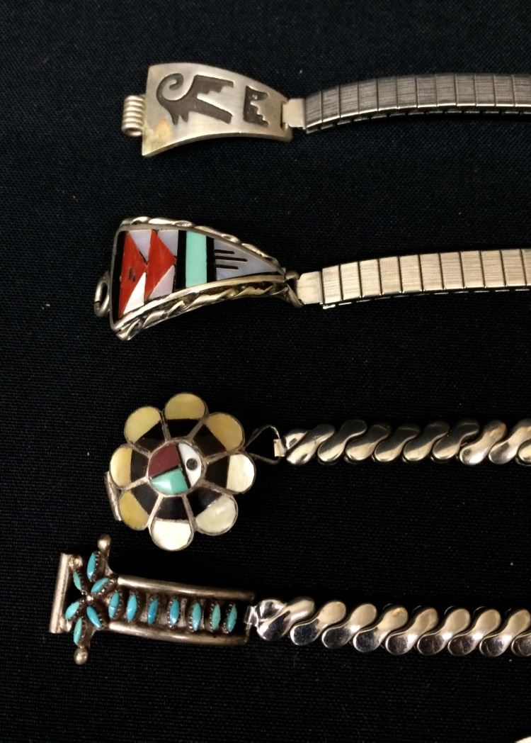 You get all 4 of these watch tips for 1 money in this lot! The 2 inlay pair are signed by Zuni artists, the overlay pair is signed with a ‘K” and the needlepoint pair are unsigned. All are sterling and collectively weigh 48.5g. with the bands. Good condition. Shipping: There will be a $5 handling / packaging fee for shipping this lot. The actual cost of postage will be added on top of that.