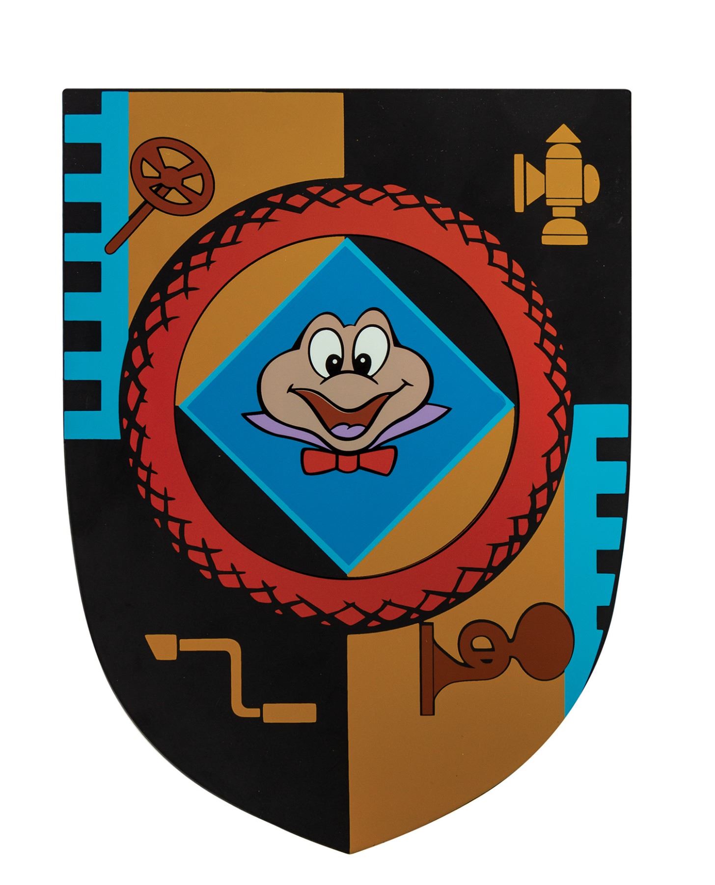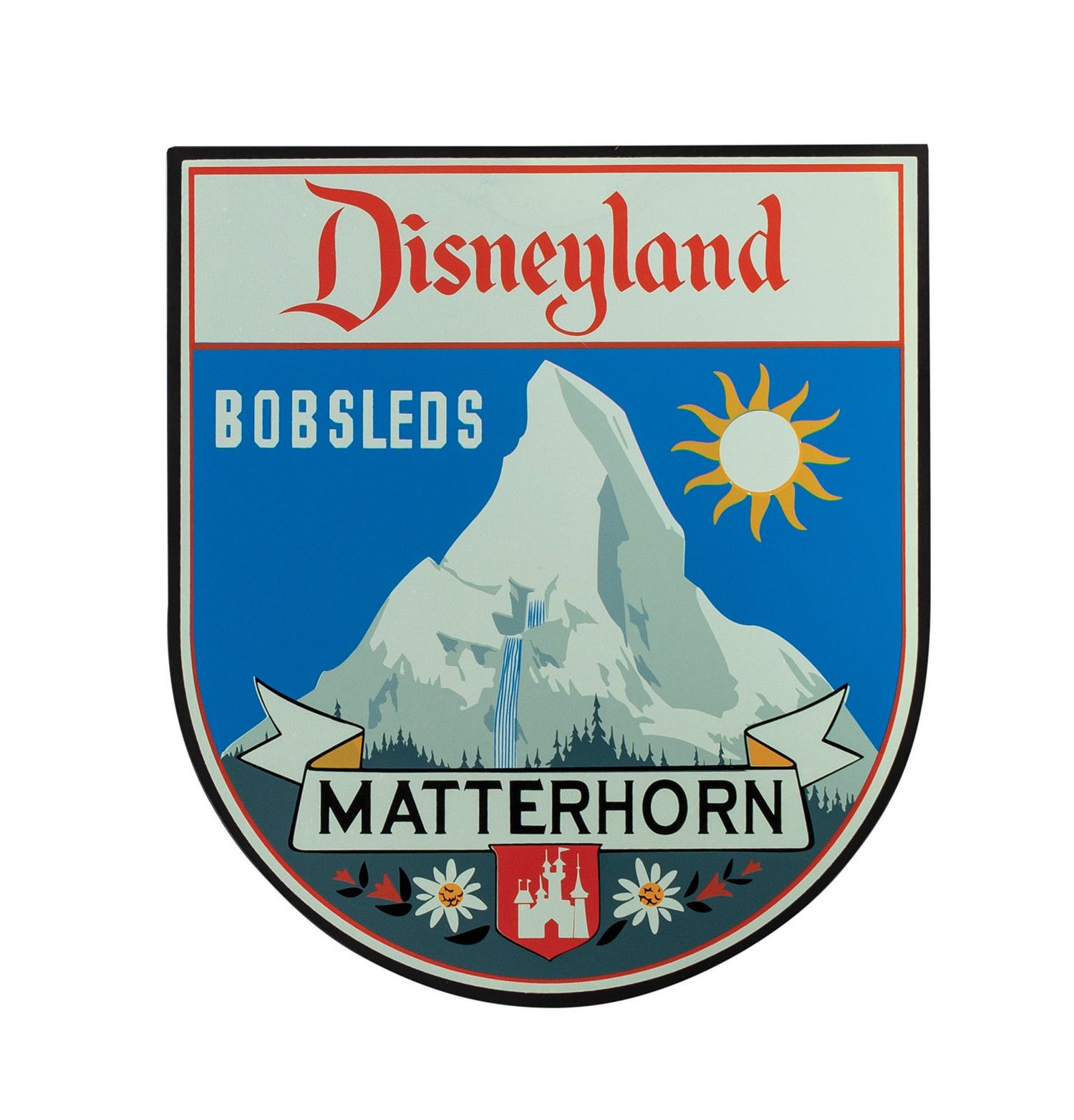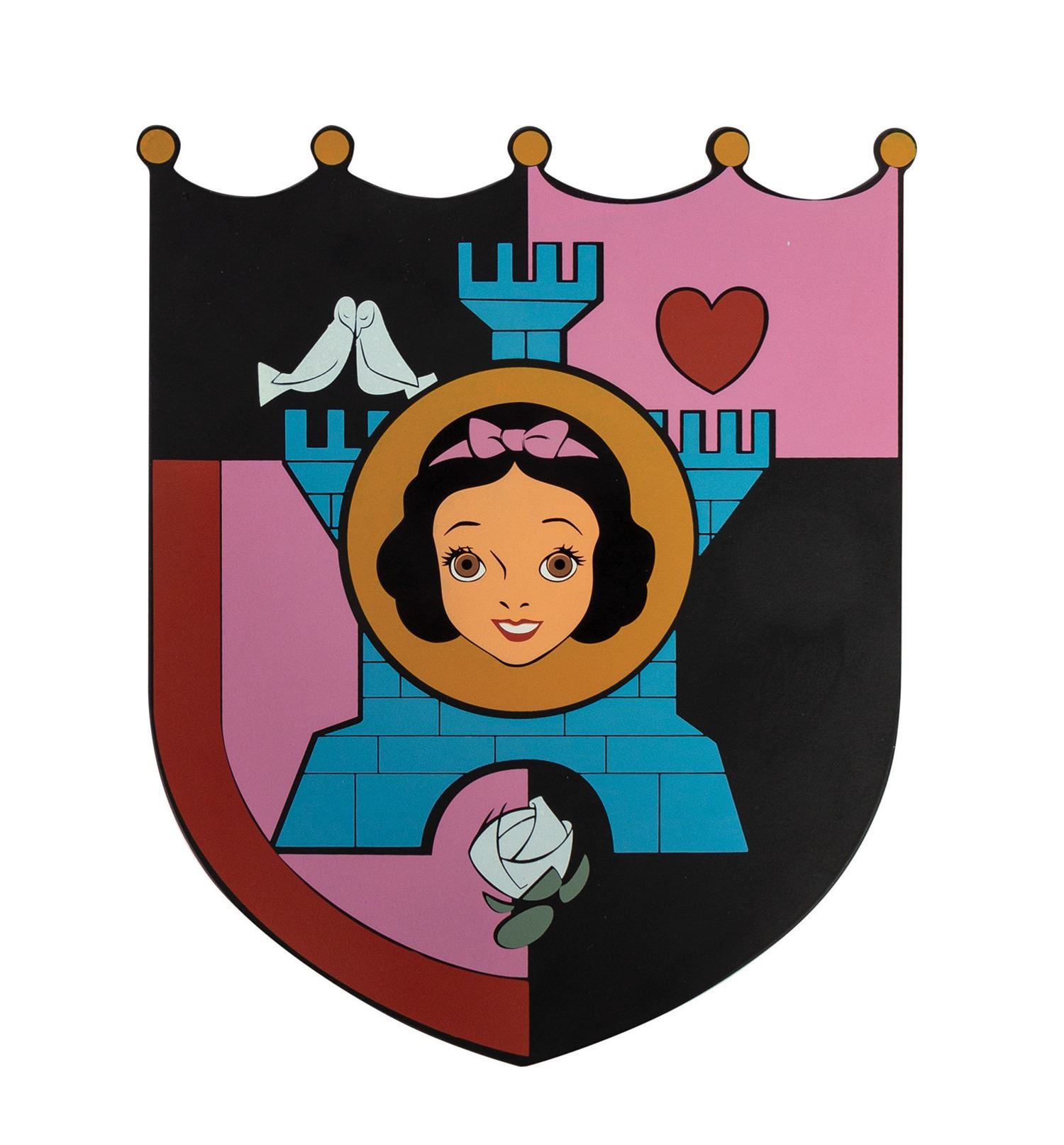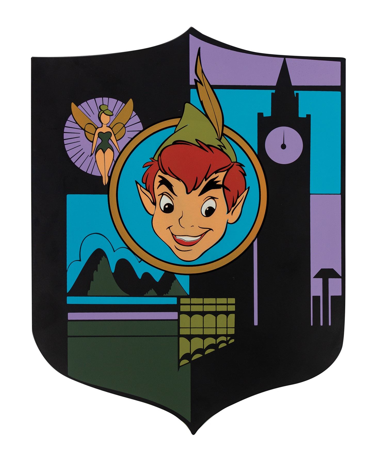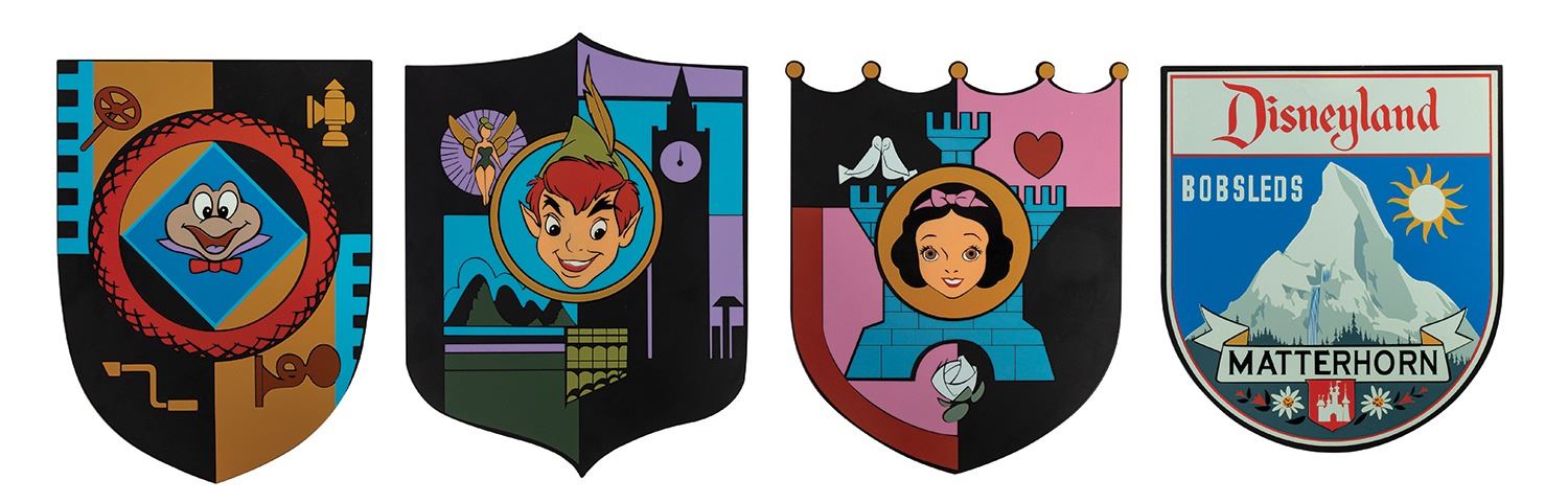 (Disneyland, 2005) A set of (4) attraction shields created by Kevin Kidney and Jody Daily to commemorate Disneyland's 50th Anniversary. The beautifully illustrated metal shields, each from an edition of 1500, feature the attractions Snow White's Scary Adventures, Mr. Toad's Wild Ride, Peter Pan's Flight, and the Matterhorn. Each piece measures approximately 9.5"x8" and is in fine condition.