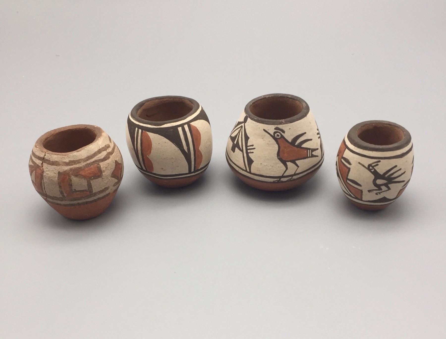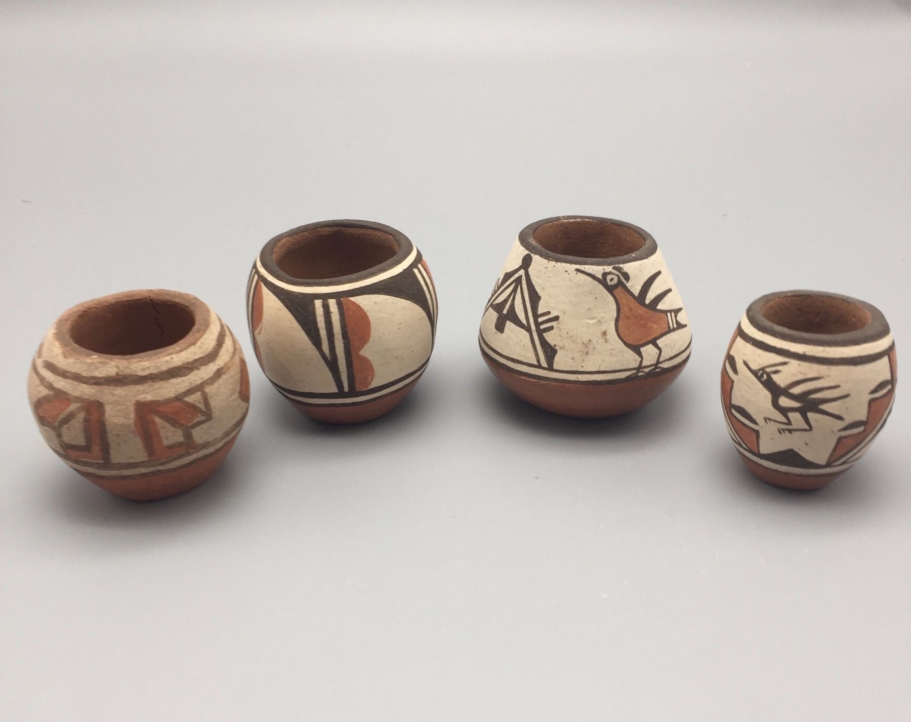 Maker: Various Zia potter(s). Approx. Age: Vintage. Size: Pots range from 1 1/2” w to 2 1/4” w and 1 3/4” t to 2” t. Additional Info: Group of 4 Zia handmade mini pots. Condition: Good for their age, normal wear expected. Please look closely at the pictures - they are an important part of our description. Shipping: There will be a $7 handling / packaging fee for shipping this lot. The actual cost of postage will be added on top of that.