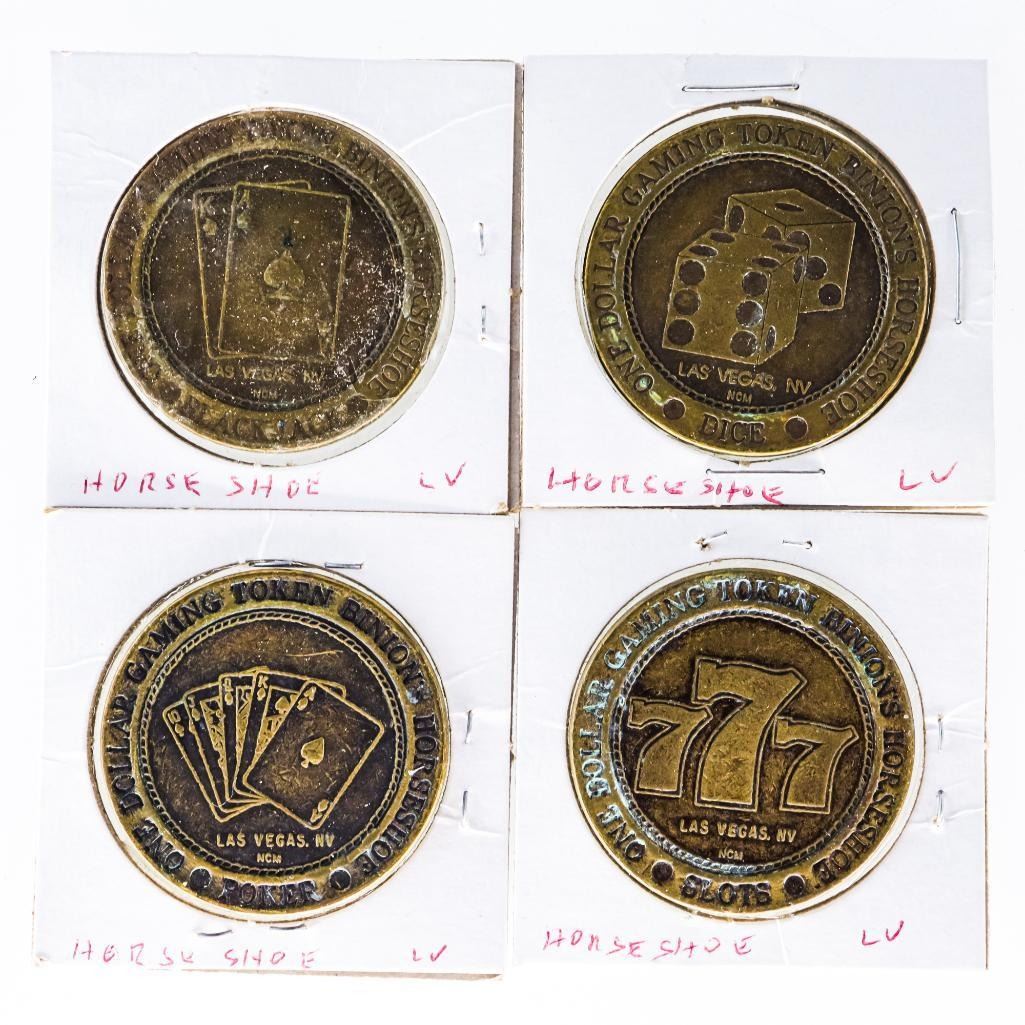 Group of 4 One Dollar Gaming Tokens, Acceptable Only at The Horseshoe, Dice, Black Jack, Slots, Poker.