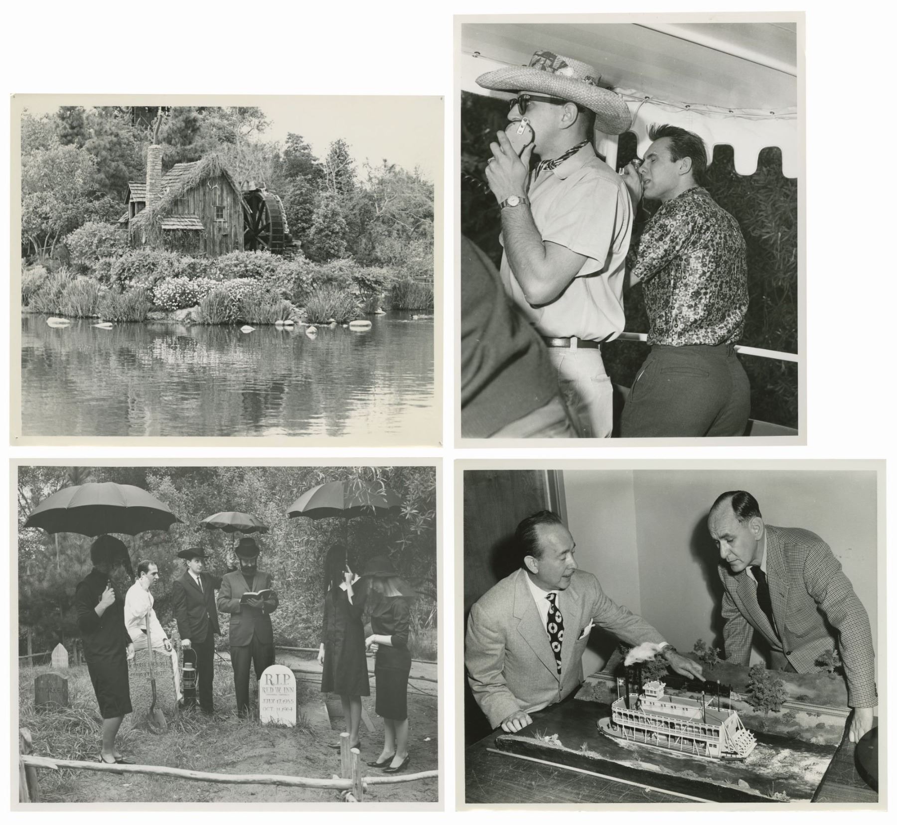 (Disneyland, c.1955-64) A group of (4) black-and-white photos featuring cast members and Disneyland attractions. These photos provide a great behind-the-scenes look at Disneyland, including cast members holding a mock funeral for the employee cafeteria at the Red Wagon Inn, as well as the Jungle Cruise attraction, and an early model of the Mark Twain riverboat. The photos measure 8"x10.5" each, and are in very good condition with minor edge-wear.
