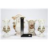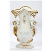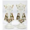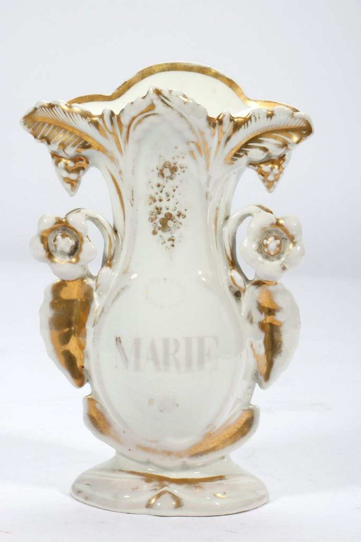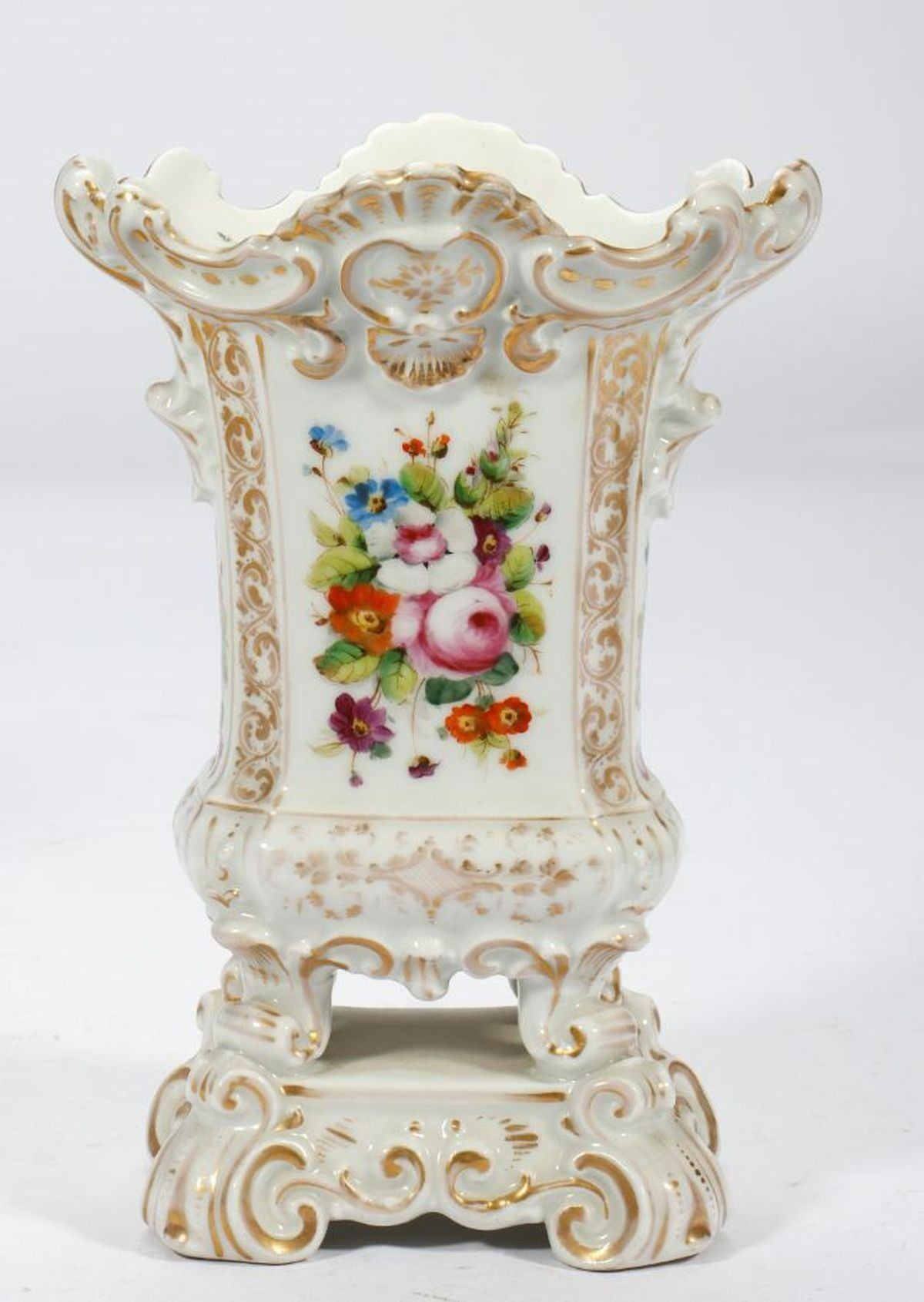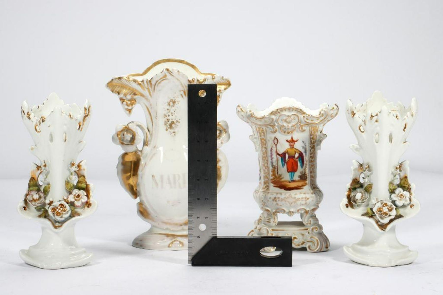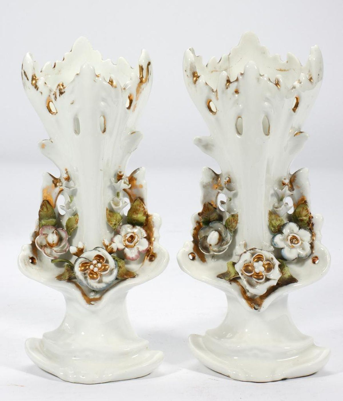 Consists of one with floral and Chinoiserie decoration, unmarked (8 1/4in. h.); one with flower and leaf-form handles, red mark of "&[8?]0" (10 1/4in. h.); and a pair of trumpet/flaring form with applied flower decoration, unmarked (9 3/4in. h). Condition: The Chinoiserie vase is in very good condition, only light wear to gilt; the large vase has extensive wear/loss to gilt; one of the pair has hairline cracks on the back, and both appear to have broken off buds at center, wear to gilt.