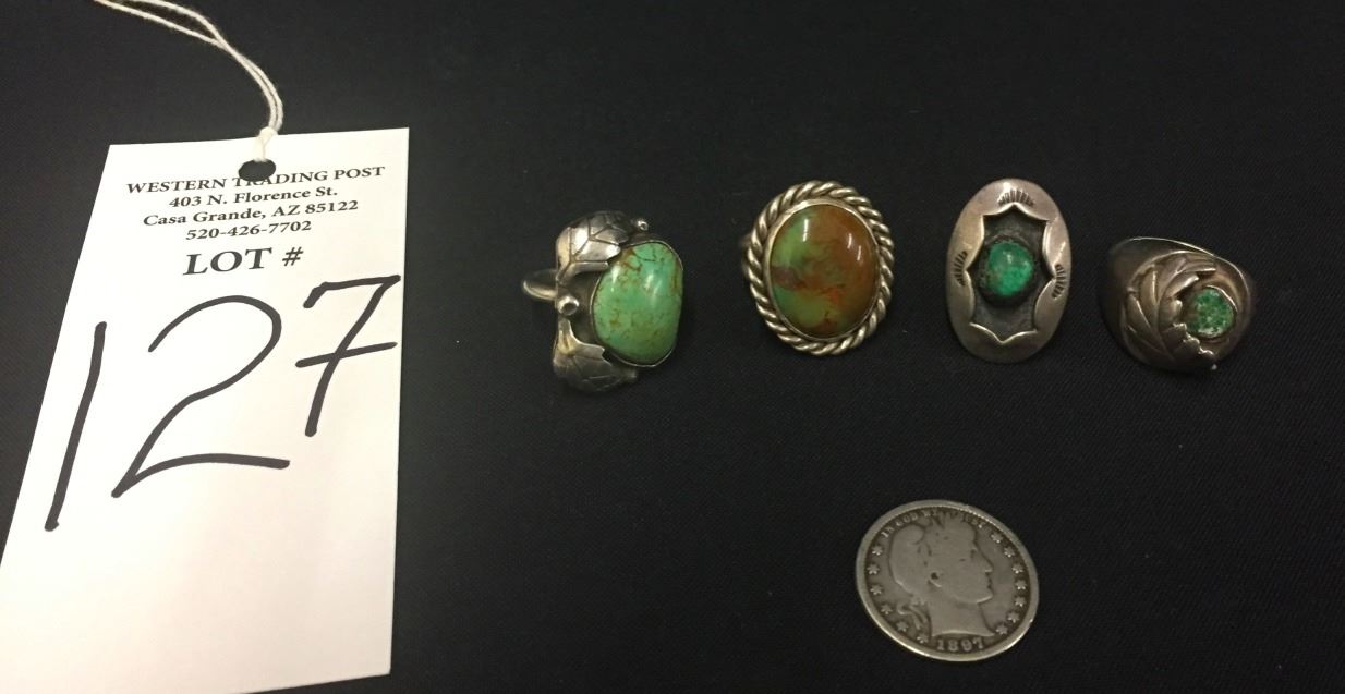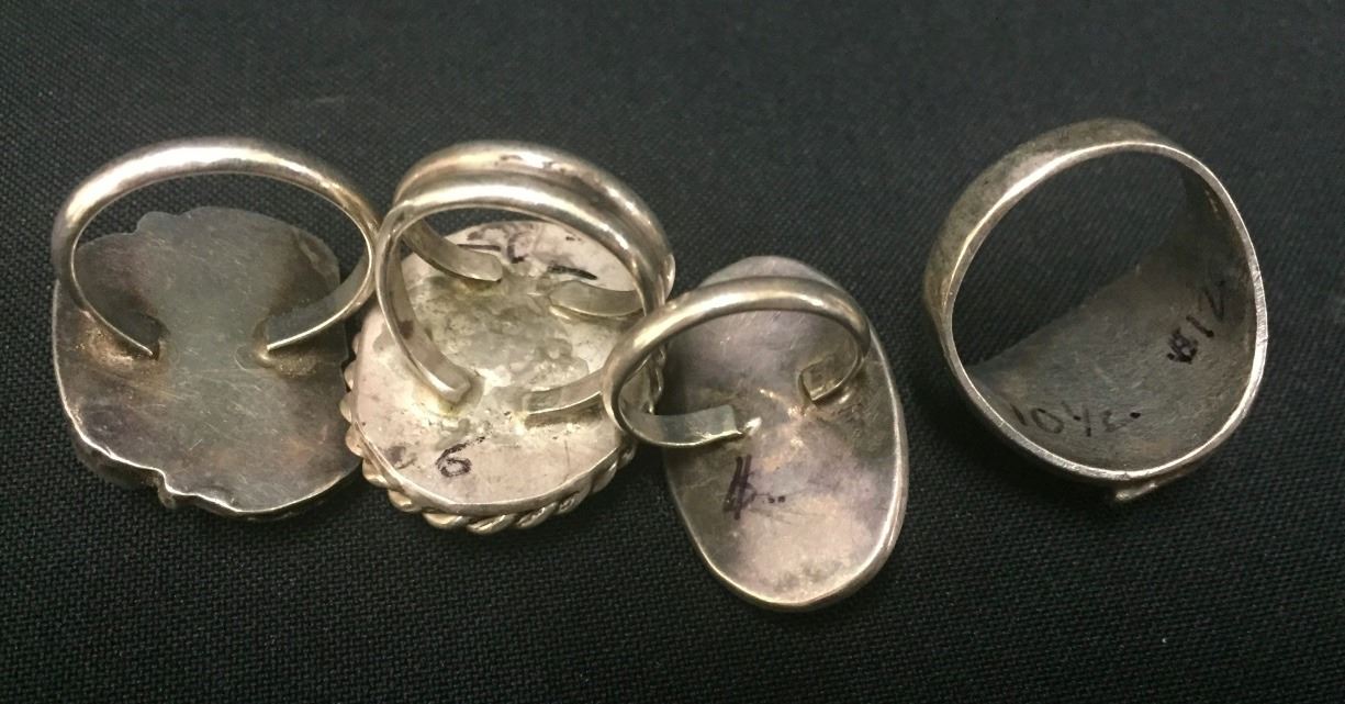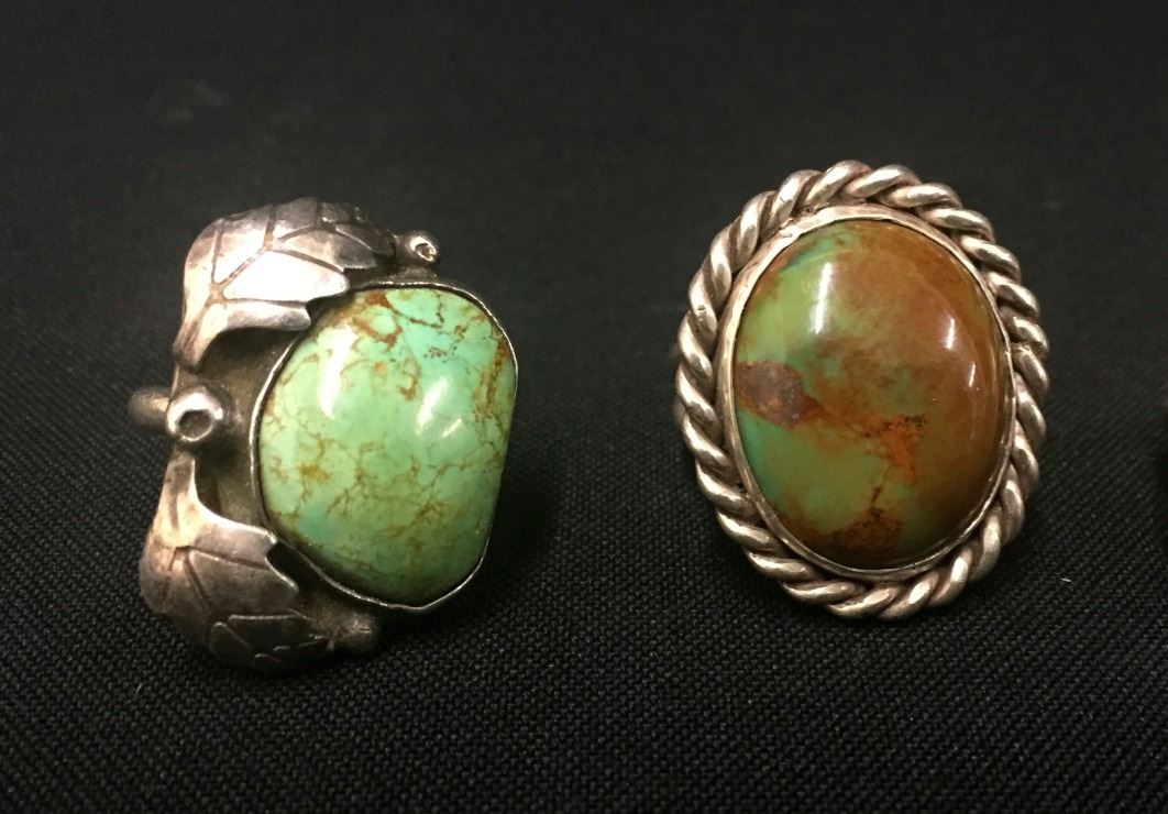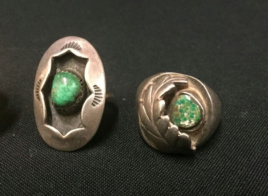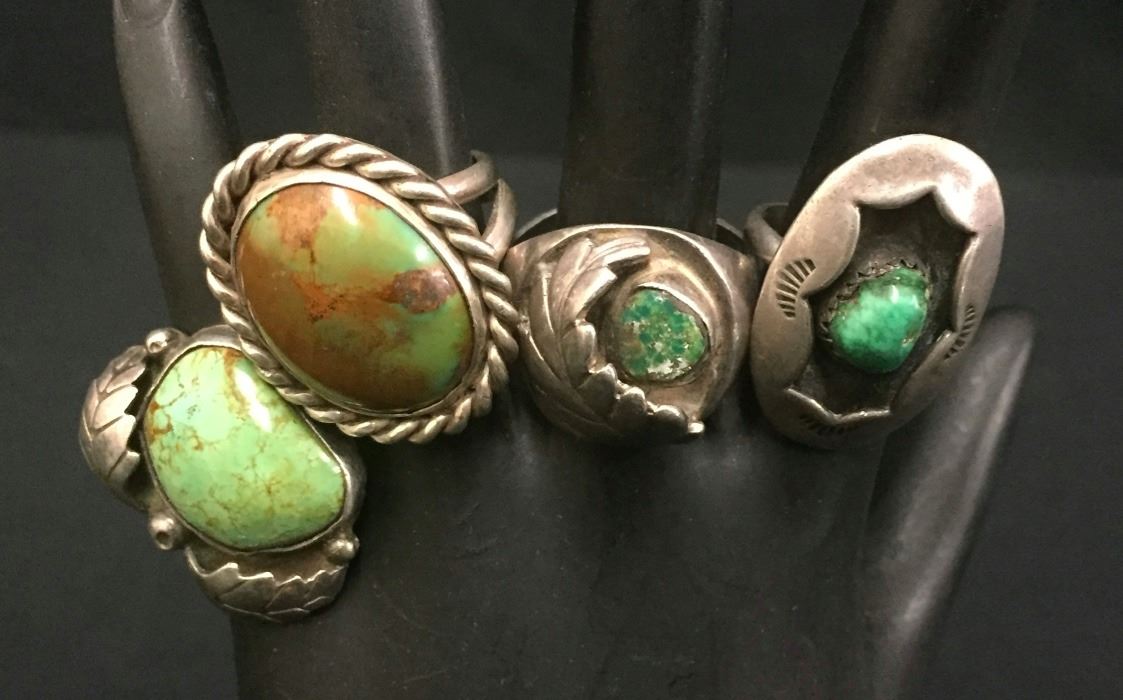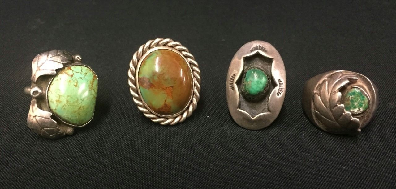 Maker: Various, all appear to be vintage Navajo. Approx. Age: Vintage. Size: 5, 6, 6.5 and 10.5. Collectively they weigh 41.1g. Condition: Good. Additional Info: 4 vintage Navajo rings with green turquoise. Sterling silver. Please look closely at the pictures - they are an important part of our description. Shipping: There will be a $5 handling / packaging fee for shipping this lot. The actual cost of postage will be added on top of that.