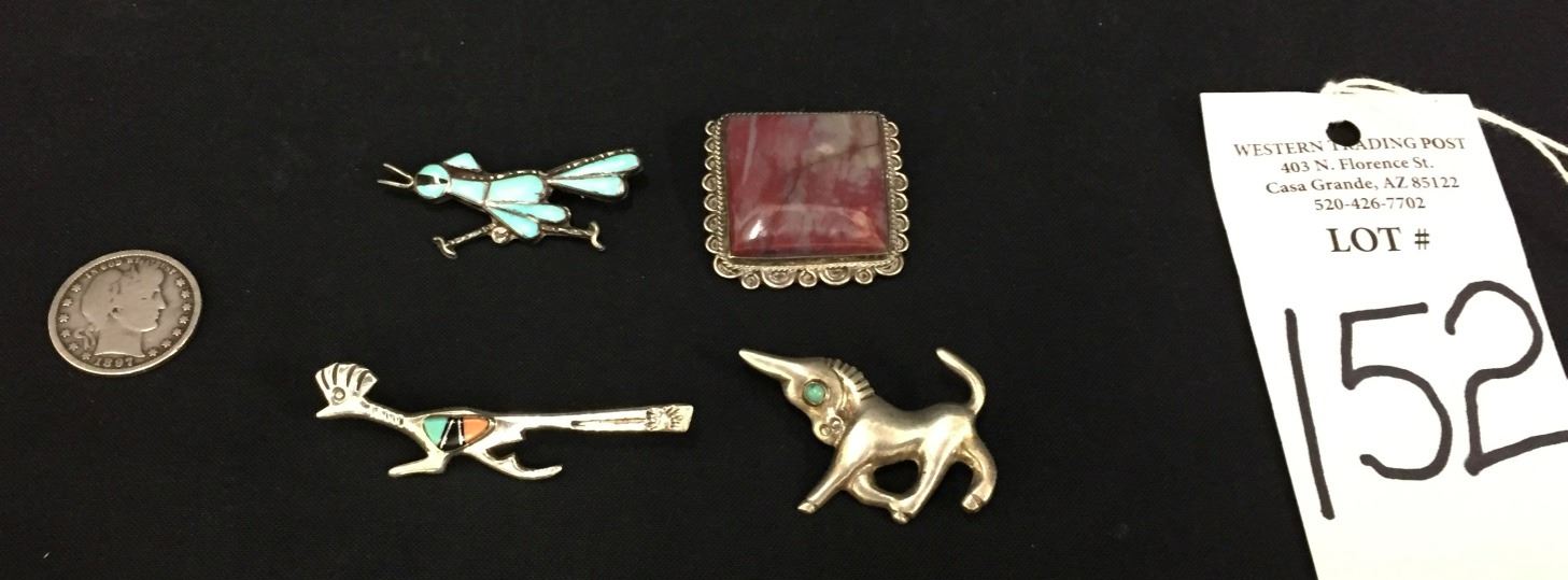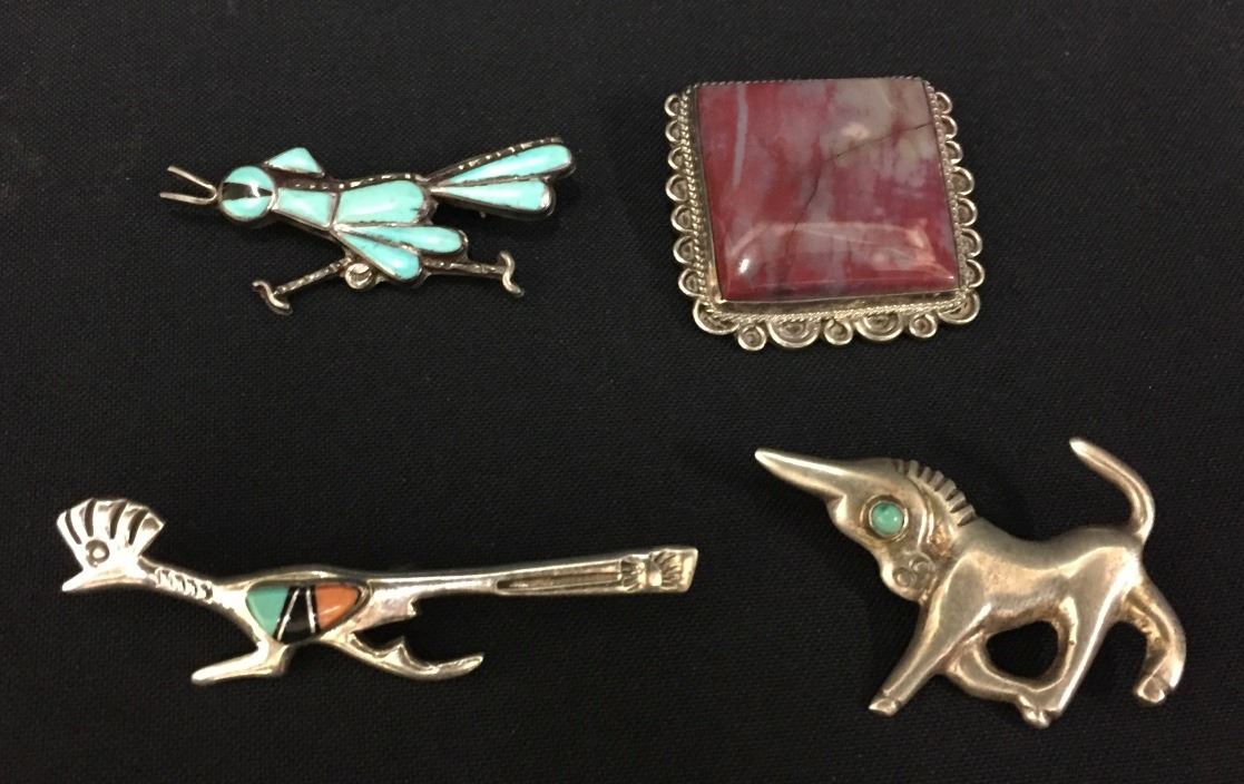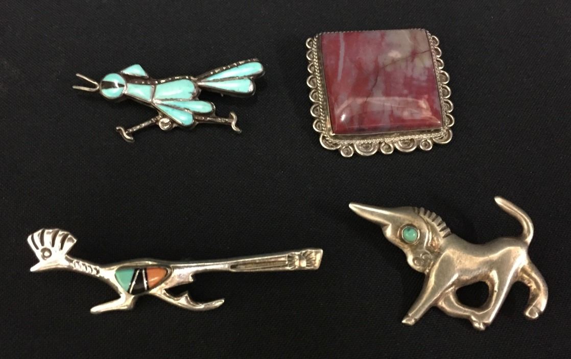 Maker: Appear to be Navajo, Zuni and the burro is Mexican. Approx. Age: Vintage, 1940s - 70s. Size: Collectively they weigh 37.3g. Condition: Good. Additional Info: 4 vintage pins. Please look closely at the pictures - they are an important part of our description. Shipping: There will be a $5 handling / packaging fee for shipping this lot. The actual cost of postage will be added on top of that.