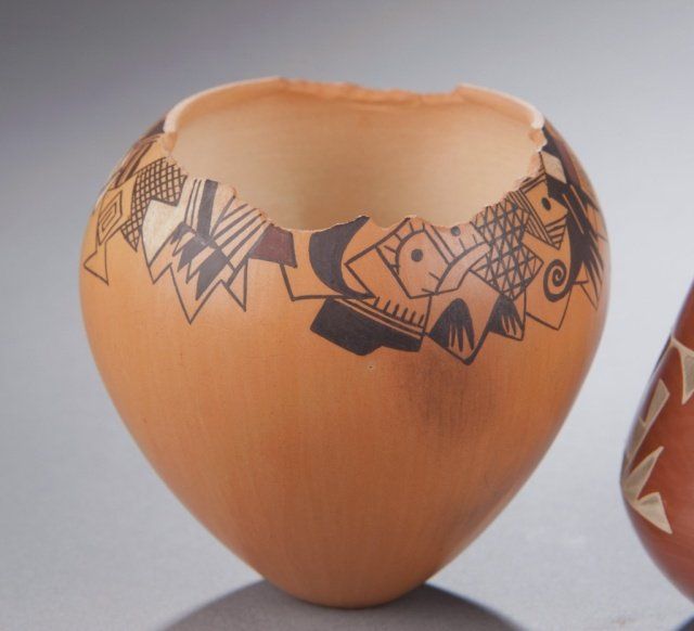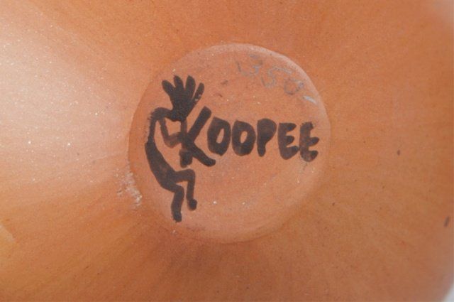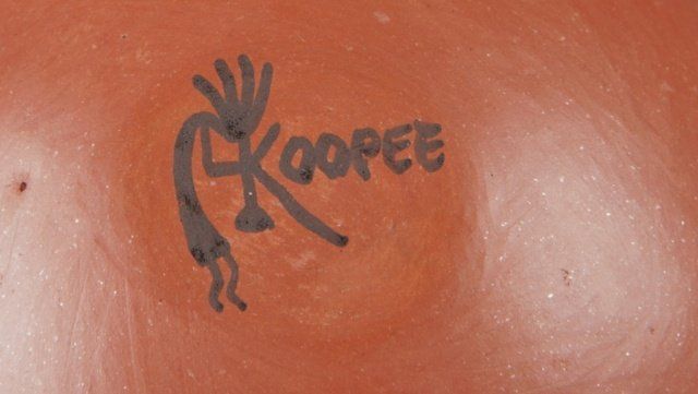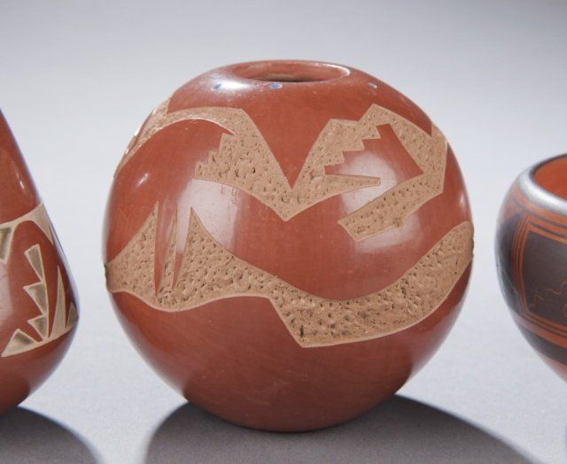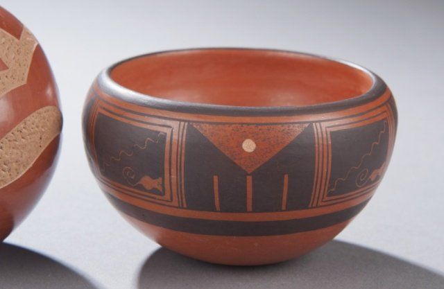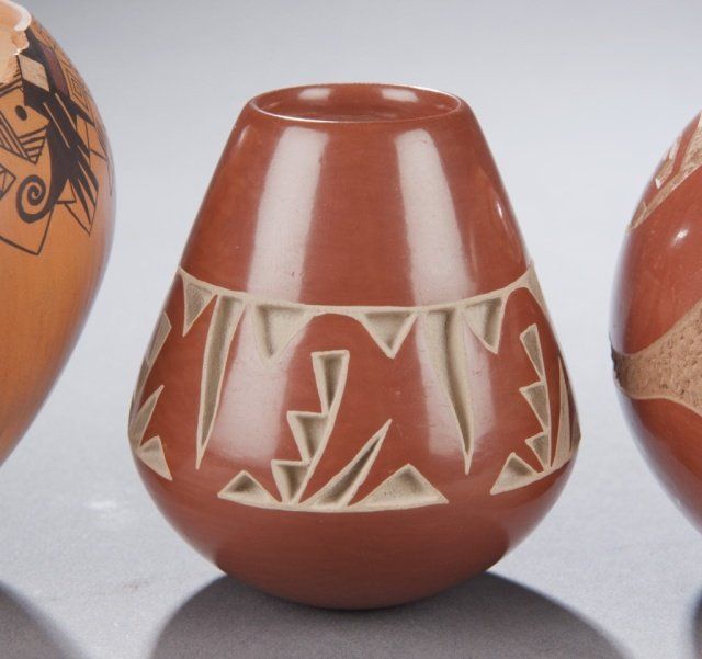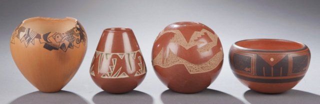 A group of 4 assorted Native American vessels. A small Maria Suazo pot signed "Marie Suazo Santa Clara Pueblo". 2 3/4"h x 2 1/4"d. A signed Koopee bowl 2"h x 3 1/2"d. A signed Koopee bowl 3"h x 3 1/4"d. A Jennifer Tse Pe signed redware pot 3"h x 3"d.