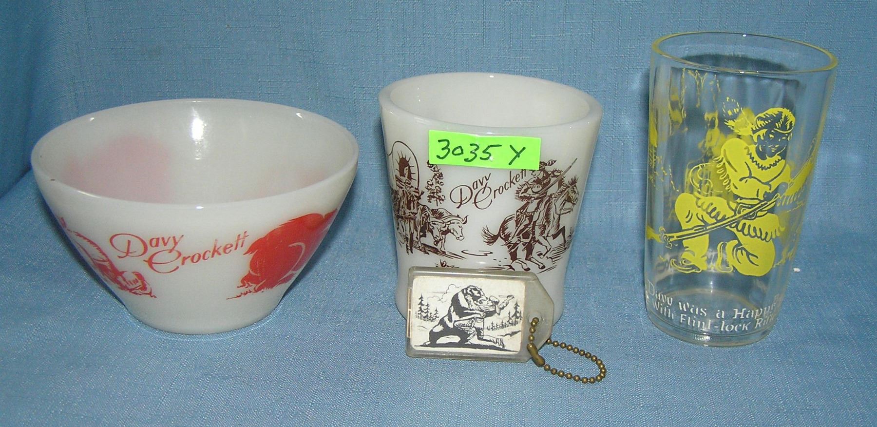 Group of 4 early Davy Crocket Collectable pieces includes a Fire King cup, Fire King bowl, early drinking glass and key chain est. value $150.00-$200.00
