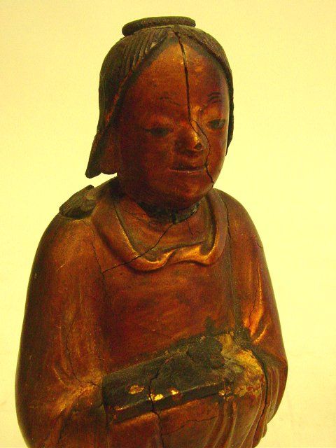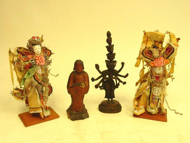 Including: 2- China dolls, approx. 12" H. 1- Bronze Tibetan God, approx. 12" H. 1- Lacquered "Servant Girl", 18-19th c., as is, approx. 8" H. From the estate of a Queens, NY collector. Please read our terms of sale.