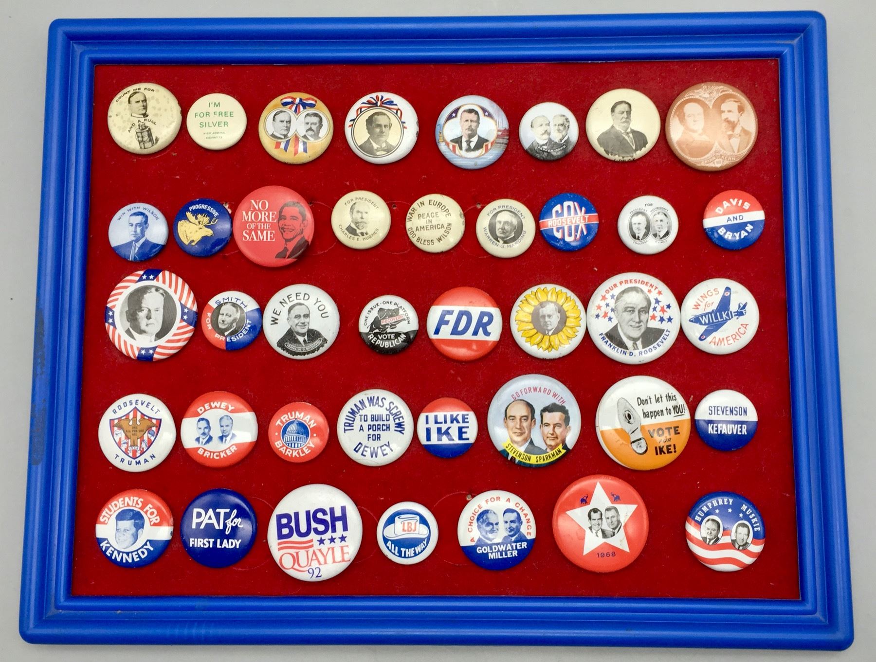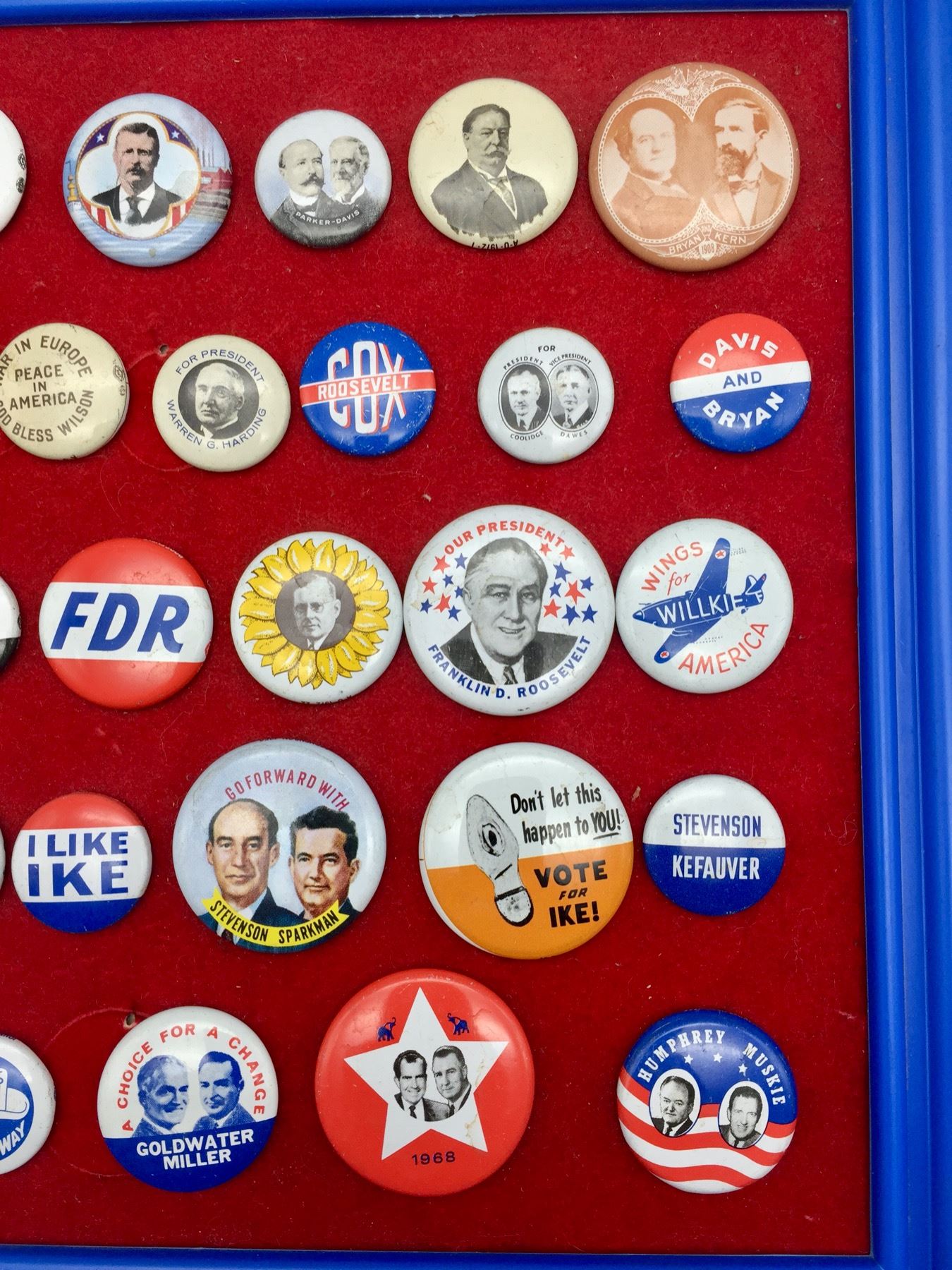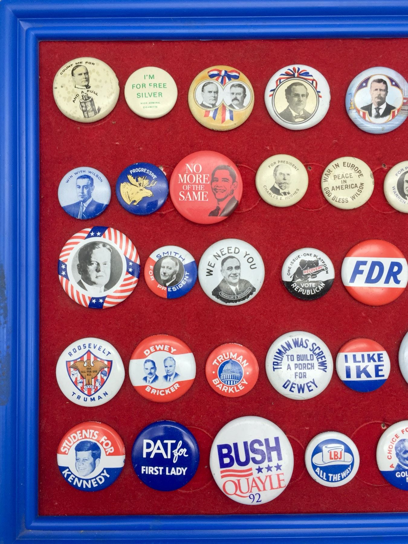 Description: Presented for sale in this lot is a group of 41 vintage campaign buttons. They are from various eras and vary in size and design. They are mounted on a red velvet covered piece of cardboard in a frame. Ready for display or they can be easily removed. Maker: Various. Approx. Age: Vintage to modern. Size: Frame measures 9-1/2 inches wide x 12 inches long Condition: Pretty good for their ages, normal wear expected. Please look closely at the pictures - they are an important part of our description. Shipping: There will be a $5 handling, packaging fee for shipping this lot. The actual cost of postage will be added on top of that.