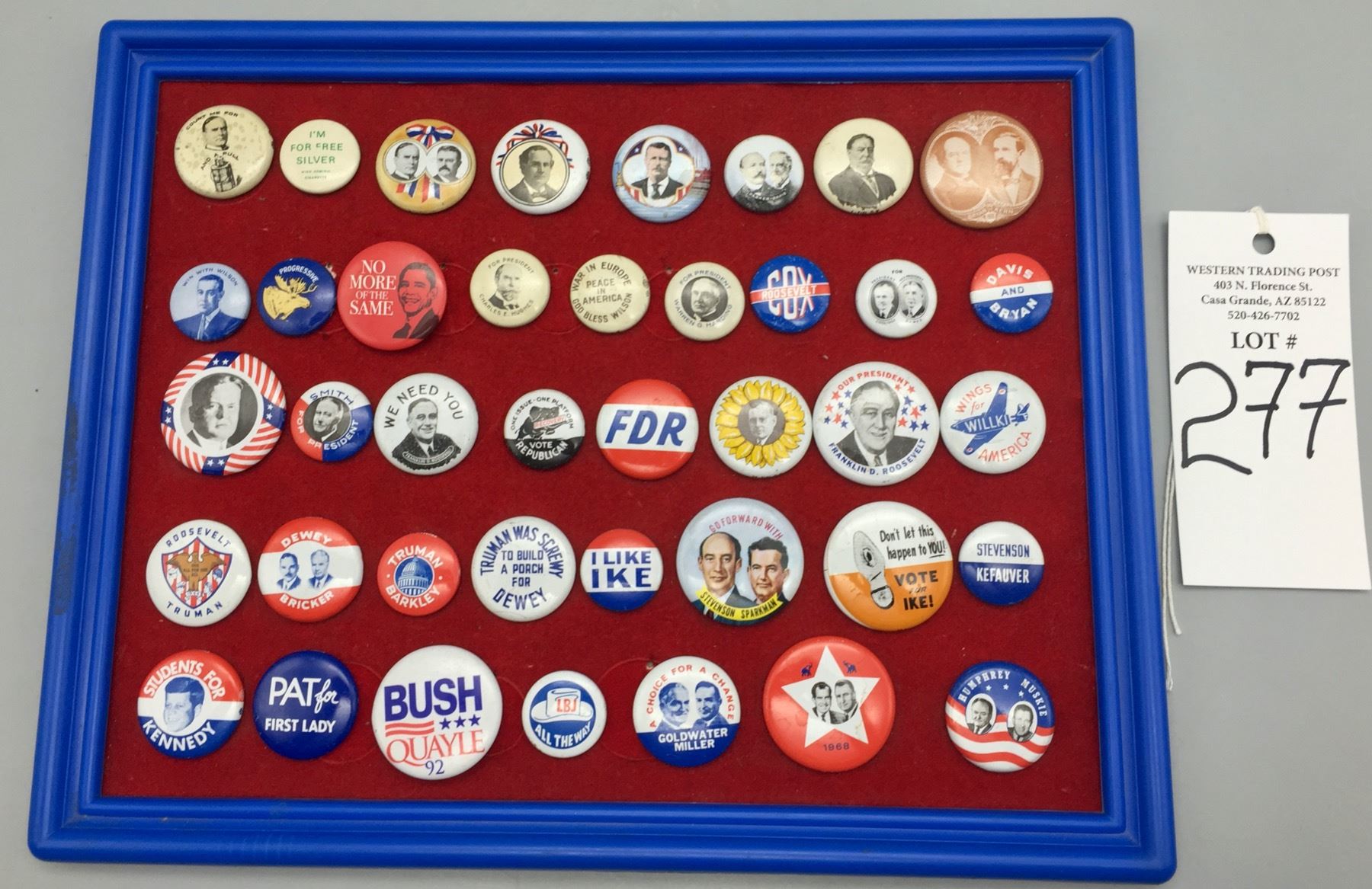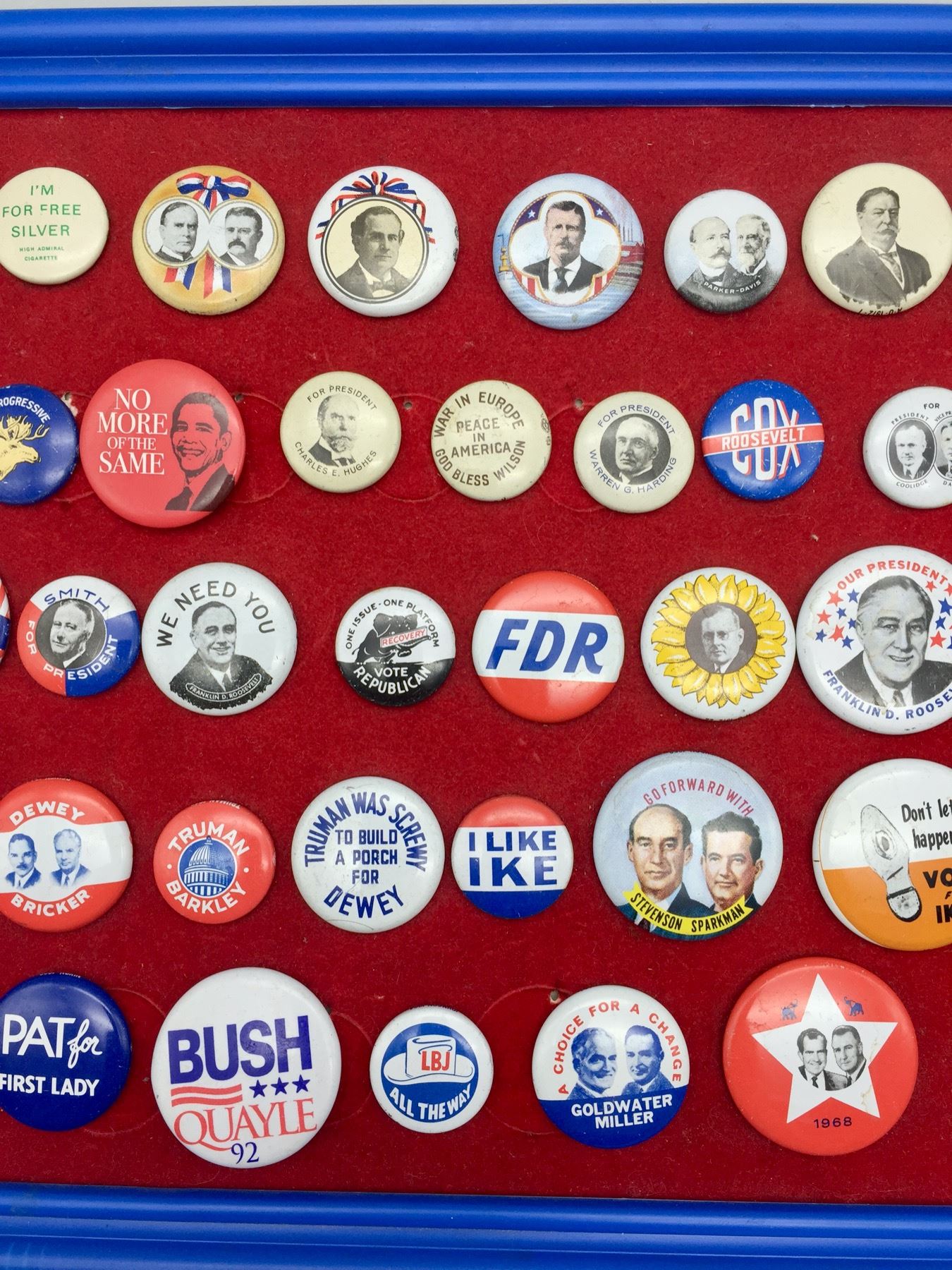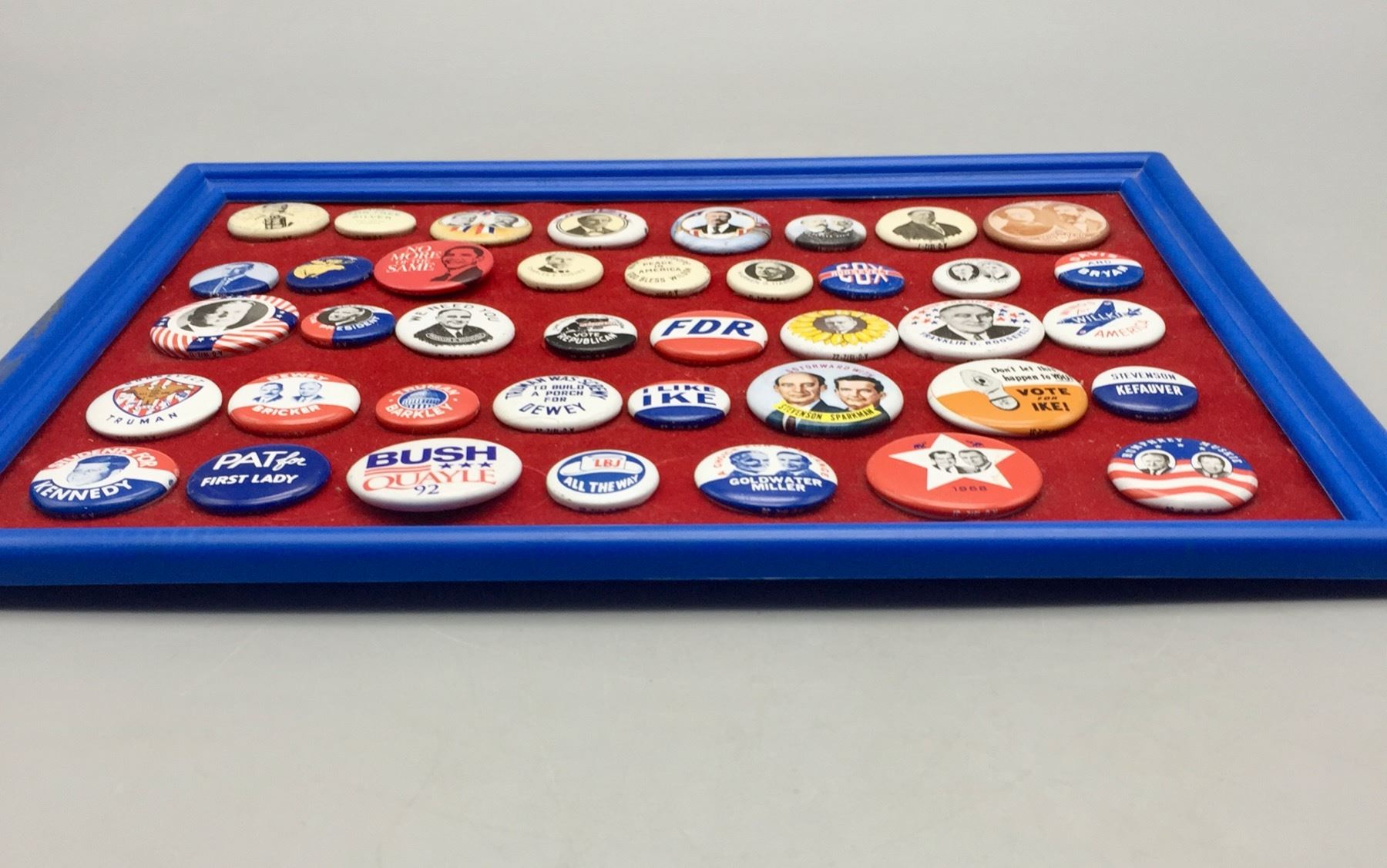 Description: Presented for sale in this lot is a group of 41 vintage campaign buttons. They are from various eras and vary in size and design. They are mounted on a red velvet covered piece of cardboard in a frame. Ready for display or they can be easily removed. Maker: Various. Approx. Age: Vintage to modern. Size: Frame measures 9-1/2 inches wide x 12 inches long Condition: Pretty good for their ages, normal wear expected. Please look closely at the pictures - they are an important part of our description. Shipping: There will be a $5 handling, packaging fee for shipping this lot. The actual cost of postage will be added on top of that.
