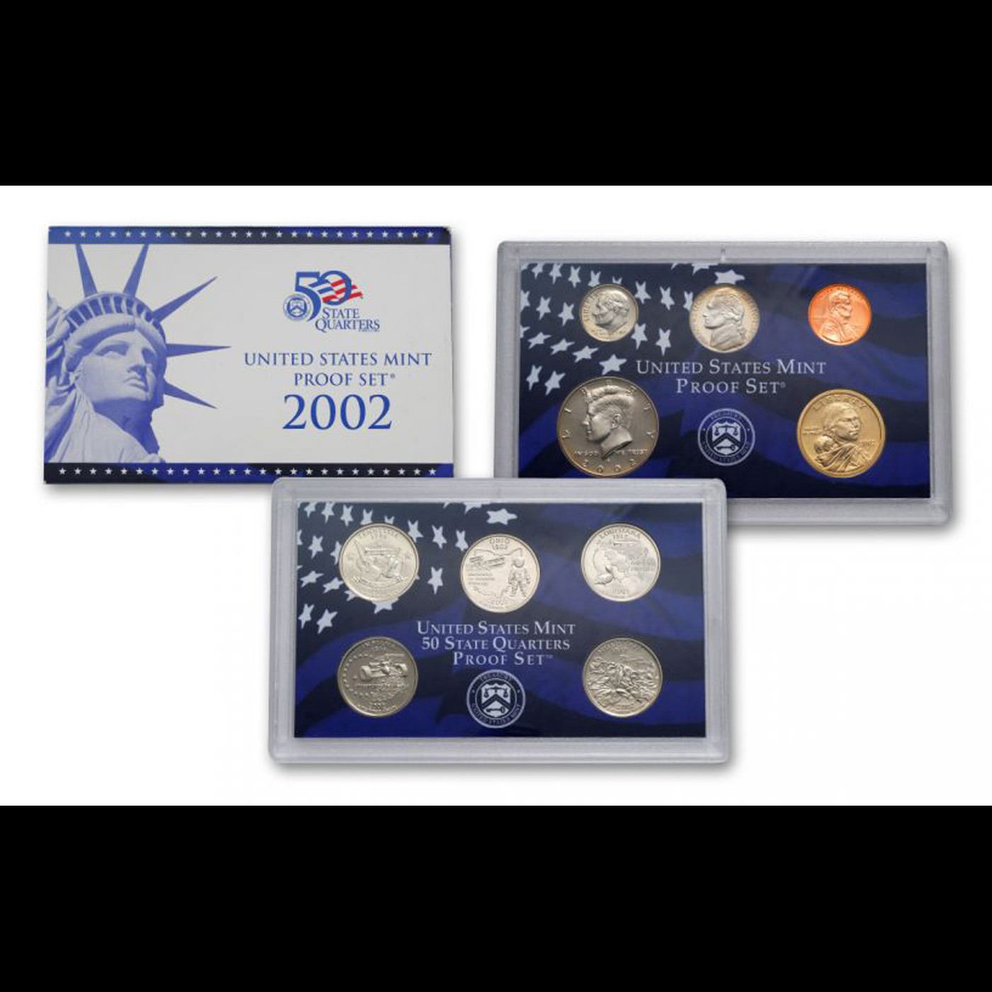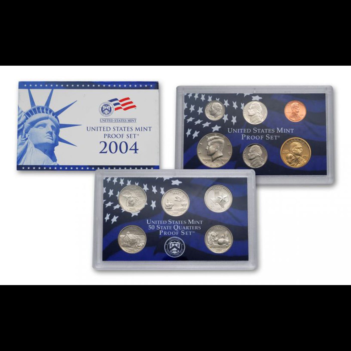 Group of 5, 2000-2004 Mint Proof Set In Original Case,50 coins. Group of 5 2000-2004. Each set contain a Lincoln Cent, a Jefferson Nickel, a Roosevelt Dime, a Kennedy Half Dollar and a Sacagawea Dollar. Along with 5 states coins in each set . All coins were struck at the San Francisco Mint and carry the “S” mint mark. The cent, nickel, dime, and half dollar were sealed in a single lens with a decorative blue insert. The five State Quarters were sealed in a separate plastic lens. The two lenses were packaged with a certificate of authenticity in a cardboard box with the Statue of Liberty featured prominently.