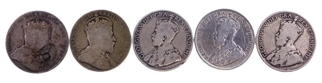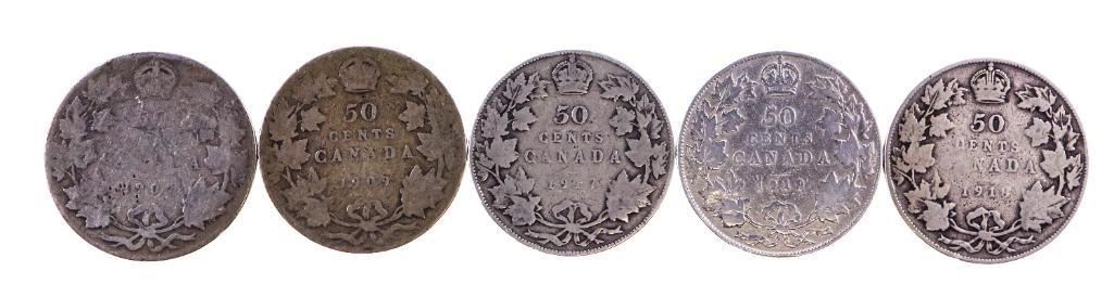 Group of 5 Canada Historical Silver 50 Cents -Edward & George V - 1907,08,17,18,19.