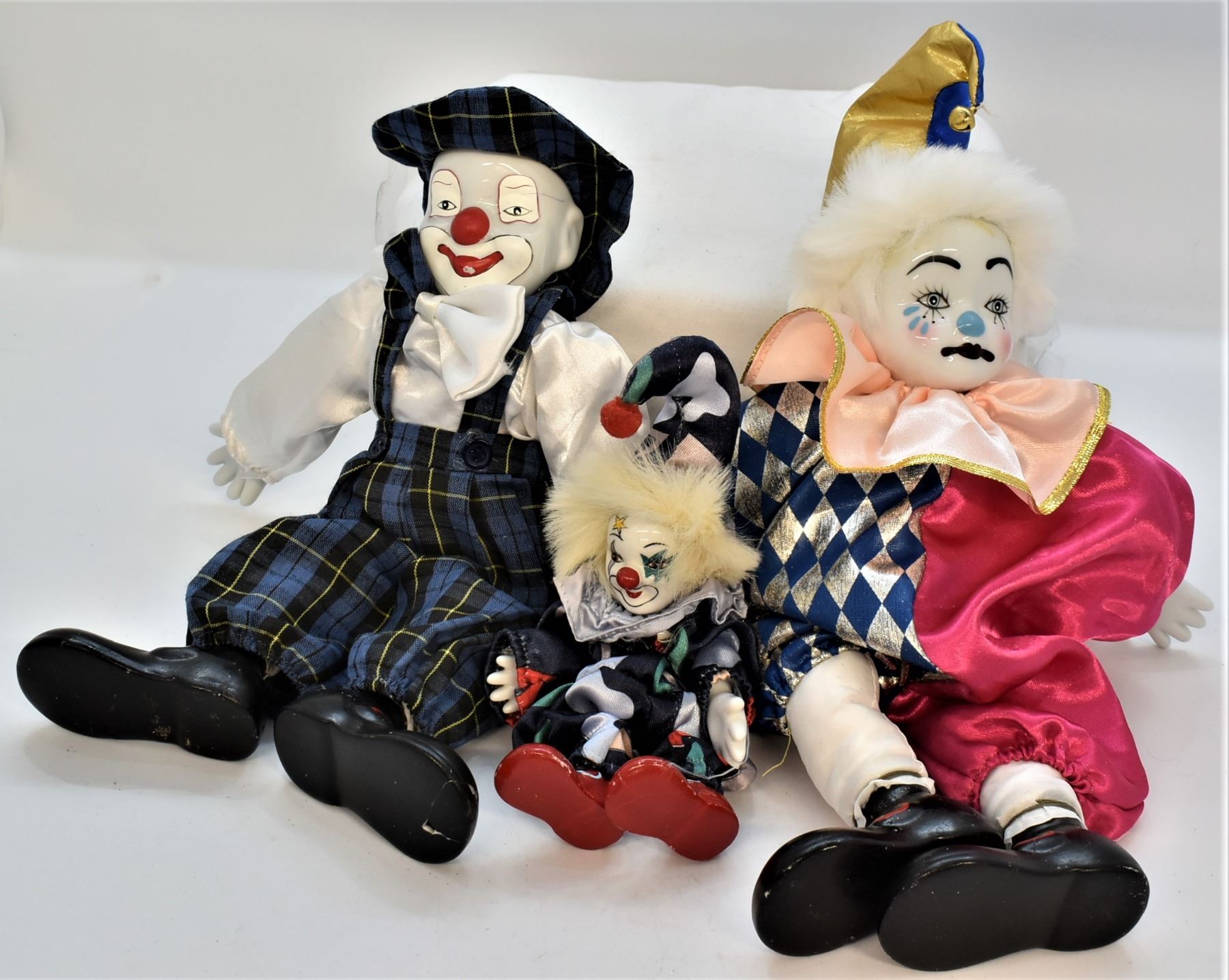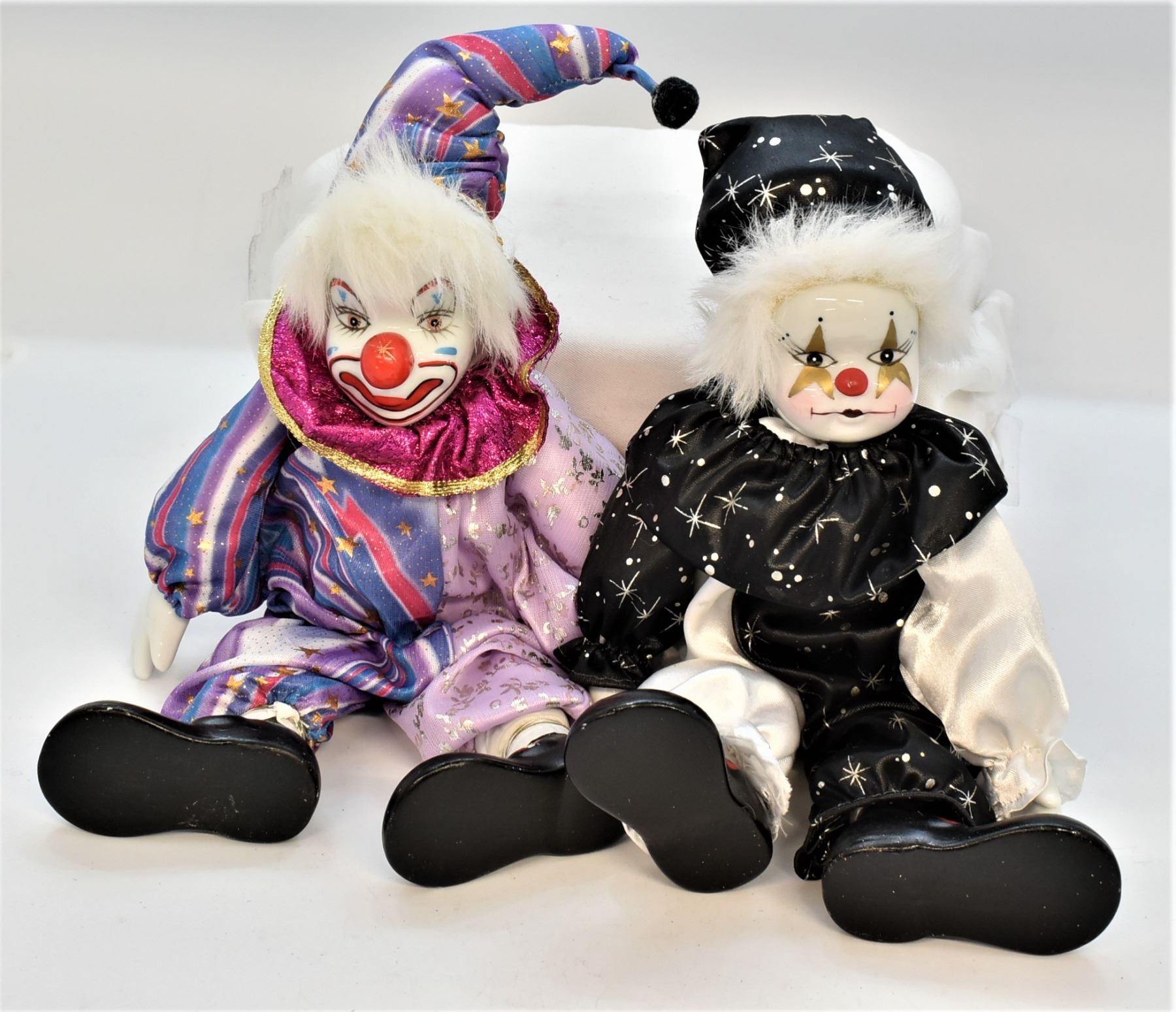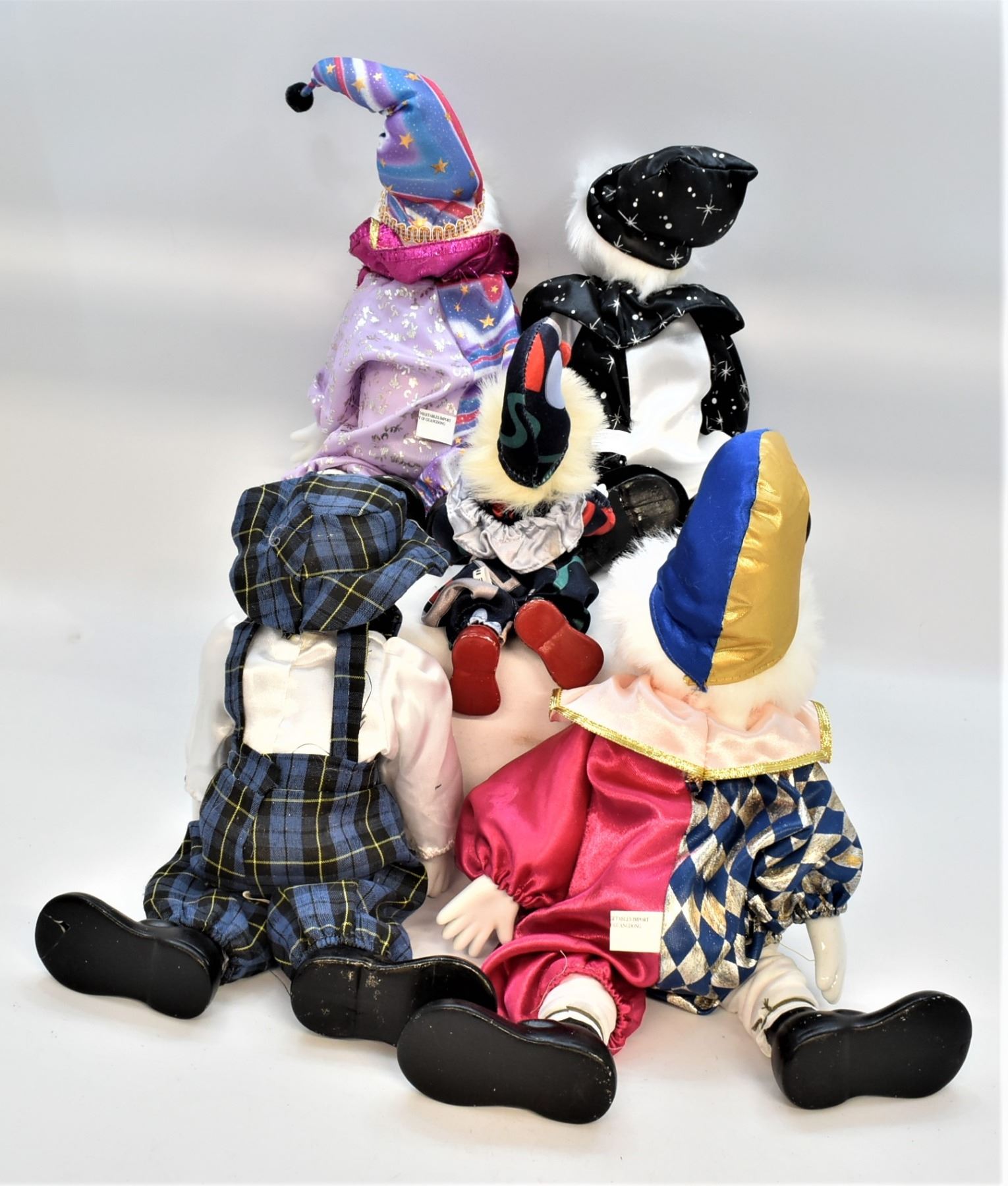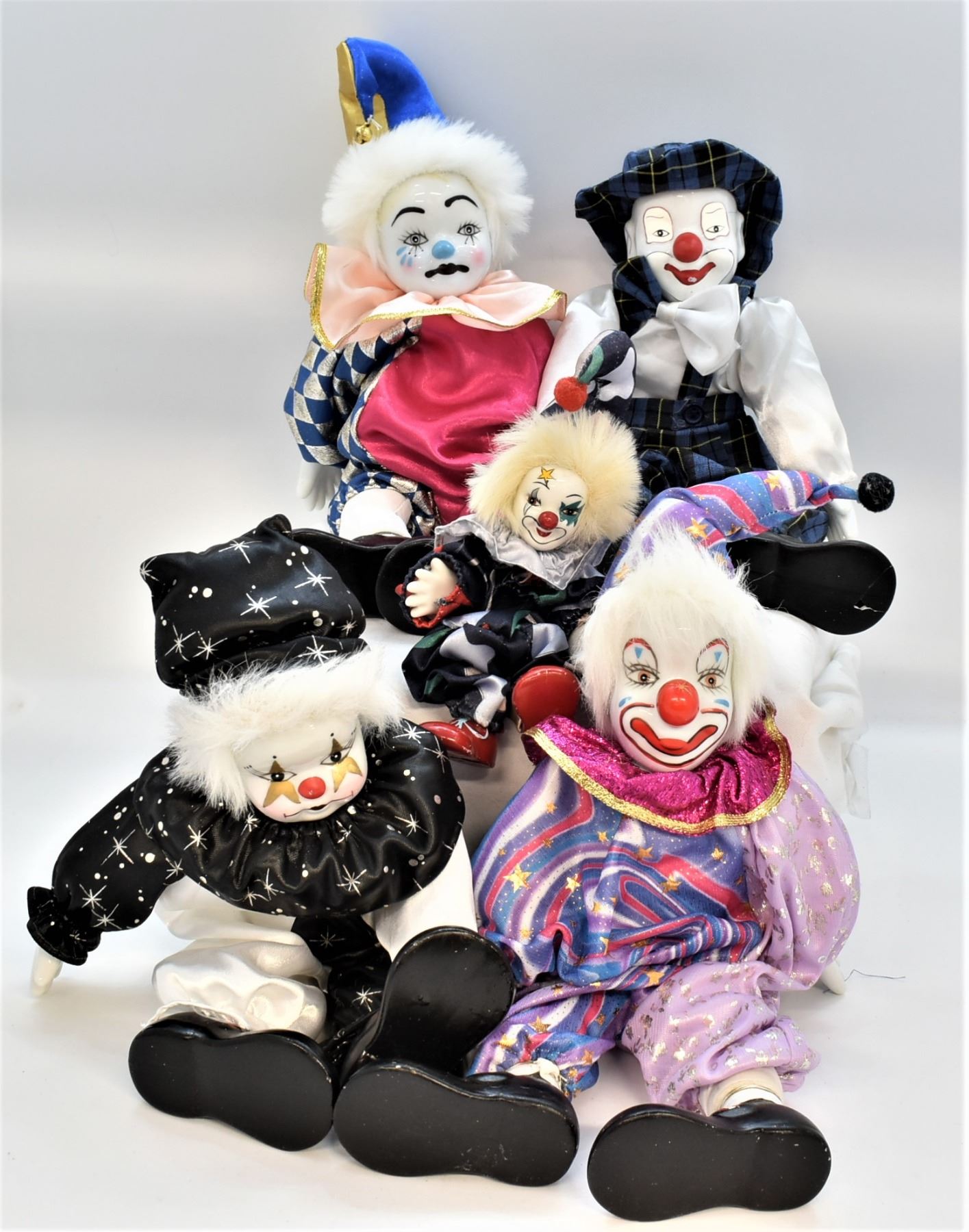 Group of 5 Clowns, largest measures 15.75''L x 6.5''W, the clown with the plaid suit on has damage to his shoe