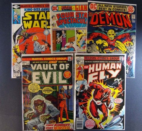 Human Fly #1 Sept 1977 Exceptionally Clean & Bright. Easily a "VF" Book. Vault of Evil #1 Feb 1973 Water Stain at Bottom of Spine. Light Overall Wear. "VG" The Demon #1 Sept 1972 Kirby Art "Good". Four Star Spectacular #1 April 1976. Almost no handling wear, but a little smudgy on the back. Still, an easy "F to VF" book. Star Wars Annual #1 1979. A little puckering along the spine, but virtually no handling wear. A Bright, Clean "VF" book. Est. Value $35.00 - $45.00