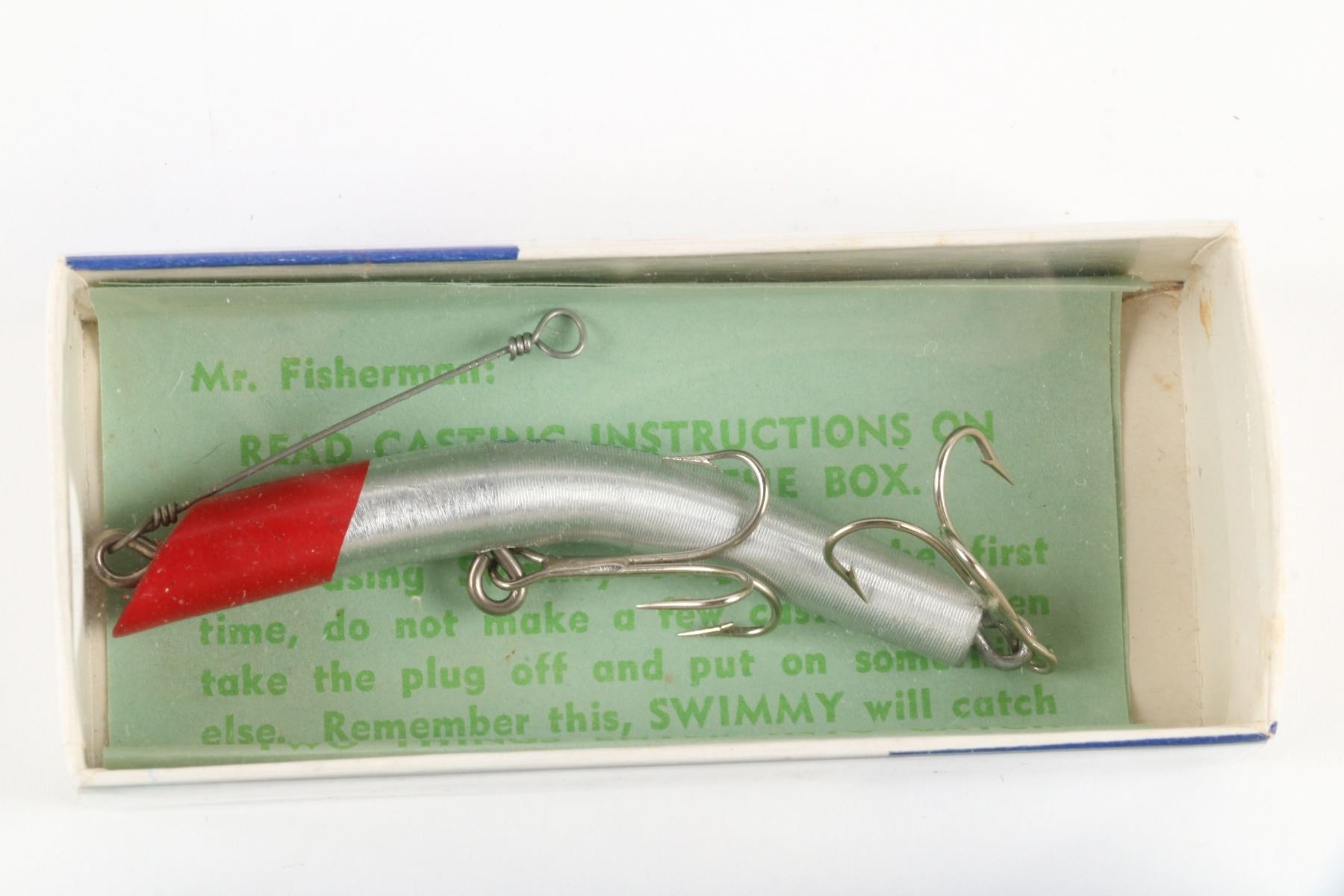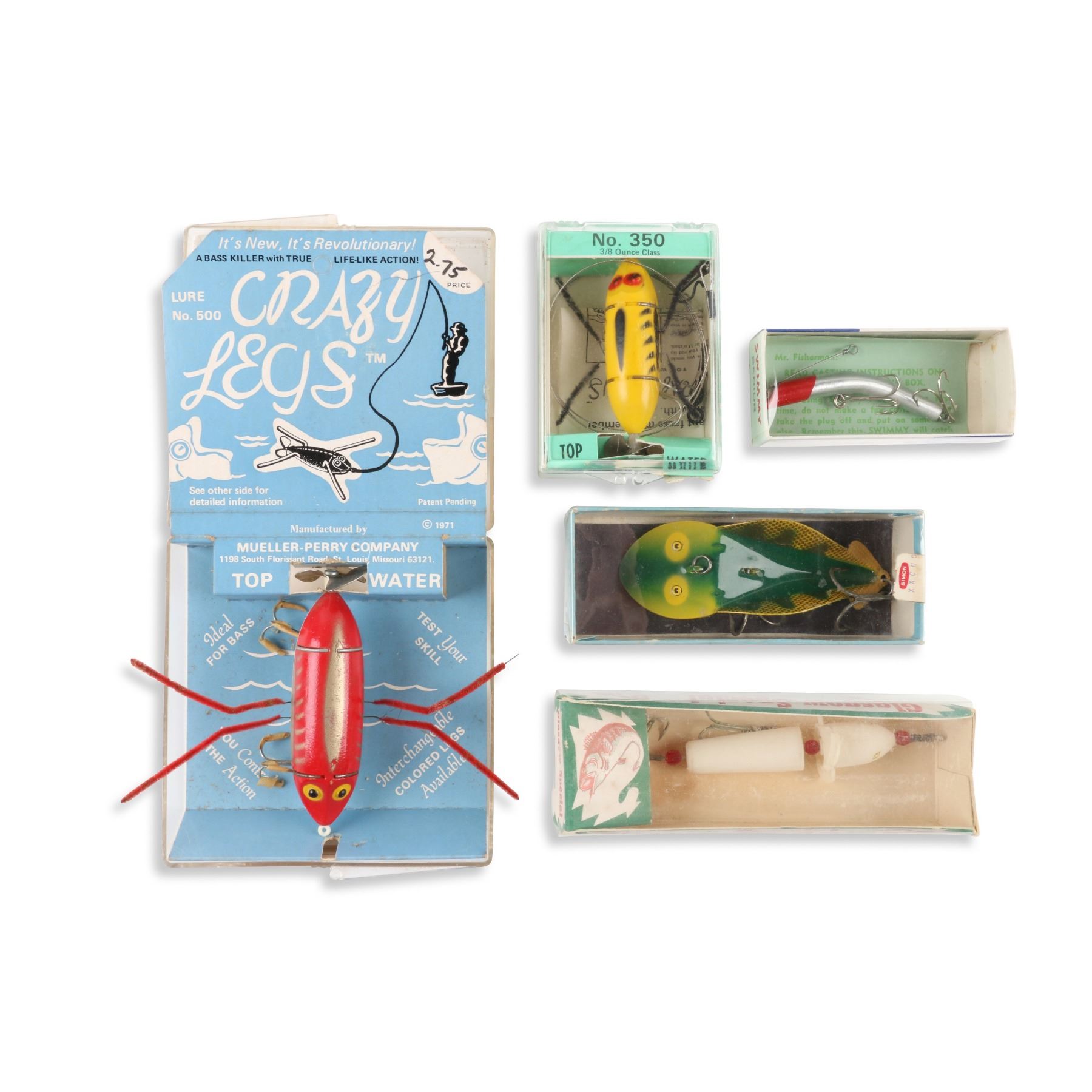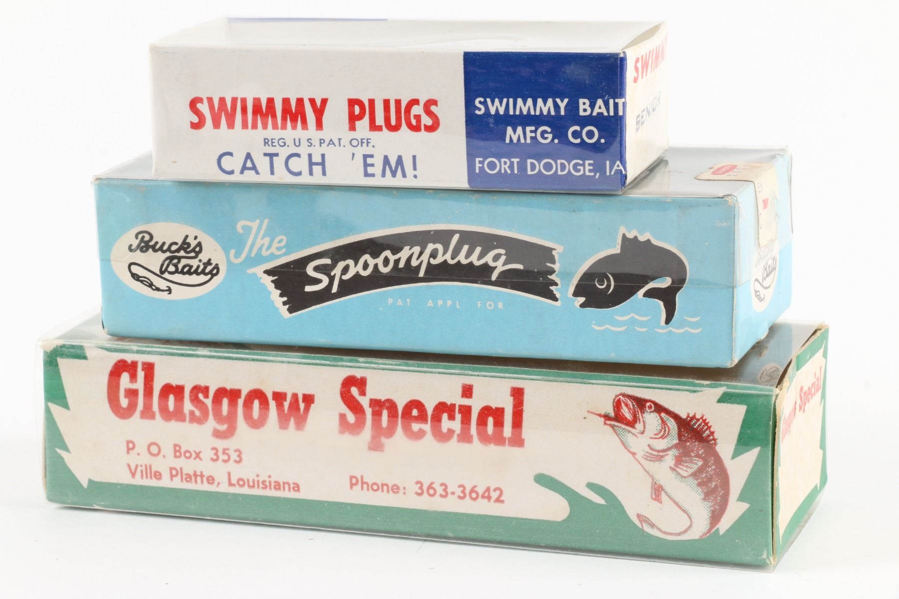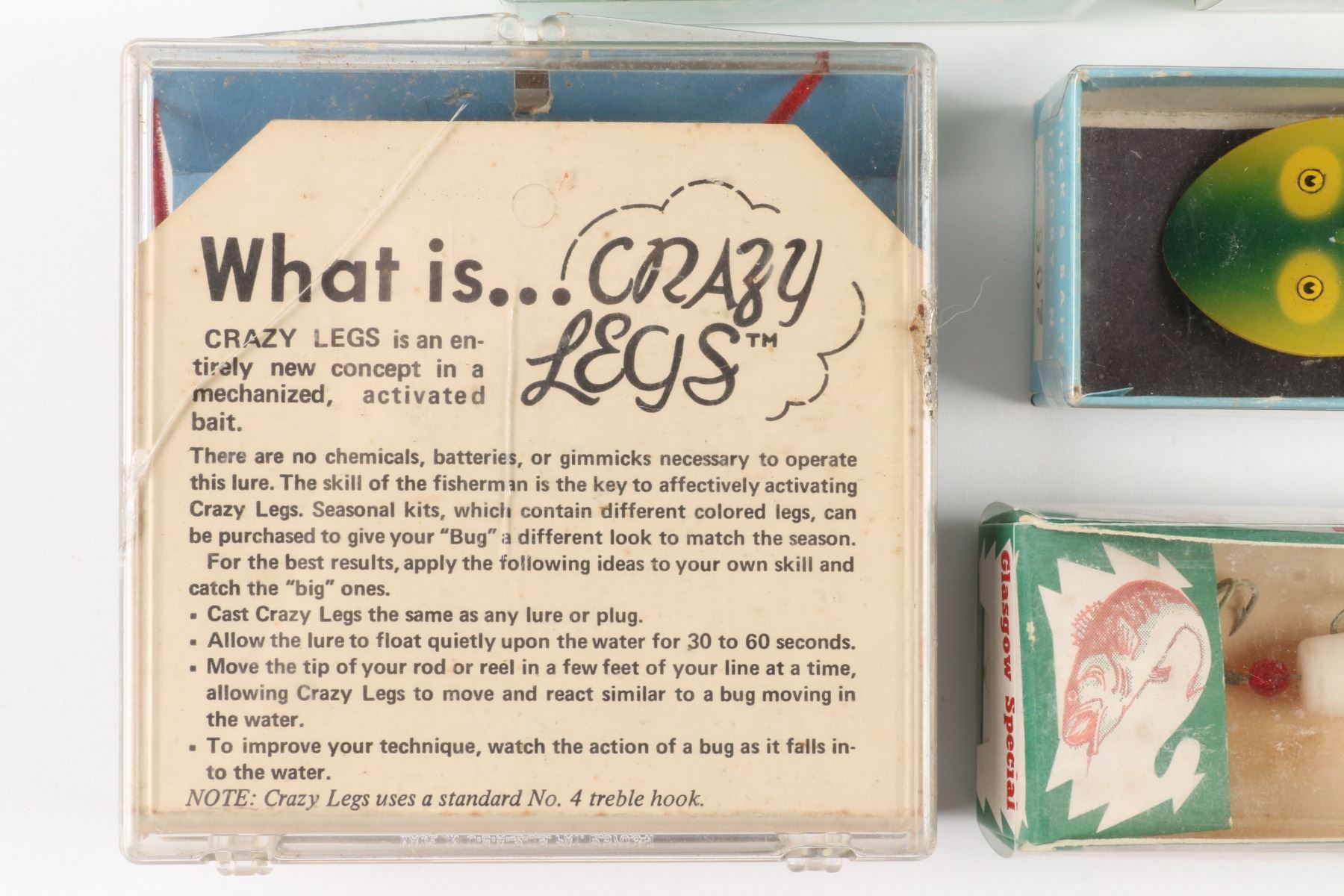 Swimmy Plugs, Crazy Legs, Glasgow Special, Spoonplug, United States. Boxed. Material: Mixed. Quantity: 5. Grade: VG. 3" - 4.5" Est. $75-100.