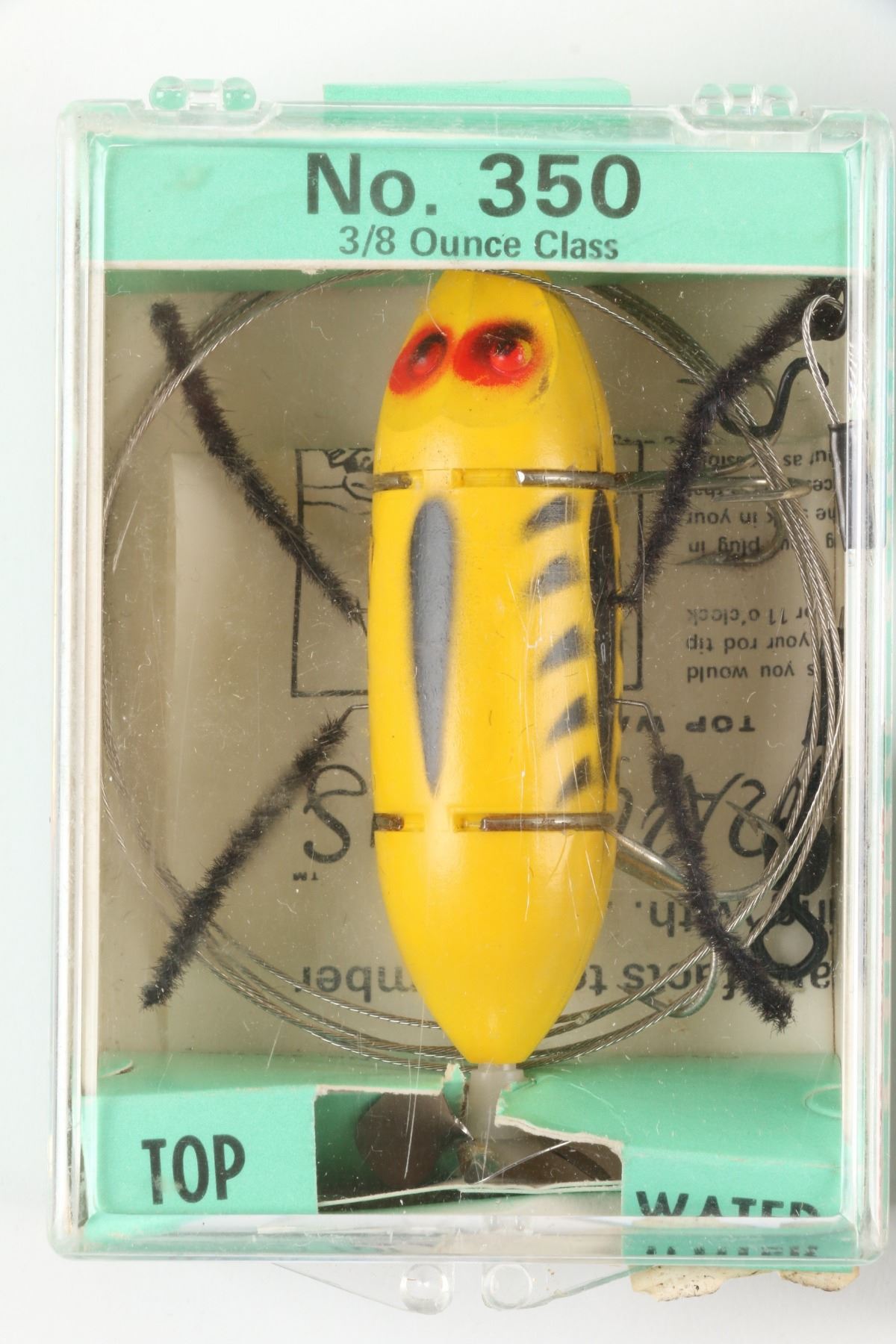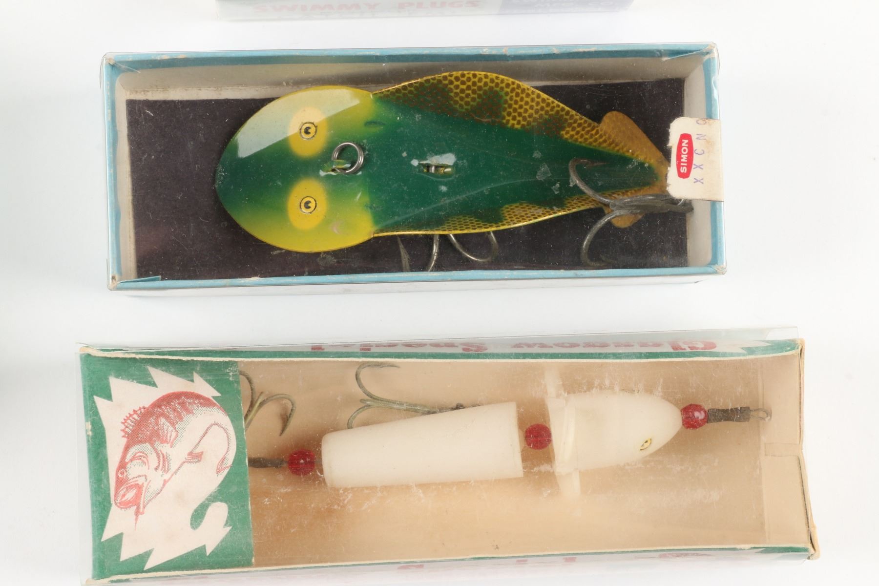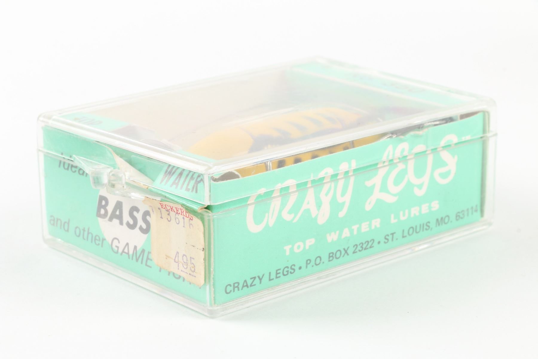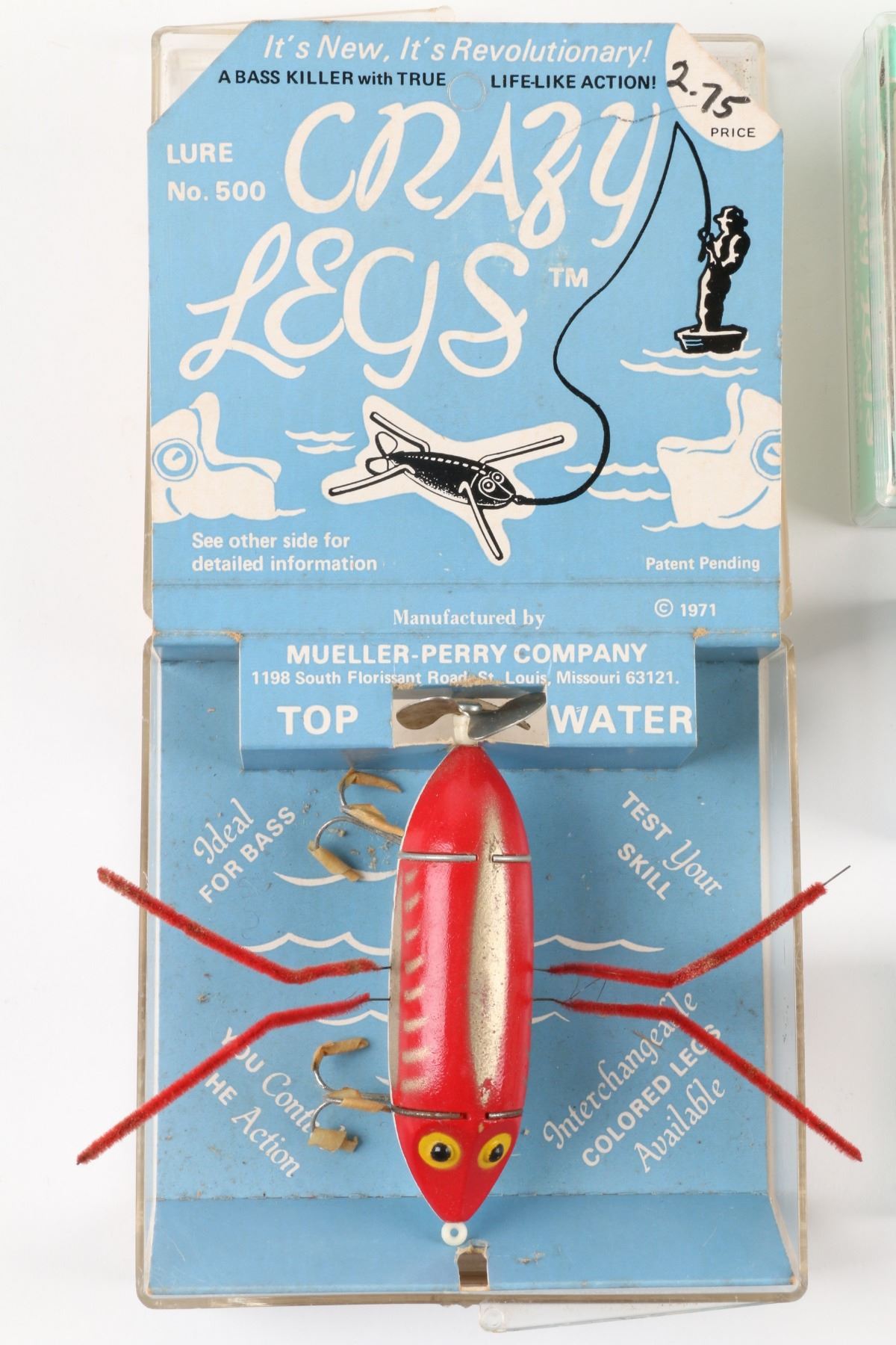Swimmy Plugs, Crazy Legs, Glasgow Special, Spoonplug, United States. Boxed. Material: Mixed. Quantity: 5. Grade: VG. 3" - 4.5" Est. $75-100.