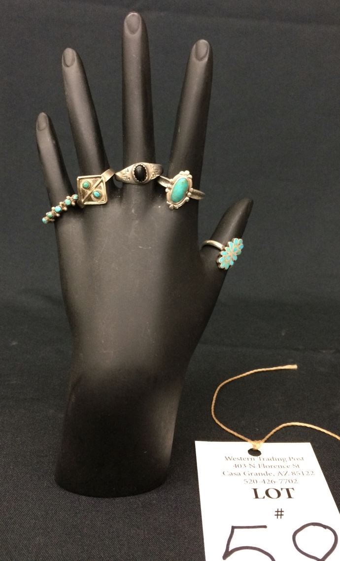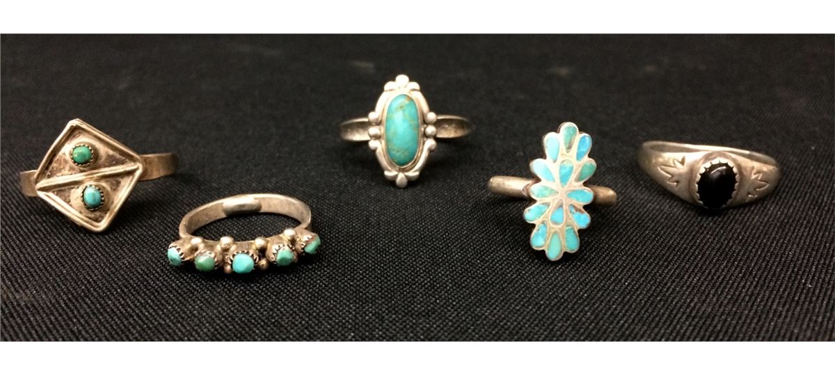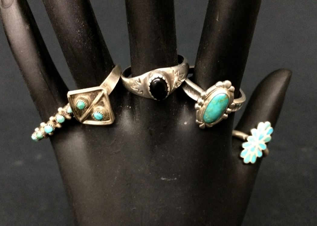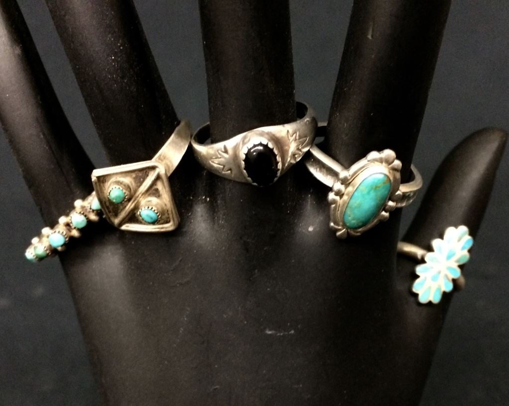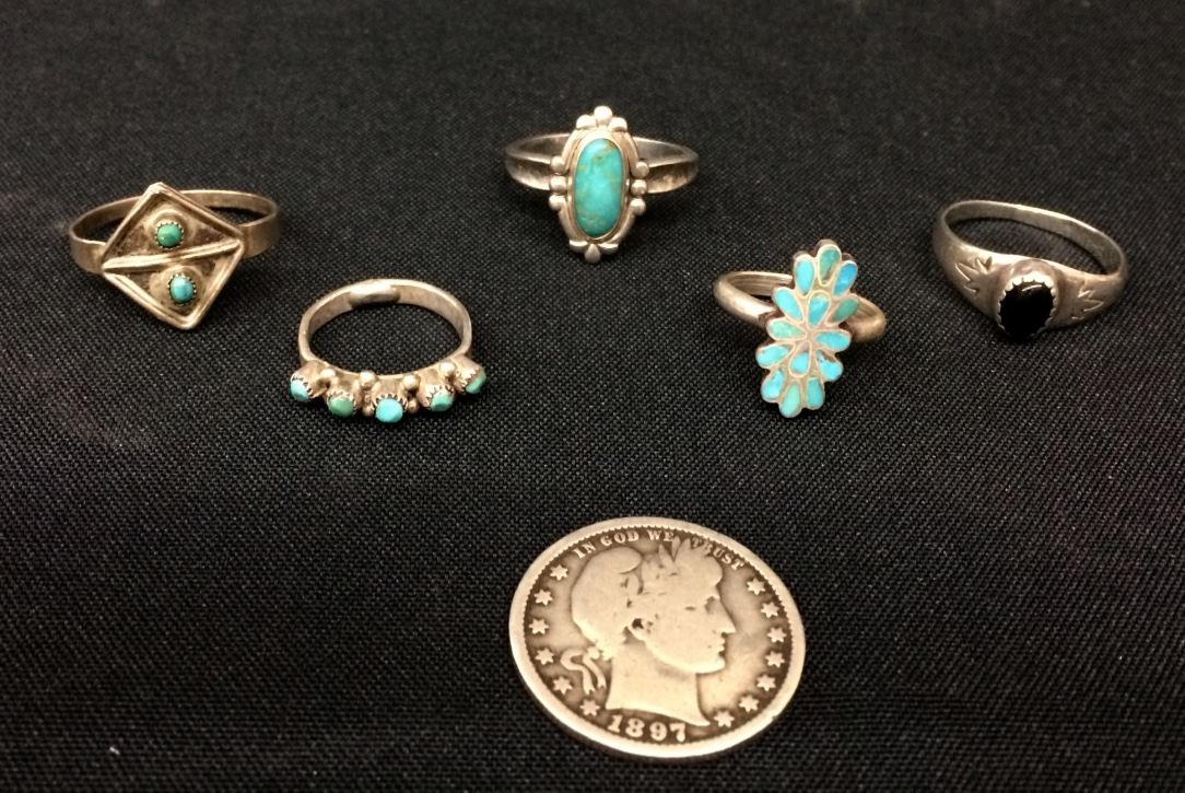 You get all 5 of these rings for 1 money! One is marked with the early Bell Trading Post mark and one other is stamped sterling, otherwise, no markings (as was common on Native American Jewelry made in the 1970s and prior). They are sizes: 3, 4, 7.5, 8 and 8.5. Weigh approx. 13g. Good condition for their age. Shipping: There will be a $5 handling / packaging fee for shipping this lot. The actual cost of postage will be added on top of that.