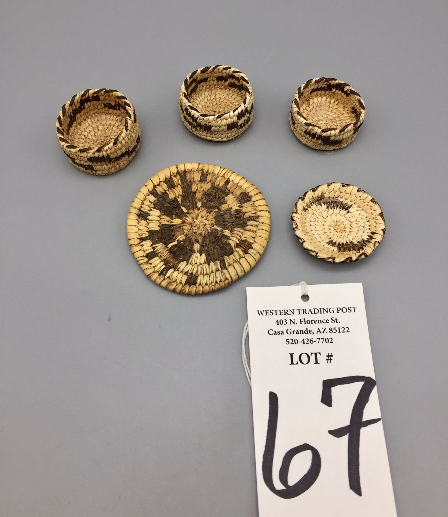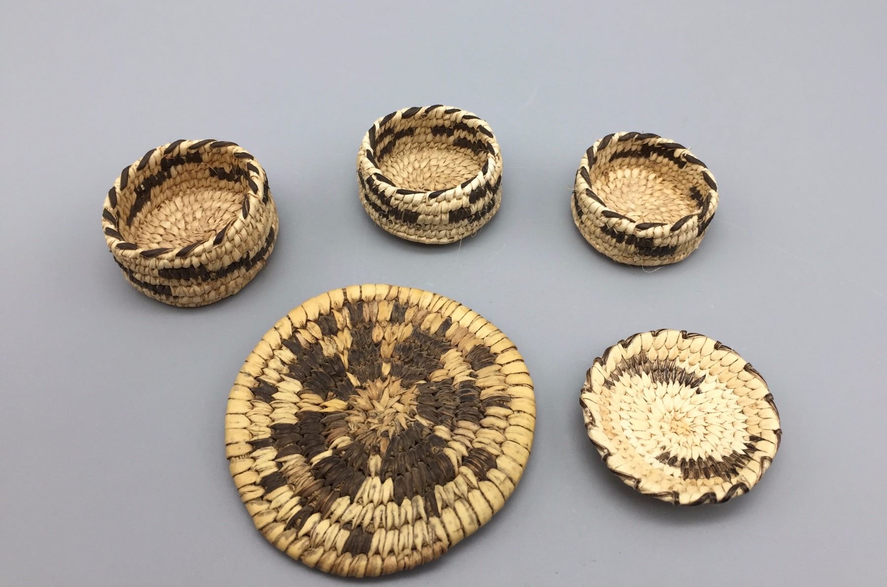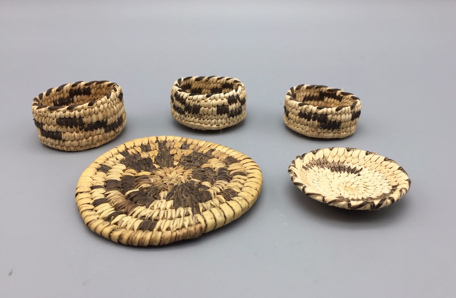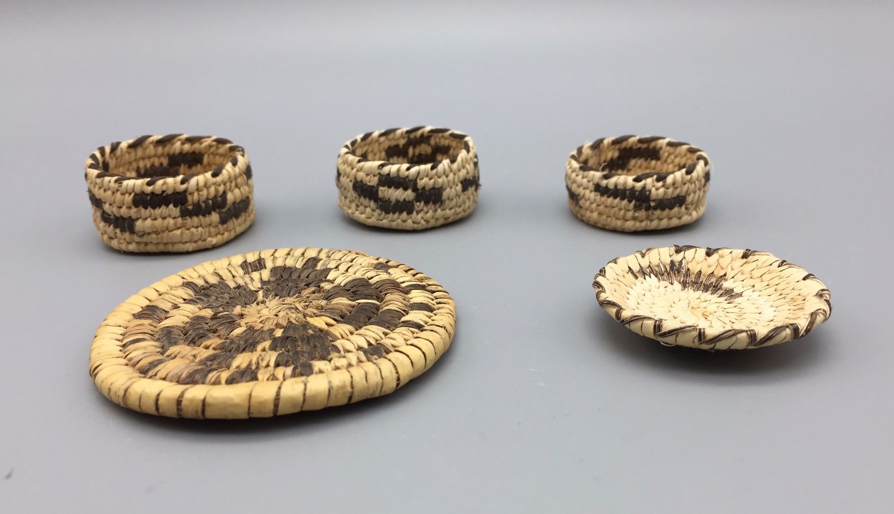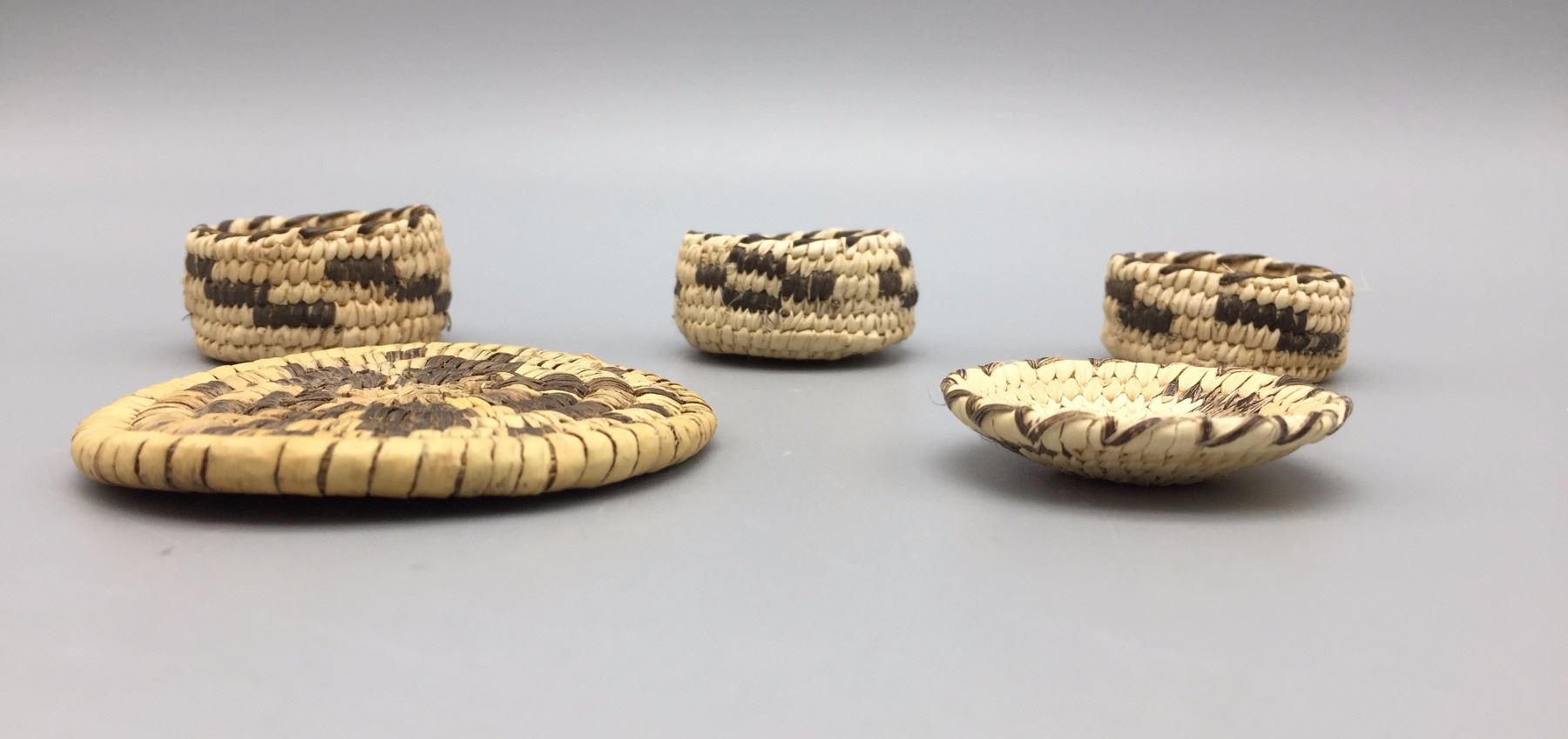 Maker: Unknown Tohono O’odham weaver(s). Approx. Age: Vintage. Size: Measure 1 3/8” to 2 5/8” across. Additional Info: Group of 5 miniature baskets. Condition: Good for their age, normal wear expected. Please look closely at the pictures - they are an important part of our description. Shipping: There will be a $5 handling / packaging fee for shipping this lot. The actual cost of postage will be added on top of that.