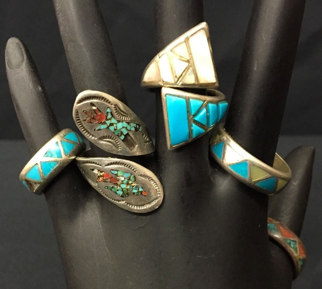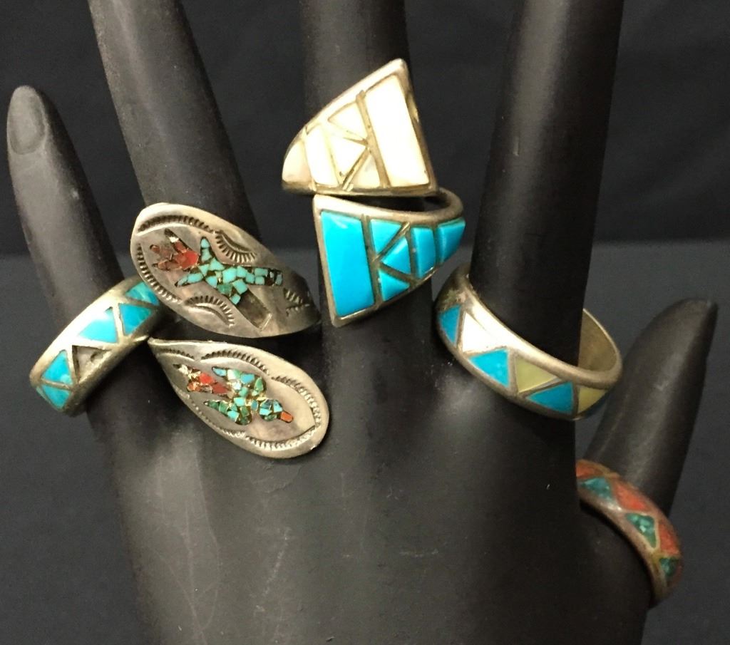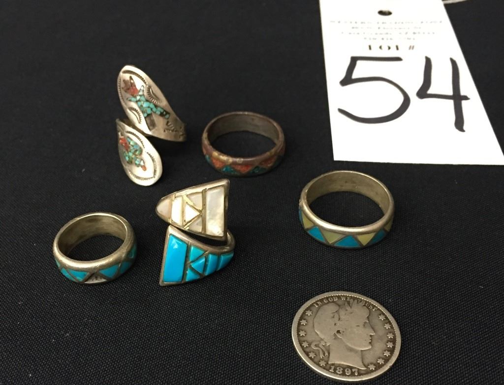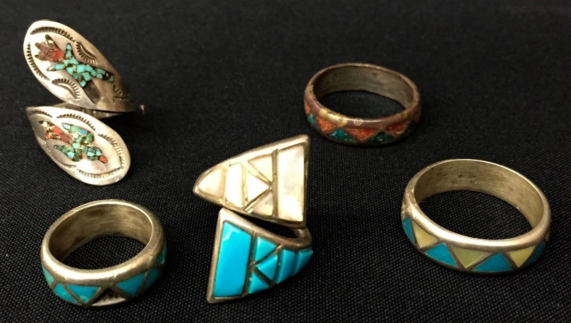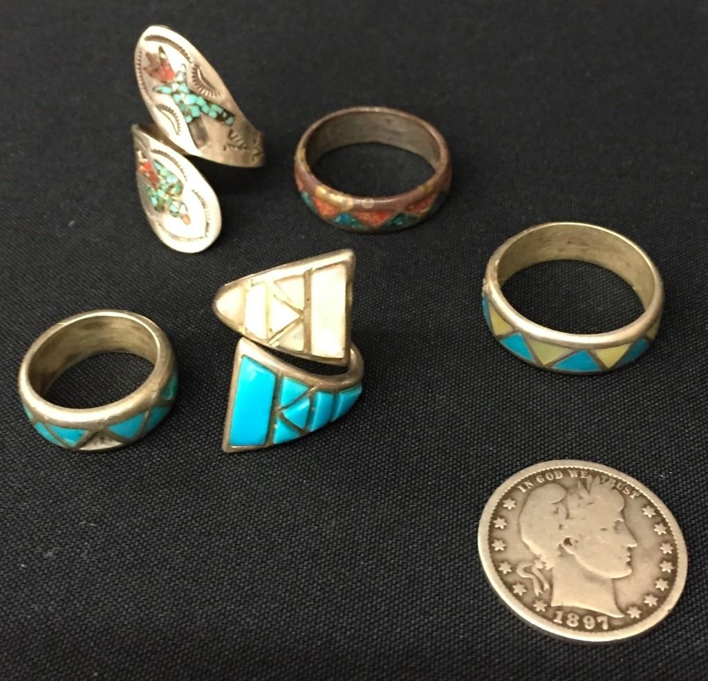 There are 5 vintage rings for 1 money. Various styles and sizes. All are set in sterling. Collectively they weigh 31.8 g. Please look closely at the pics as they are an important part of our description. Shipping: There will be a $5 handling / packaging fee for shipping this lot. The actual cost of postage will be added on top of that.