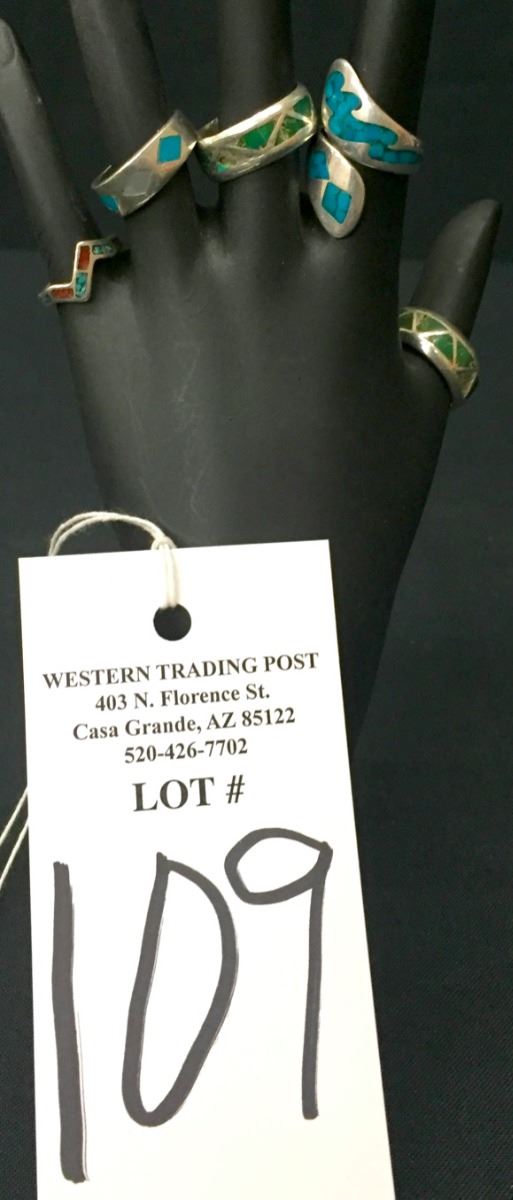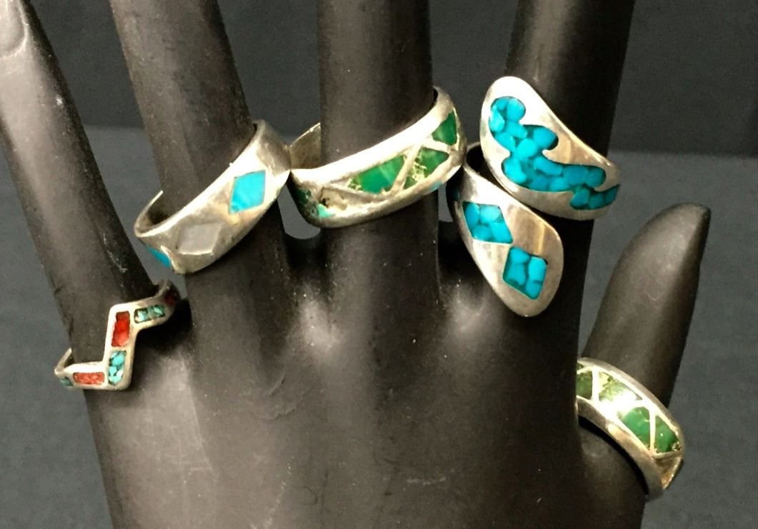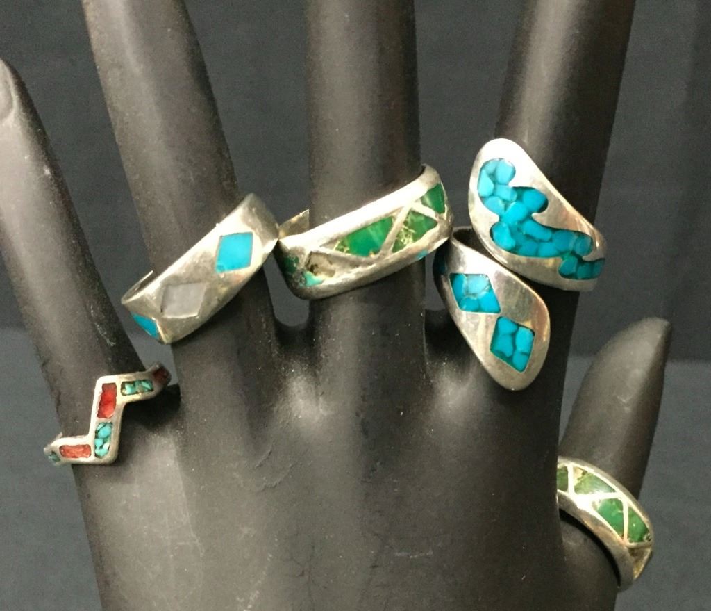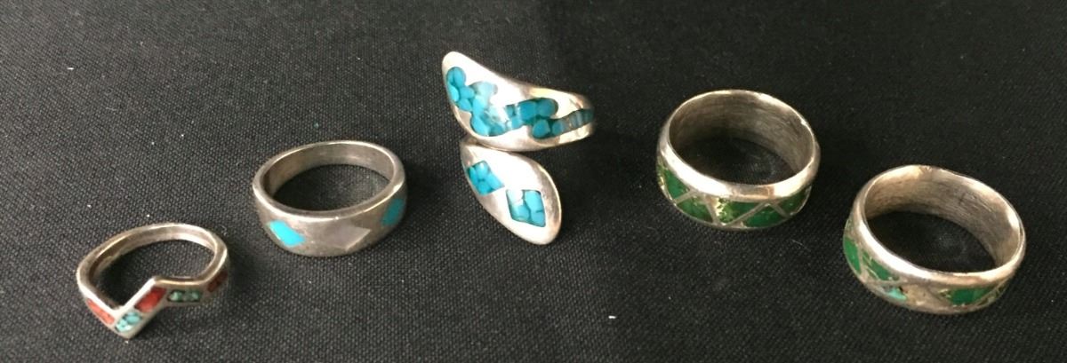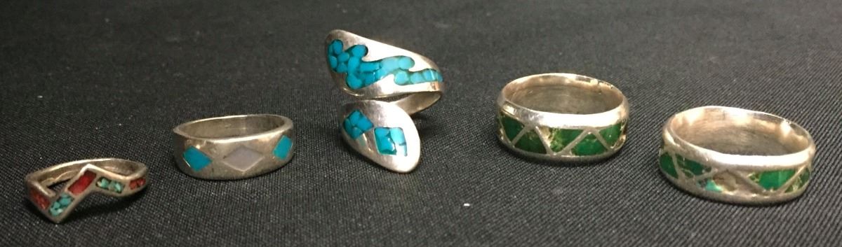 These five rings weigh 22.9 g collectively. Various sizes and styles. Tested as Sterling.