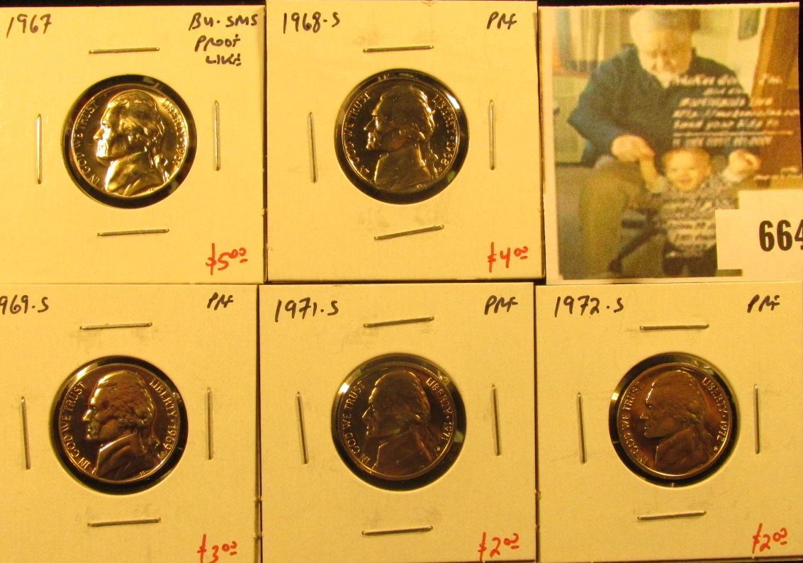 Group of (5) PROOF Jefferson Nickels, 1967 BU/SMS (proof-like), 1968-S, 1969-S, 1971-S, 1972-S, group value $16