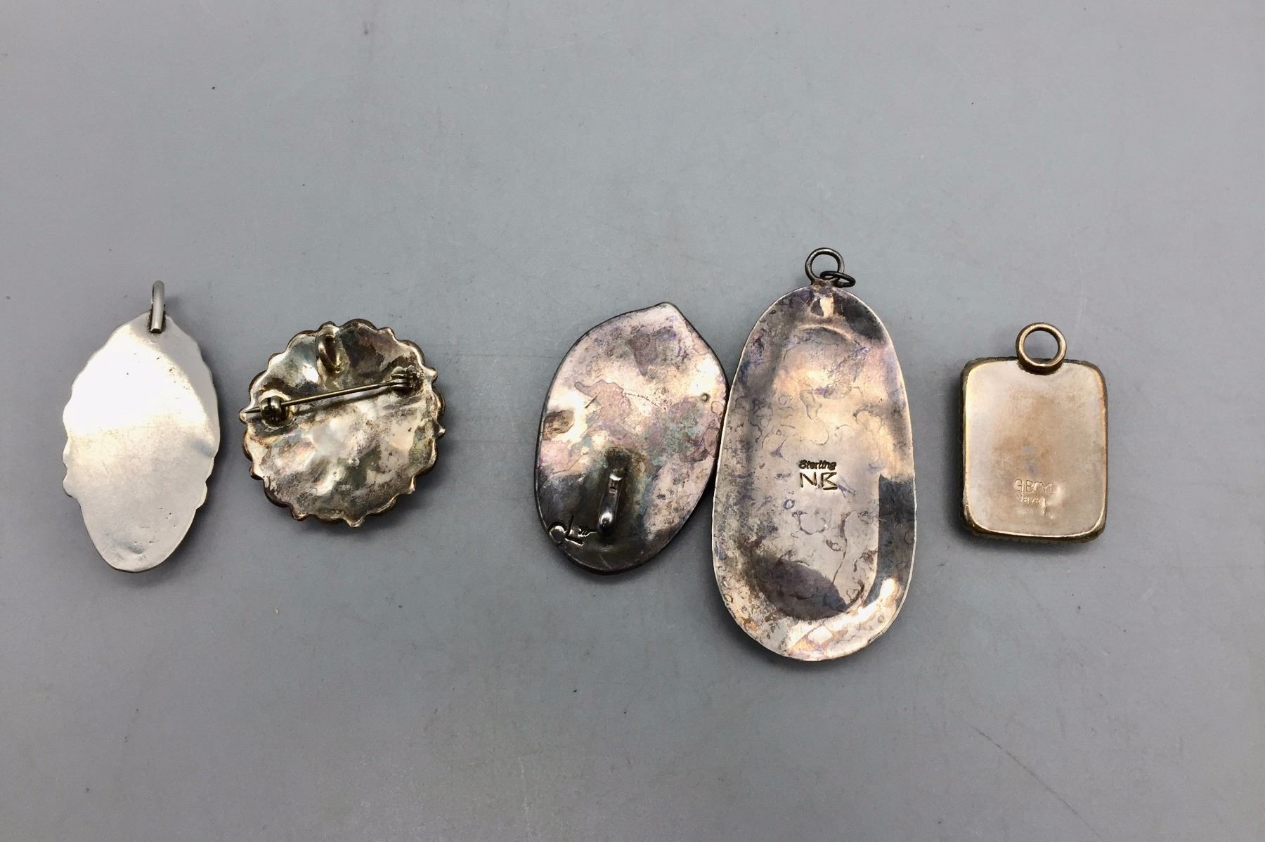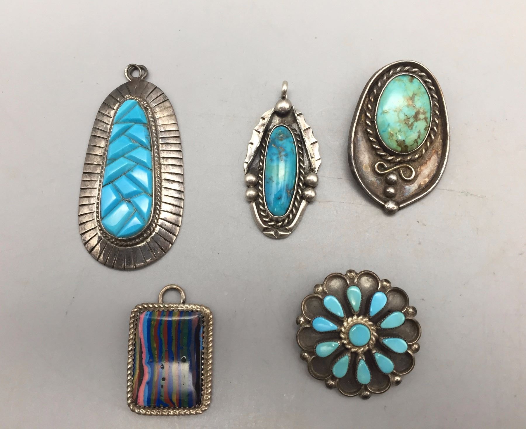 Description: Group of 5 sterling silver and turquoise pendants/pins. Maker: Various. Approx. Age: Various. Size: Sizes range from 1” l x 3/4” w to 2 1/2” l x 1 1/4” w. Combined weight, 56.7 g. Condition: Good for their ages, normal wear expected. Please look closely at the pictures - they are an important part of our description. Shipping: There will be a $5 handling / packaging fee for shipping this lot. The actual cost of postage will be added on top of that.