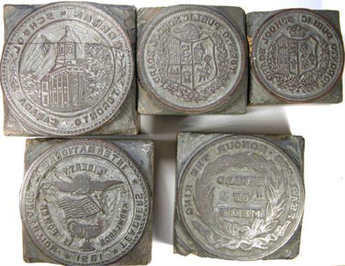 Leroux 1331a, Toronto Public School Board, Carved Wood Printing Block for obverse. Plus Leroux 1331b, Toronto Public School Board, Carved Wood Printing Block for obverse and Leroux 1331c, Toronto Normal School International Teachers Convention 1891, a pair of Carved Wood Printing Blocks for obverse and reverse. Plus Leroux 480, Halifax National School Reward of Merit, Carved Wood Printing Block for reverse. Total five pieces