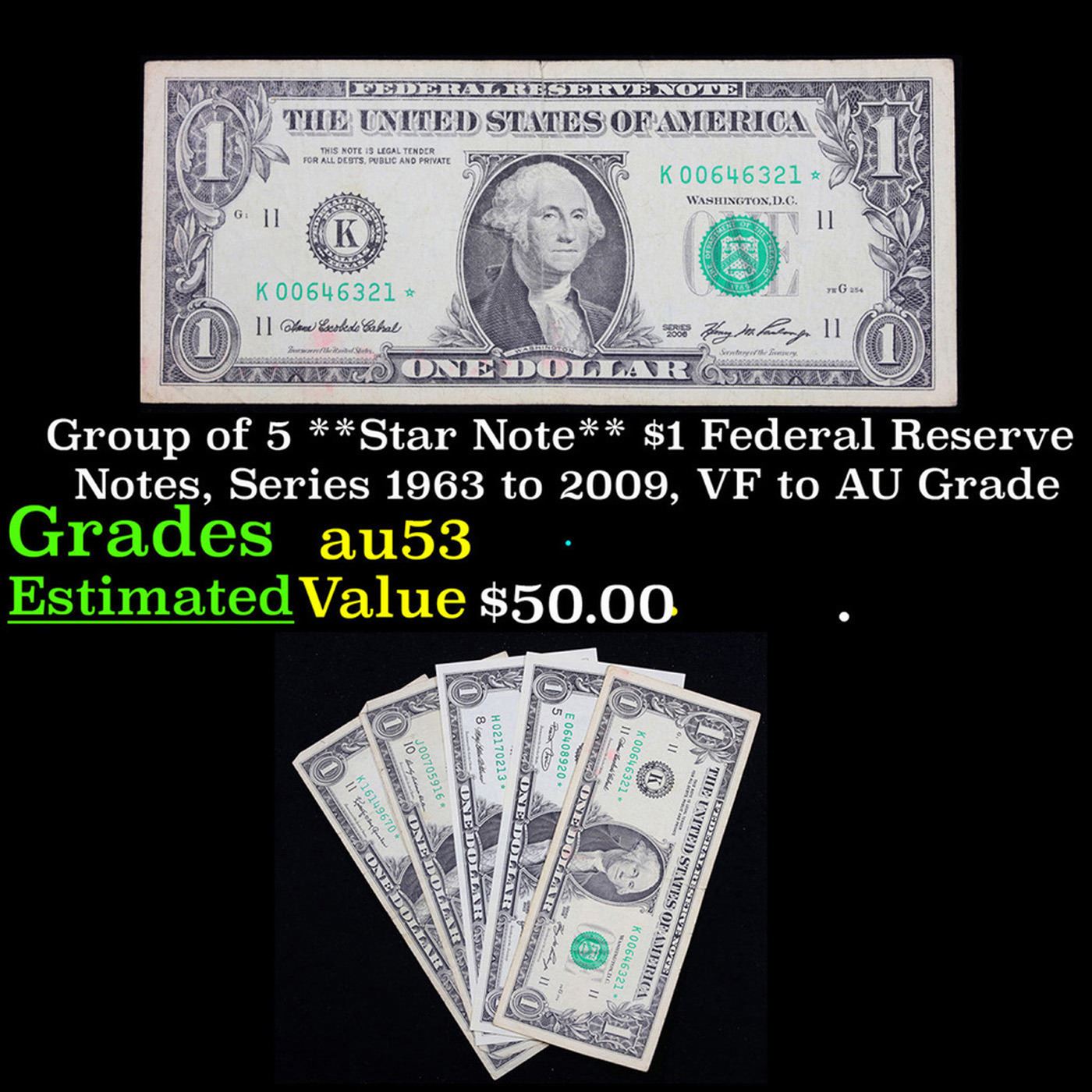 Group of 5 **Star Note** $1 Federal Reserve Notes, Series 1963 to 2009, VF to AU Grade Grades Select